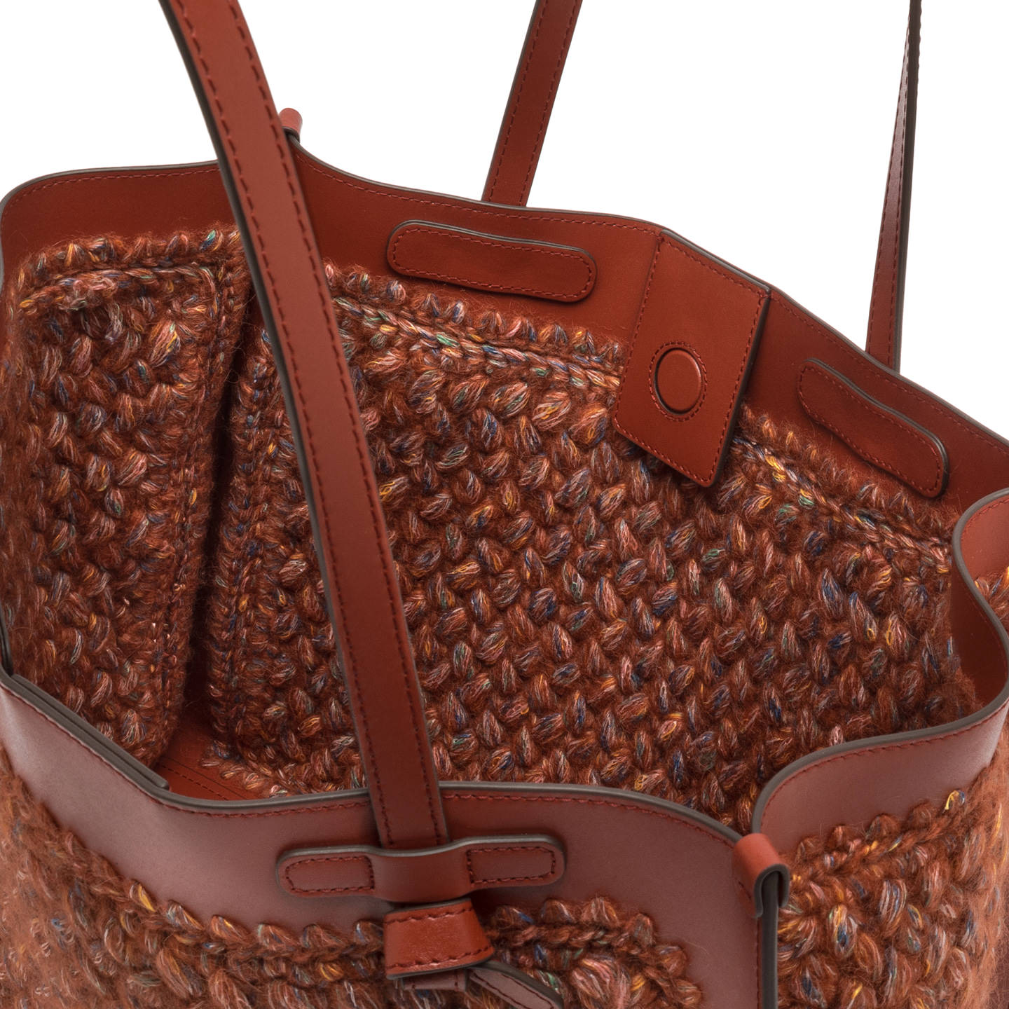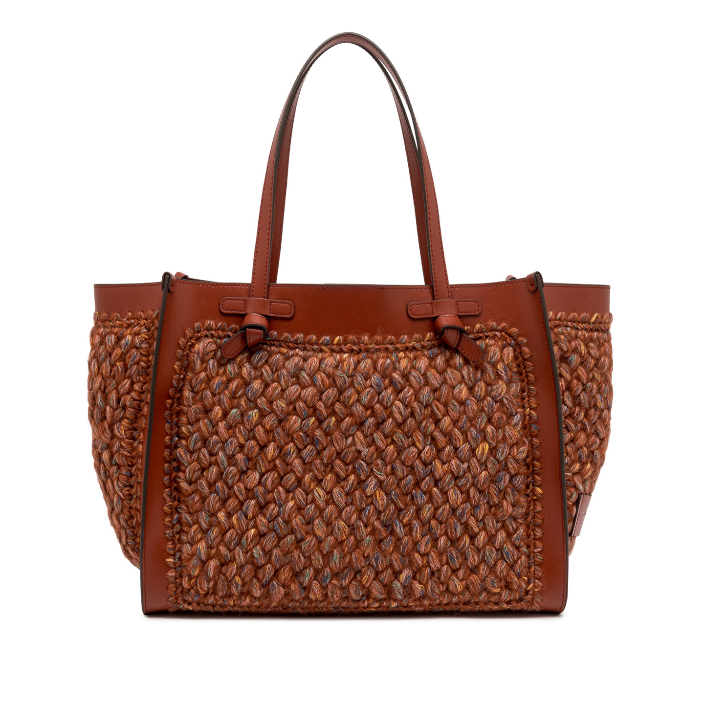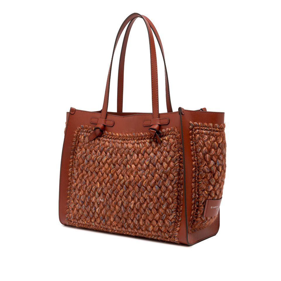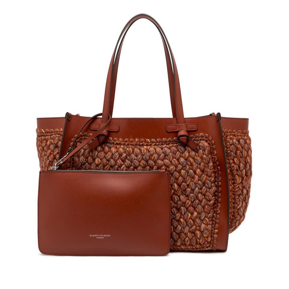 Marcella Gianni Chiarini shopping bag in wool print fabric. It comes with leather profiles, which give the bag a stylish look. Perfect for everyday use, it features leather handles and a convenient magnetic clasp closure. The leather clutch bag in the same color as the finishes make this bag unique in its kind. Size: 38x31x16 cm.