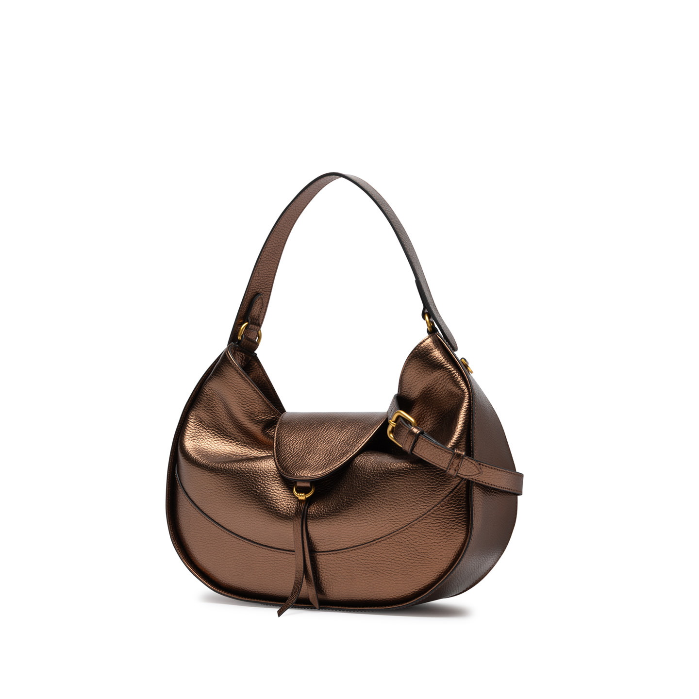 Edith is a new versatile and sophisticated bag, ideal for those seeking practicality without sacrificing style. Made of soft laminated leather, it features two compartments for optimal space management. Equipped with a leather flap closure, it includes an adjustable and removable shoulder strap for cross-body use and a comfortable top handle to carry it as a handbag. Size: 34x29x10 cm.