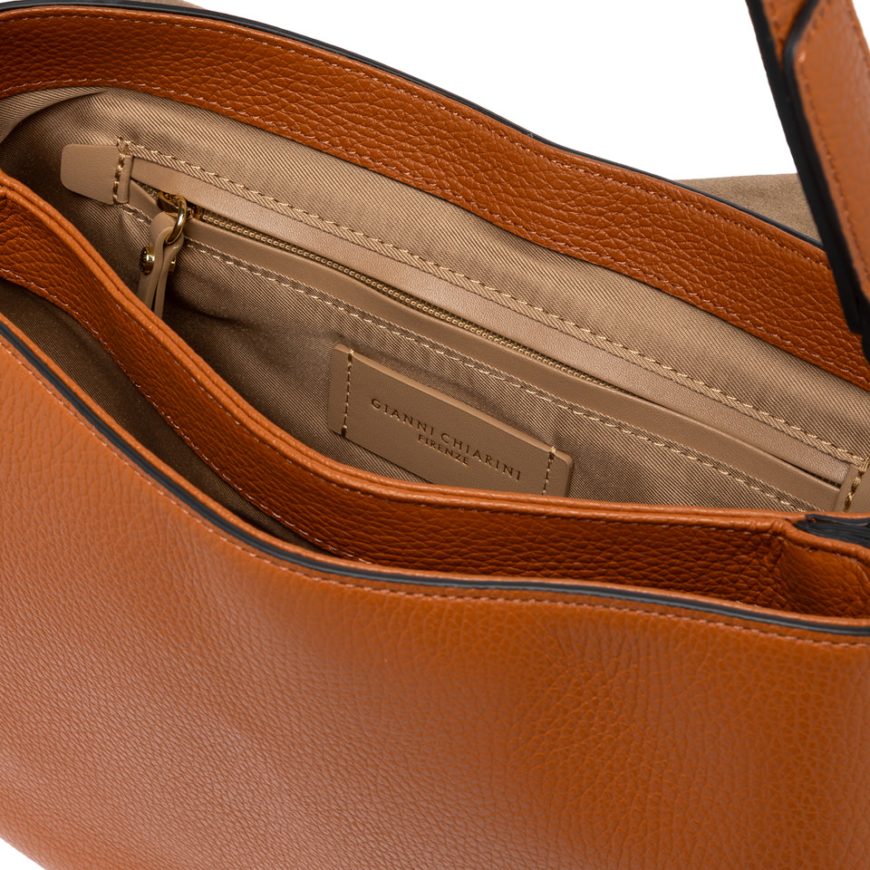 The iconic Helena Round by Gianni Chiarini Firenze, crafted from hammered leather, is distinguished by its structured design with a contemporary appeal. Versatile and functional, it features a strap for dual carrying options and offers impeccable organization with a double internal compartment and a hidden back pocket. Size: 33x24x9 cm.