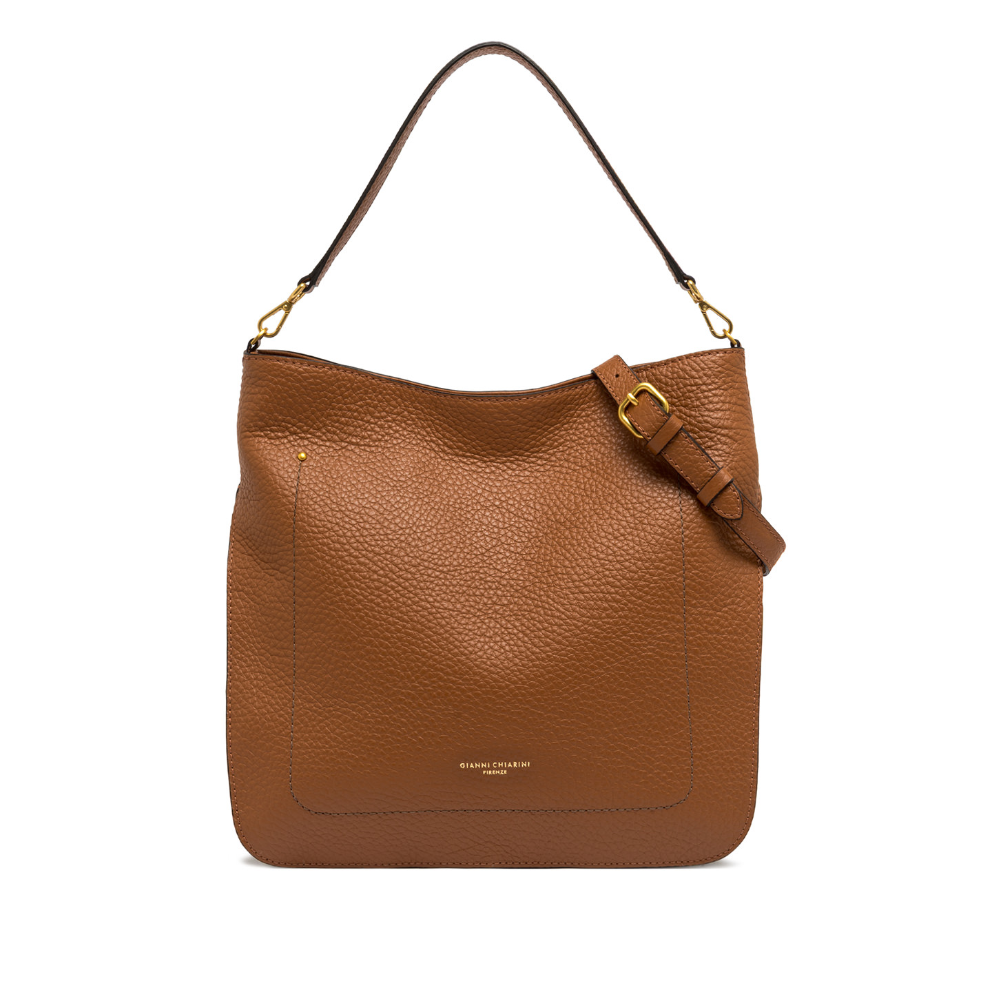 Olga is the a every-day bag by Gianni Chiarini Firenze, made in maxi-grain leather and perfect for any occasion. It features a zip closure, denim lining and a multi-purpose flat pocket inside. Equipped with a top handle and leather shoulder strap, both removable, it is practical and functional. Size: 34x32x12 cm.