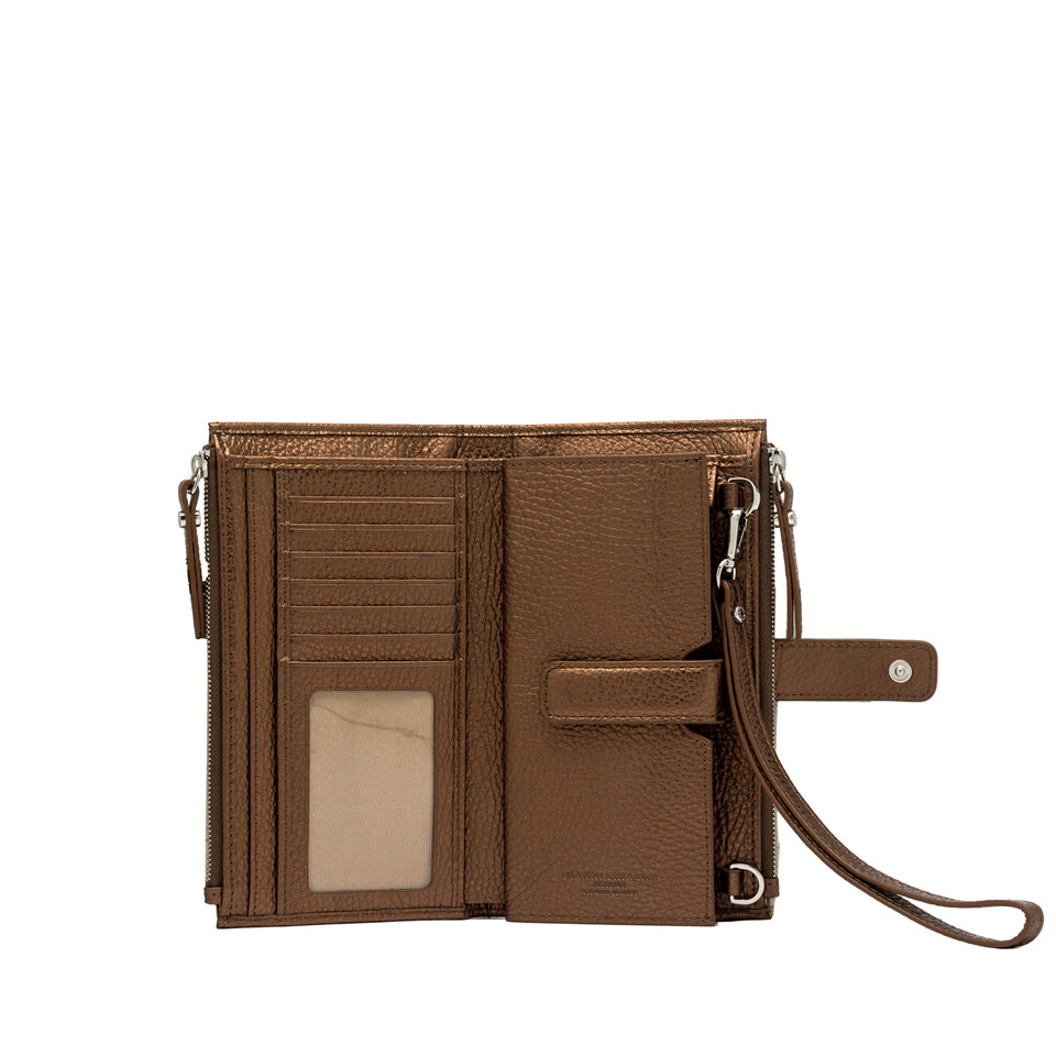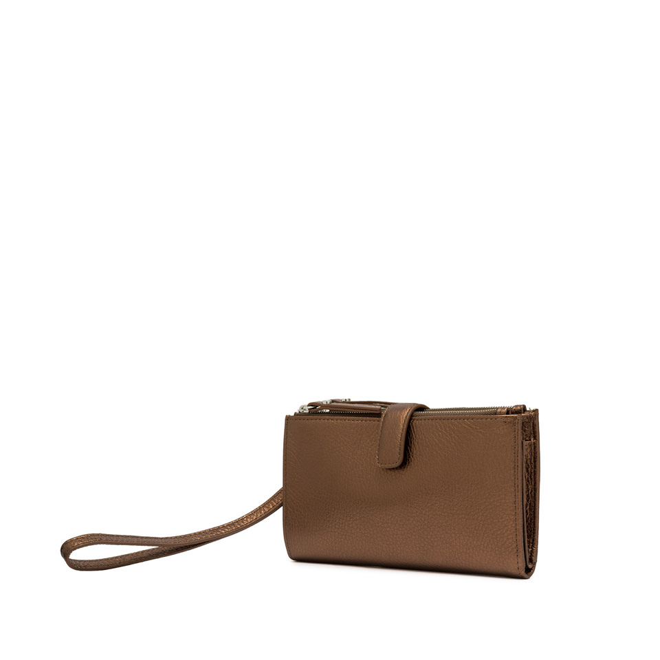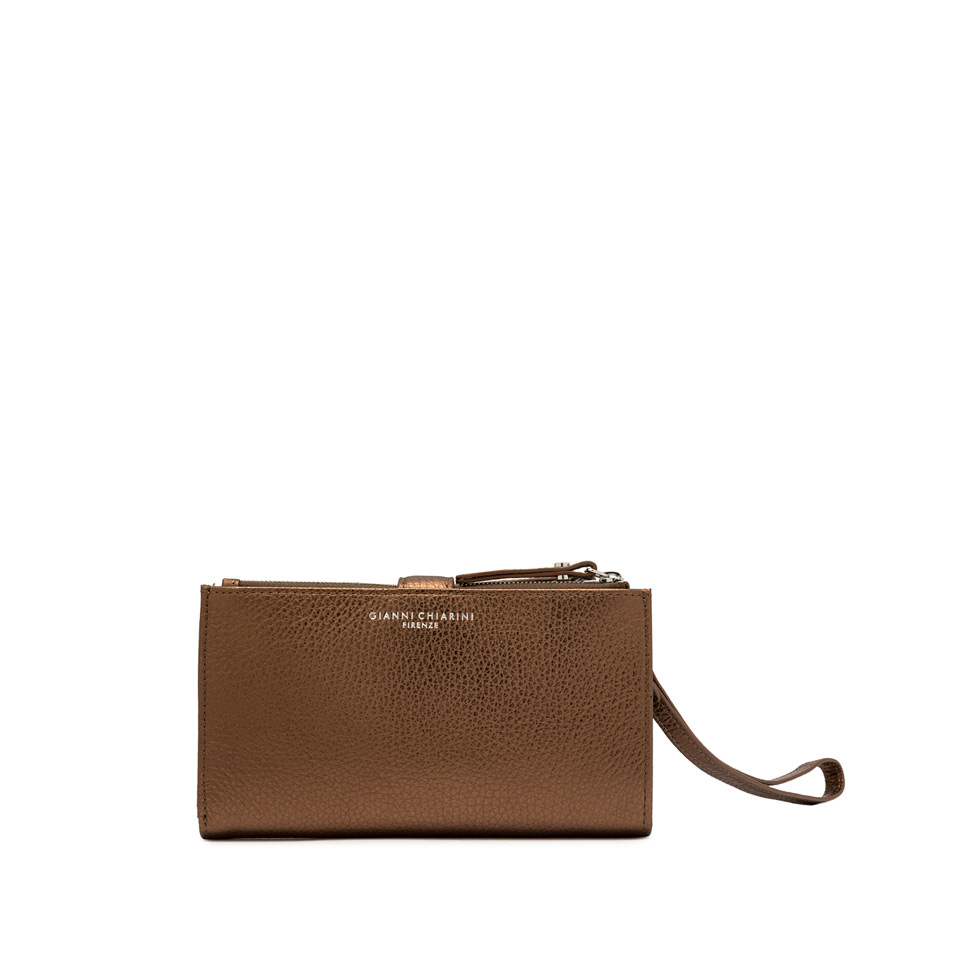 Gianni Chiarini Firenze wallet is made of soft laminated hammered leather, offering a mix of elegance and practicality. The zip closure and color matching zip puller ensure a refined look, while the snap button placket adds security and style. Equipped with multi-purpose flat pockets, a removable strap to wear it on the wrist and a thin adjustable shoulder strap, which allows it to be worn also over the shoulder, making it perfect for a versatile and functional look. Size: 18.5x10x3 cm.