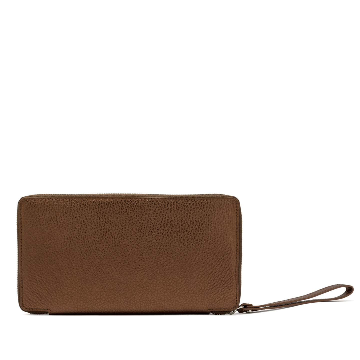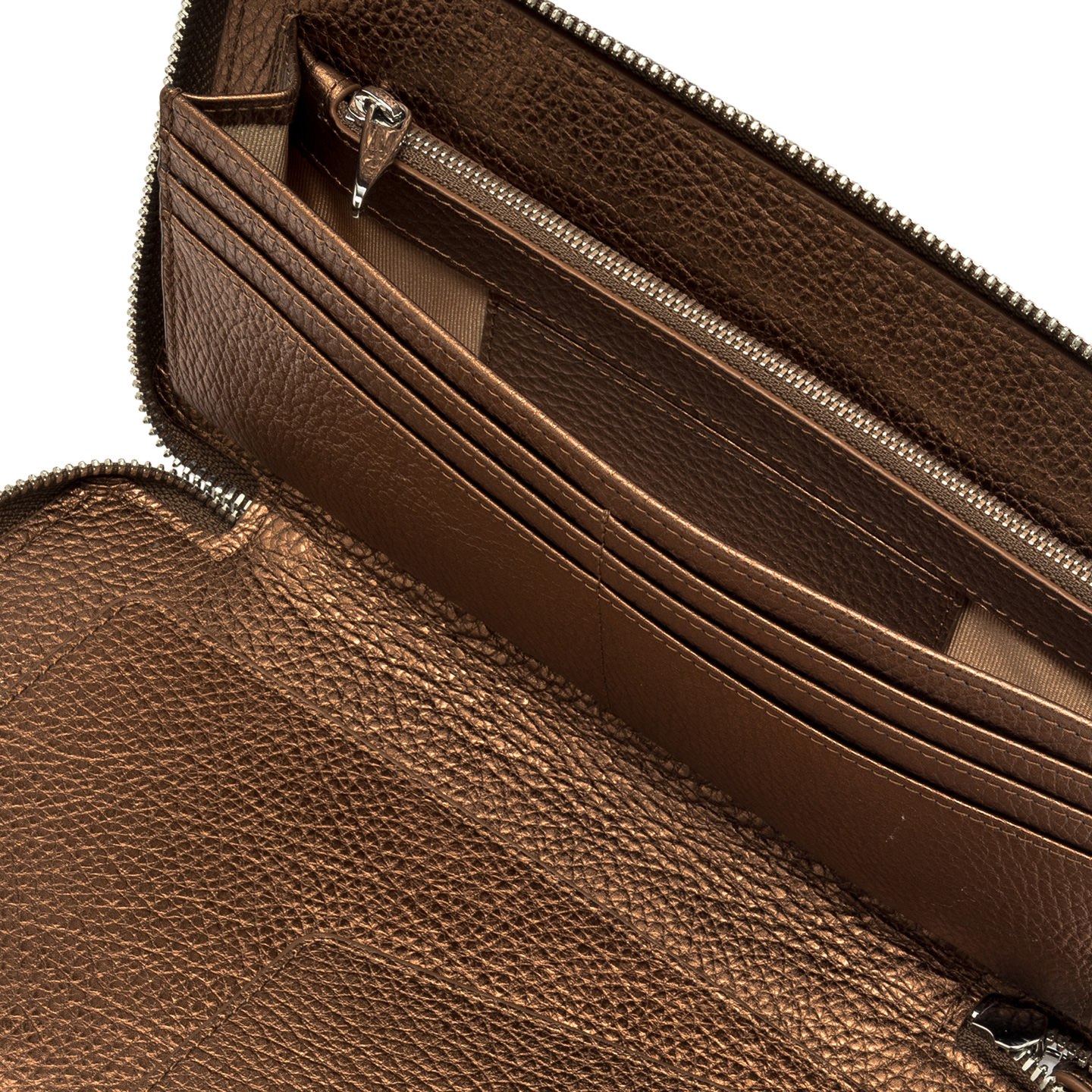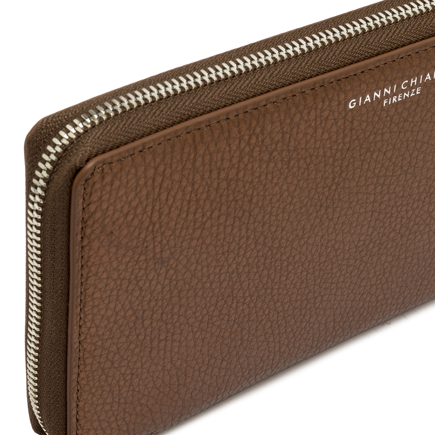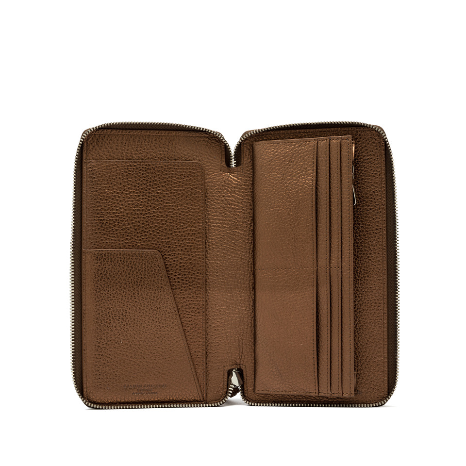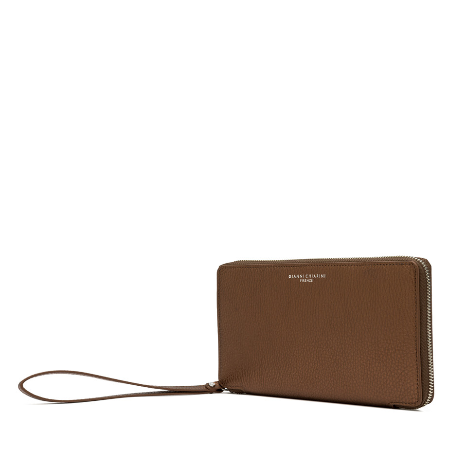 This wallet by Gianni Chiarini Firenze is made of laminated hammered leather. Zip closure with a leather lanyard at the zip-puller to wear it at the wrist. Multiple compartments and credit card holders at interior. Size: 23x12.5x2 cm.