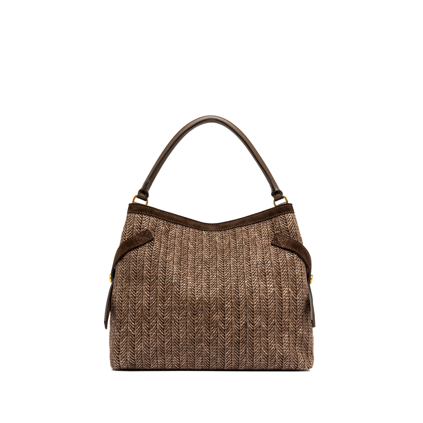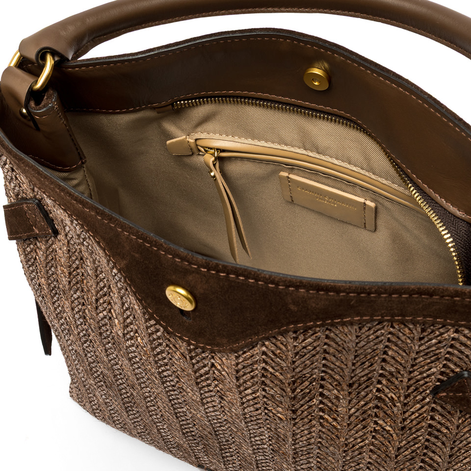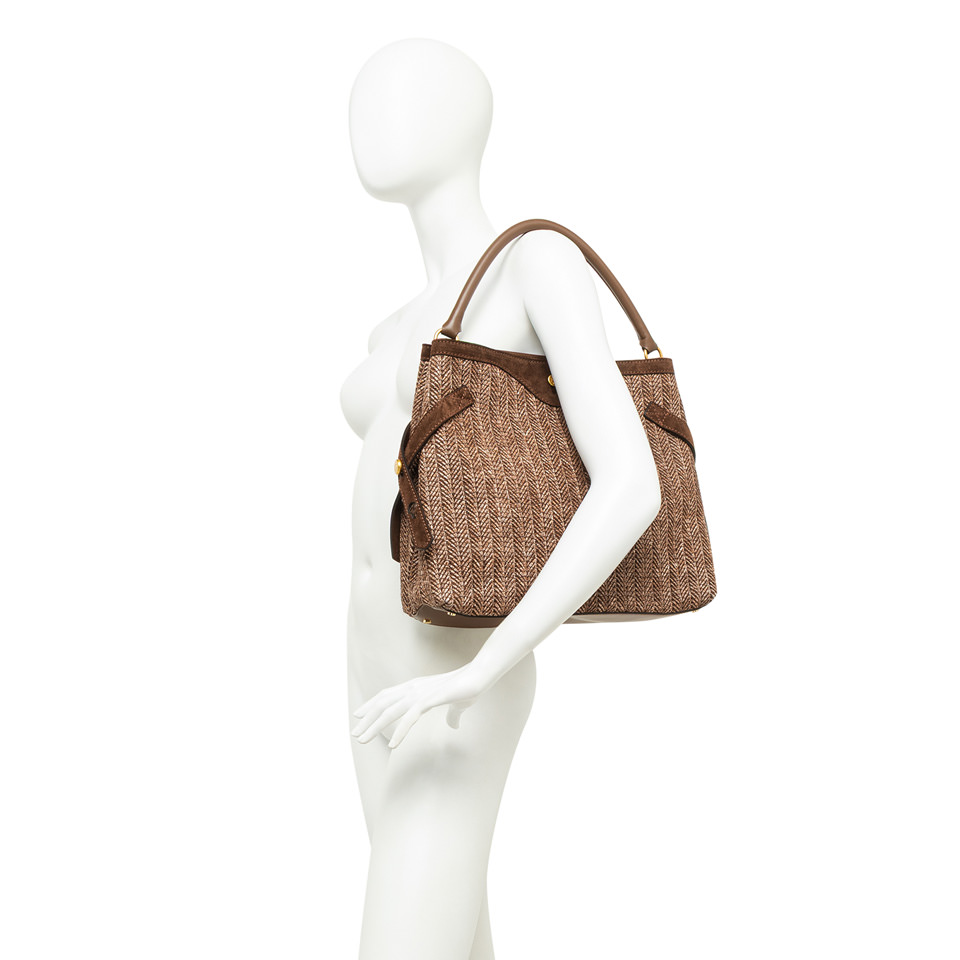 Claudette è una borsa elegante e versatile, realizzata in paglia intrecciata evoca un fascino rustico chic, con profili in pelle scamosciata. Dettagli in metallo e gemelli logati aggiungono un tocco distintivo, mentre i lacci laterali creano movimento nella silhouette. Offre doppia portabilità: a spalla con il manico in pelle e crossbody con tracolla regolabile. Dimensioni: 35x30x13 cm.