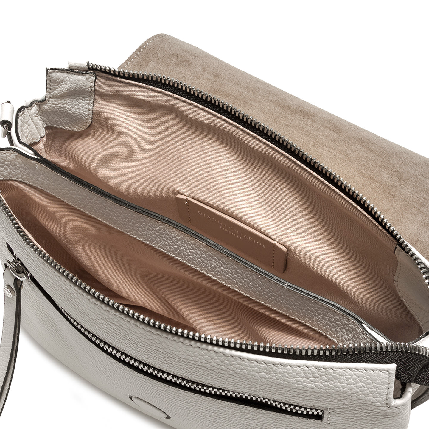 Da portare a mano o con la sottile tracolla in pelle, la borsa Three by Gianni Chiarini Firenze è realizzata in pregiata pelle martellata. Giovane e divertente, presenta un design innovativo che si distingue per le zip a contrasto nella parte superiore. Perfetta per outfit casual, ma anche per serate eleganti. Dimensioni: 25x22x5 cm.