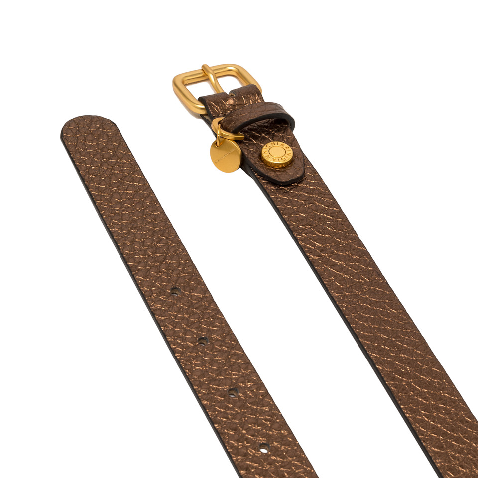 Cintura piatta dalle linee essenziali e minimaliste, perfetta per completare sia look casual che eleganti. Realizzata in pelle a grana maxi, si caratterizza per la fibbia logata, arricchita da un piccolo pendente decorativo.