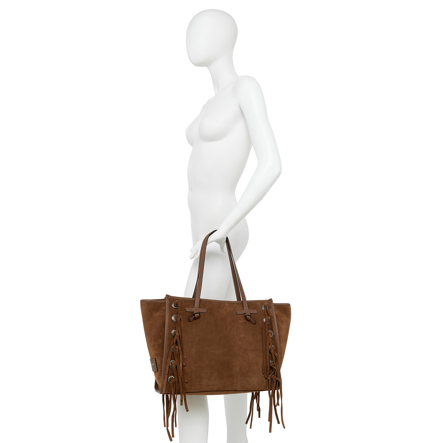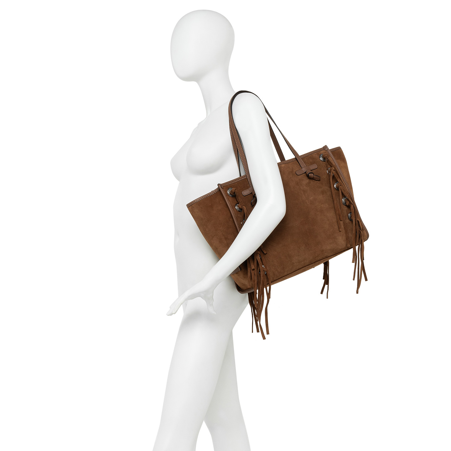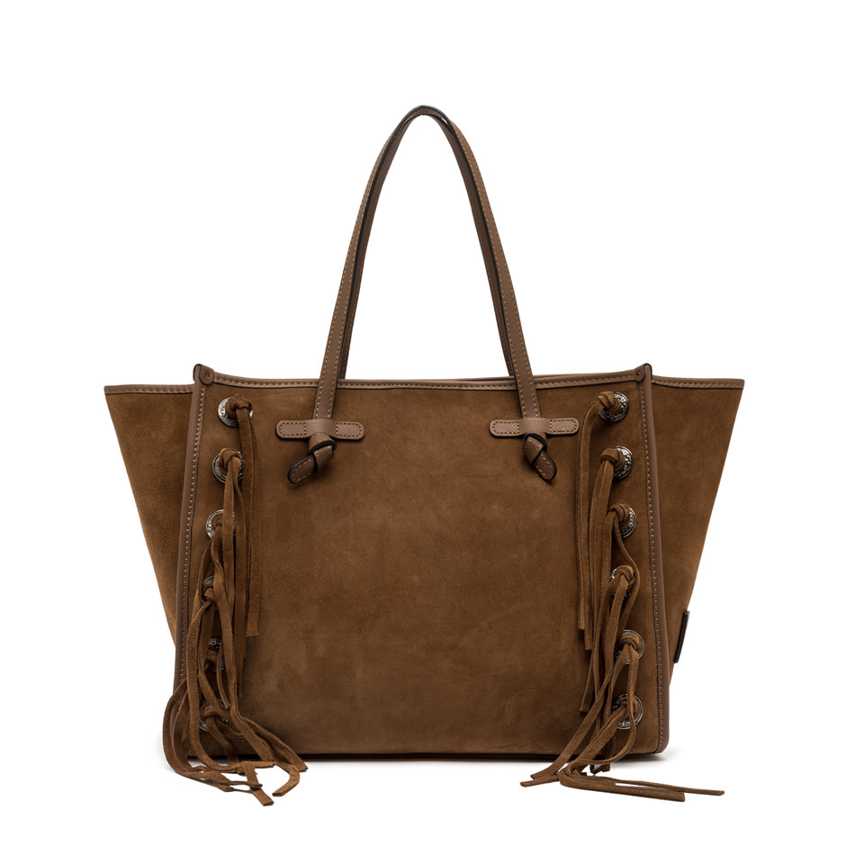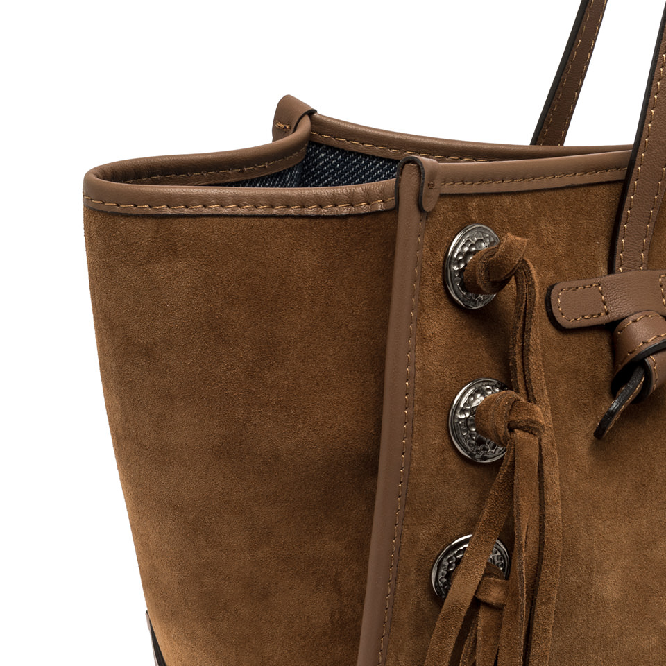 La shopping Marcella by Gianni Chiarini Firenze è realizzata in pelle scamosciata dal tocco morbido e setoso, arricchita da frange in pelle in tono e da borchie. Dotata di manici in pelle e di una comoda chiusura tramite magnete, è ideale per la vita quotidiana. Il design è arricchito da profili in pelle che donano alla borsa un tocco di eleganza. Dimensioni: 38x31x16 cm.