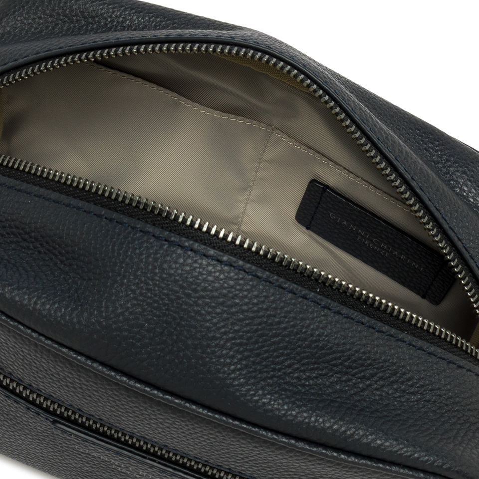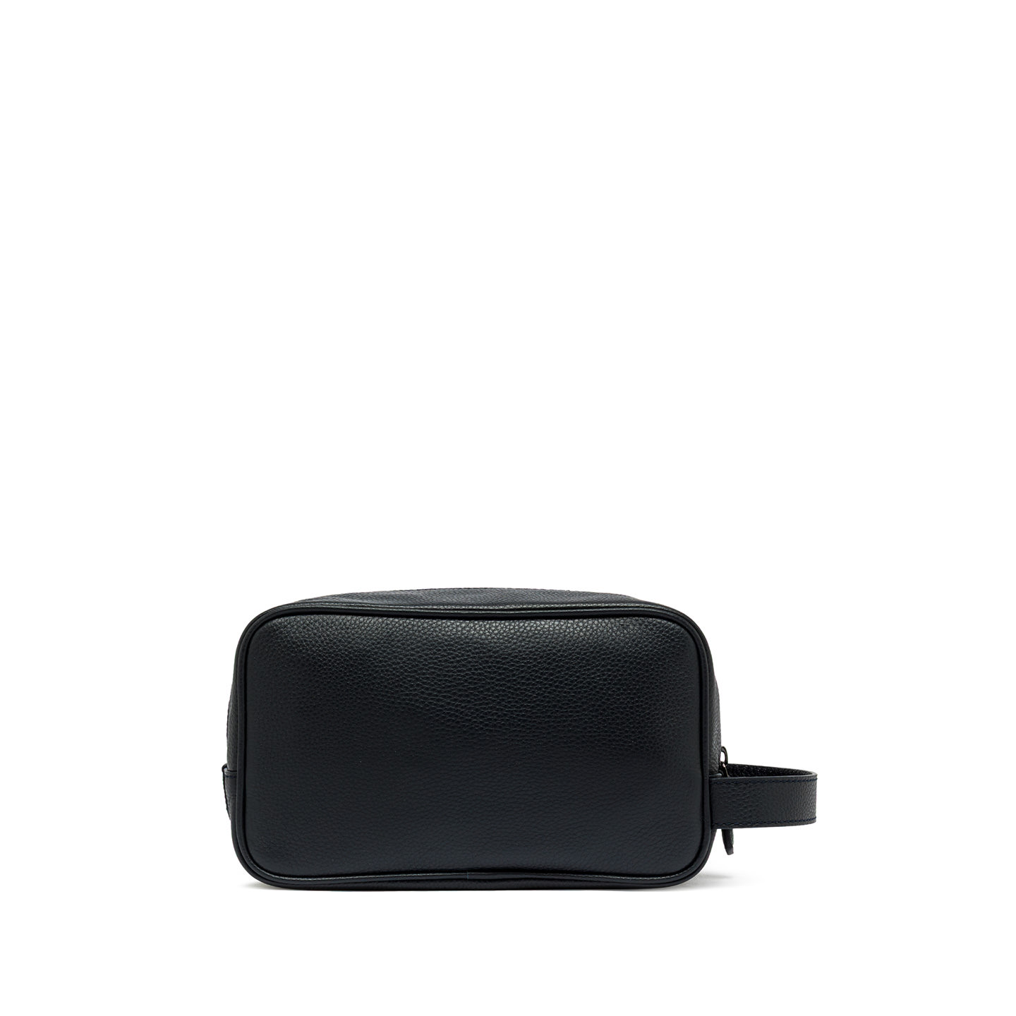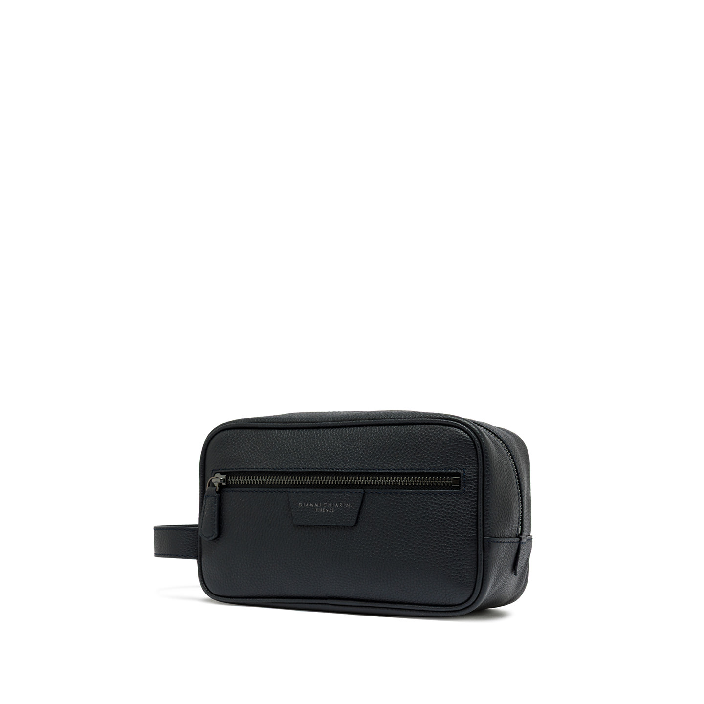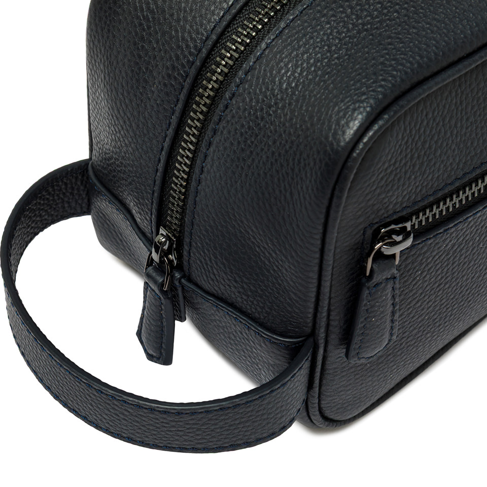 Pratico e capiente, il nuovo beauty case è estremamente versatile. Ideale per un uomo che non vuole rinunciare a uno stile senza tempo. Realizzato in pelle martellata, questo accessorio dal design minimale presenta uno scomparto principale con zip e una comoda tasca frontale. Il manico superiore ne facilita il trasporto, per una portabilità pratica ed elegante. Dimensioni: 23x14x11 cm.