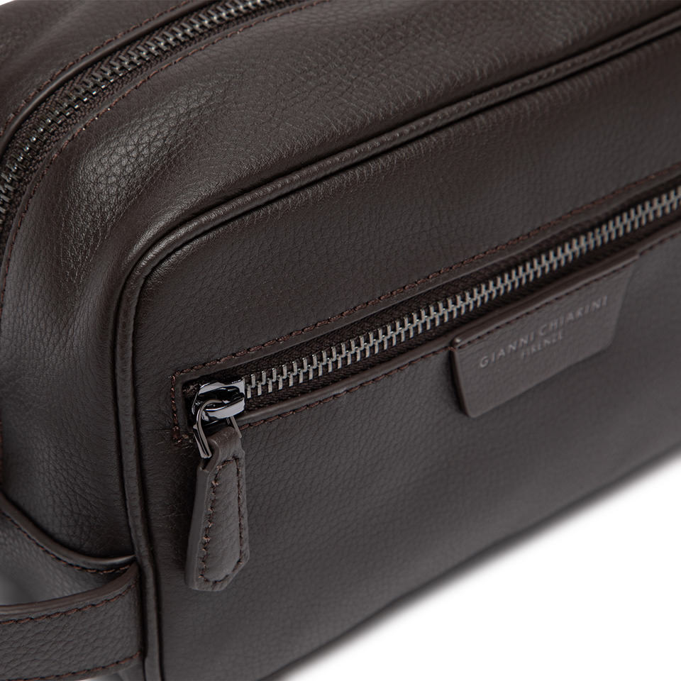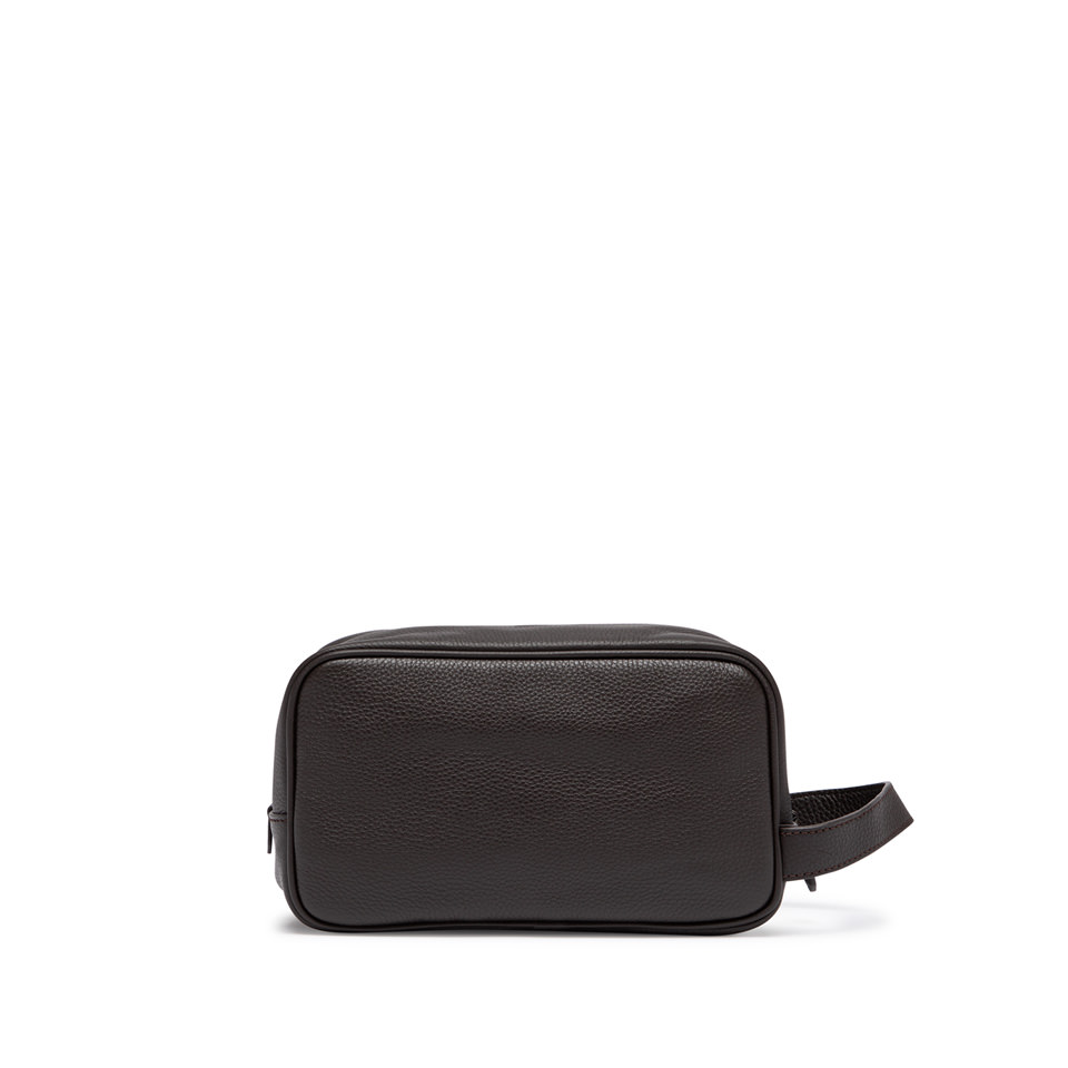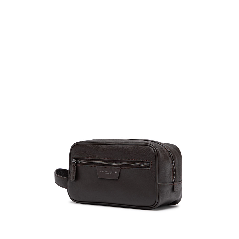 Pratico e capiente, il nuovo beauty case è estremamente versatile. Ideale per un uomo che non vuole rinunciare a uno stile senza tempo. Realizzato in pelle martellata, questo accessorio dal design minimale presenta uno scomparto principale con zip e una comoda tasca frontale. Il manico superiore ne facilita il trasporto, per una portabilità pratica ed elegante. Dimensioni: 23x14x11 cm.