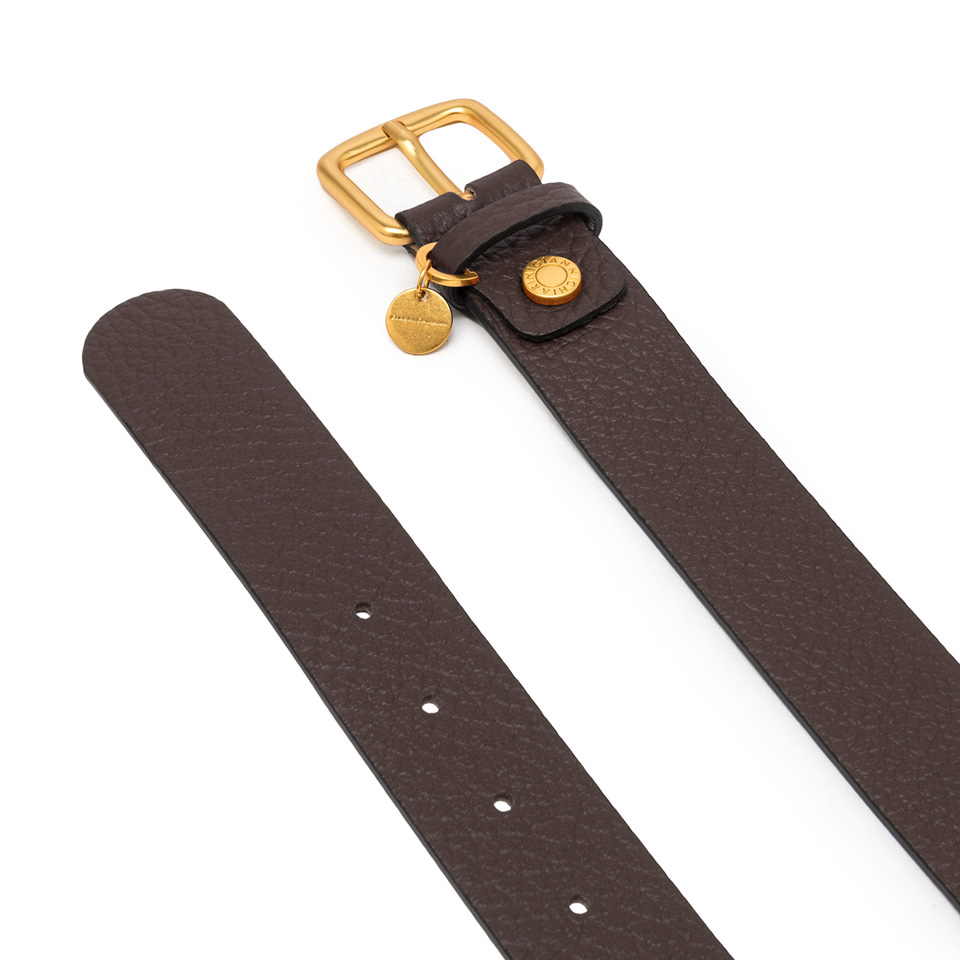 Flacher Gürtel mit essentiellen und raffinierten Linien, ideal zur Vervollständigung von lässigen und eleganten Looks. Er ist aus Leder mit grober Narbung gefertigt und mit einer Schnalle mit Logoprägung und einem zarten, dekorativen Logo-Anhänger verziert.