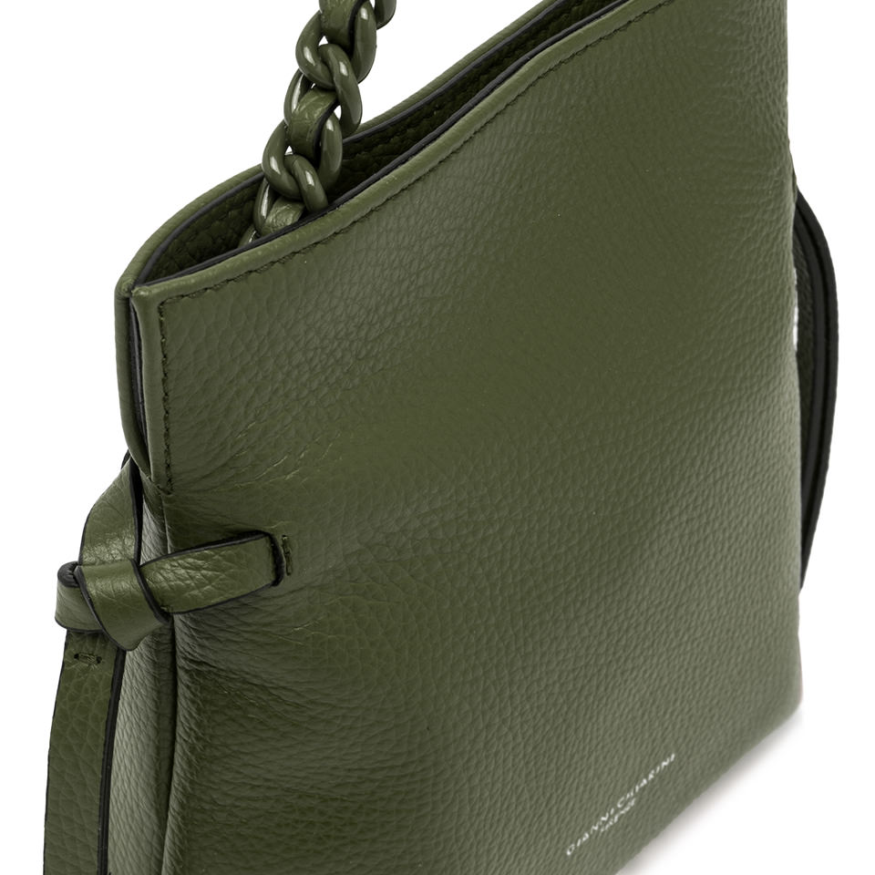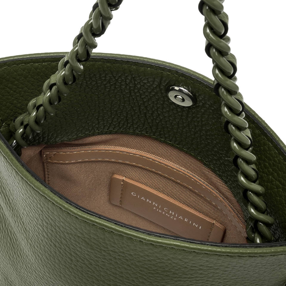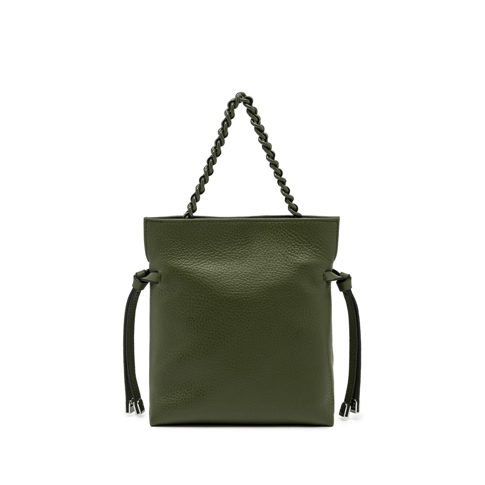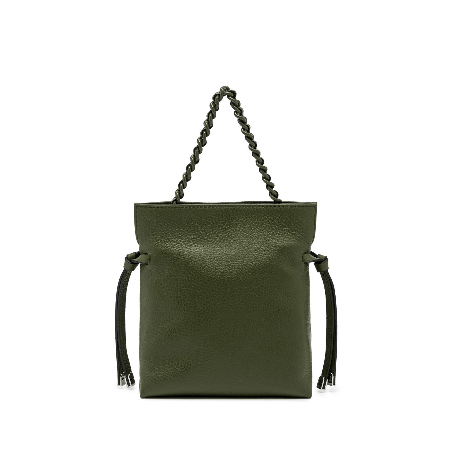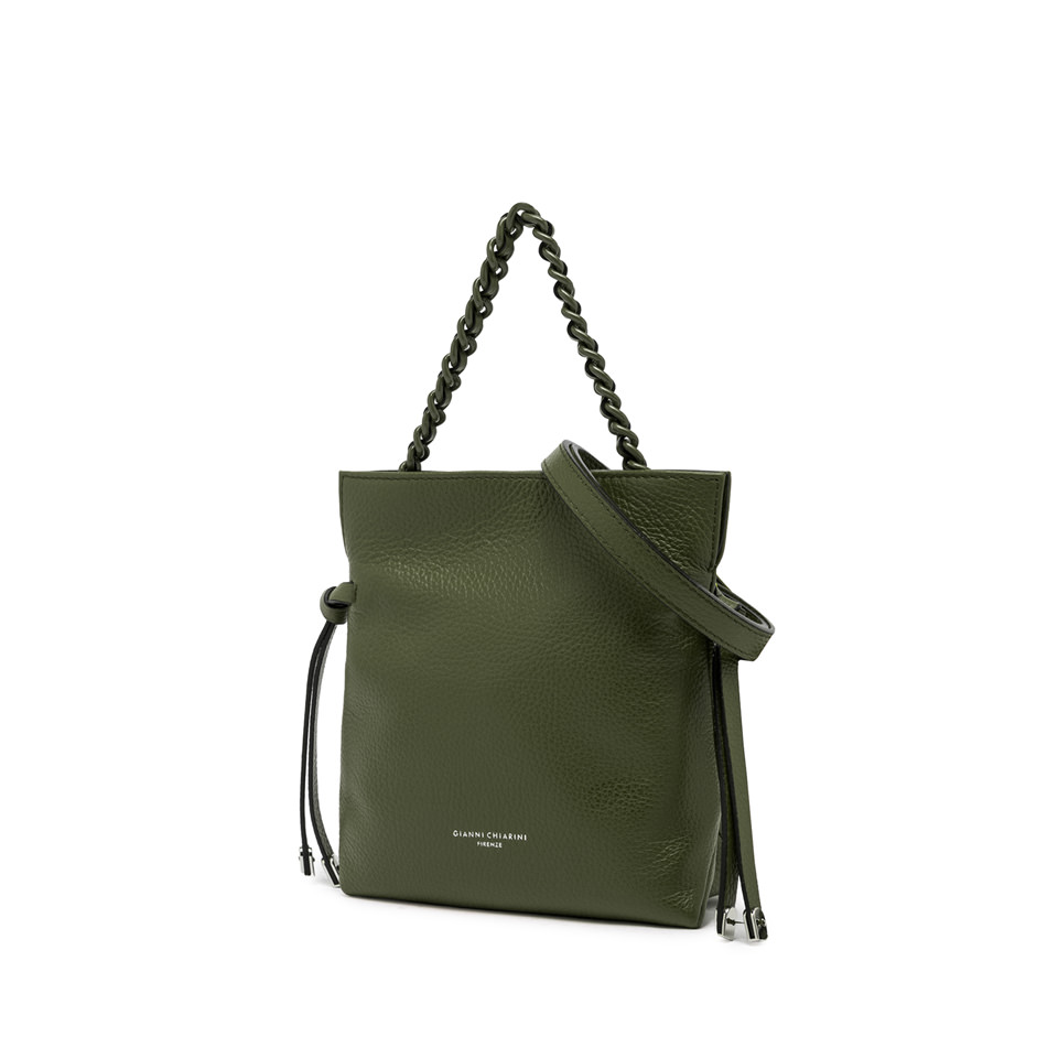Brina by Gianni Chiarini Firenze ist eine Tasche aus genarbtem Leder mit minimalistischen und kantigen Linien. Details in Form von Knoten und Metallelementen sorgen für einen besonderen Akzent. Vervollständigt wird sie durch einen geflochtenen Henkel und einen verstellbaren und abnehmbaren Trageriemen, mit dem sie auch als Crossbody getragen werden kann. Maße: 16x18x8 cm.