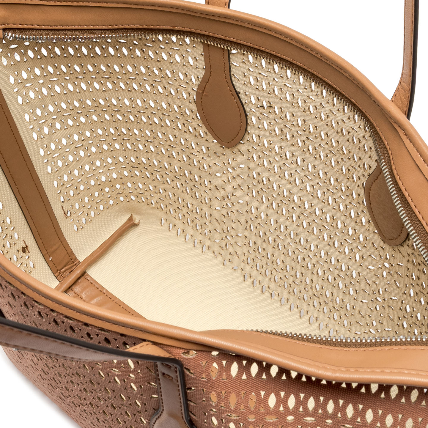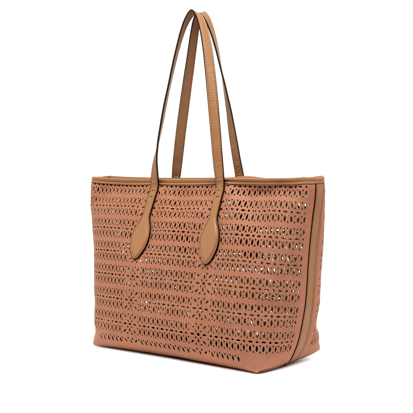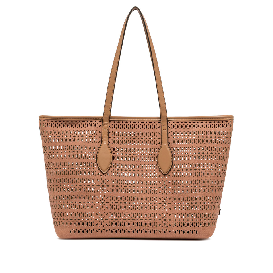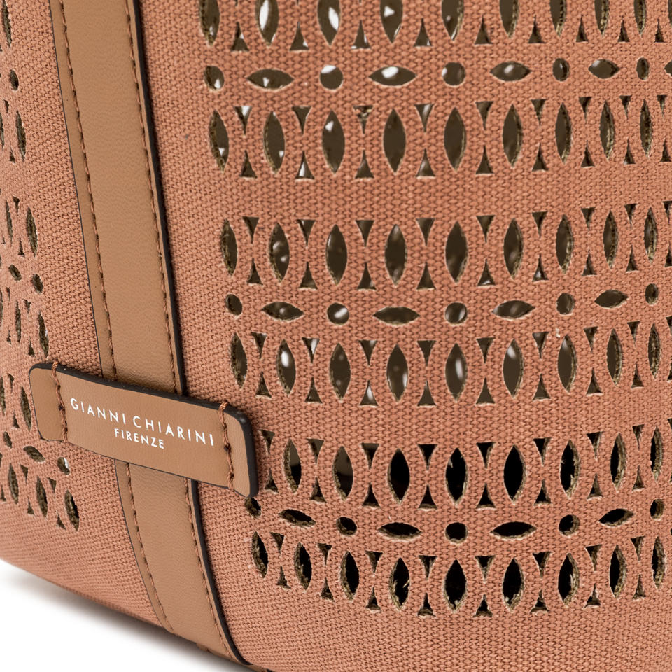 Die Shopper-Bag Mashup von Gianni Chiarini Firenze ist aus lasergeschnittenem Canvas gefertigt, wodurch ein raffiniertes Lochmuster entsteht, das sie einzigartig und zeitlos macht. Versehen mit zwei Henkeln aus Leder und einem Verschluss mit Magnetknopf, ist sie ideal, um einen lässigen Alltagslook zu vervollständigen. Maße: 35x28x14 cm.