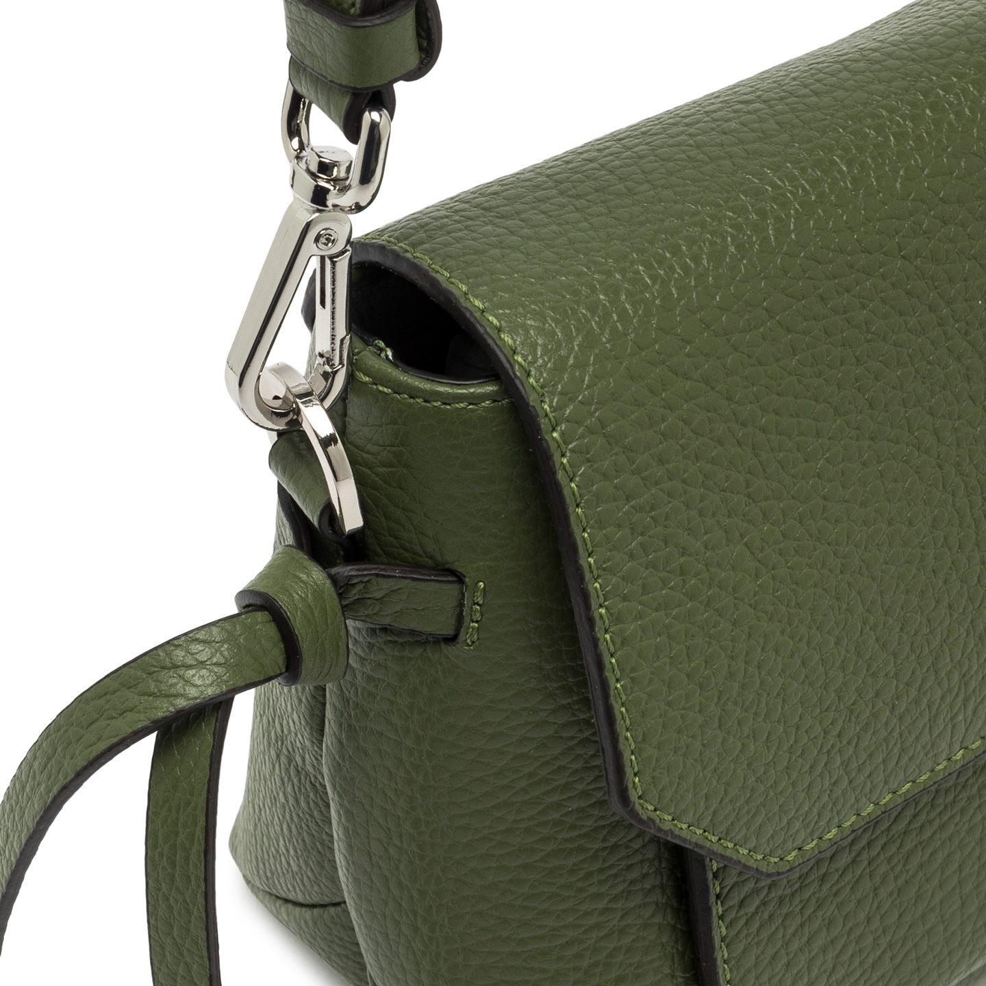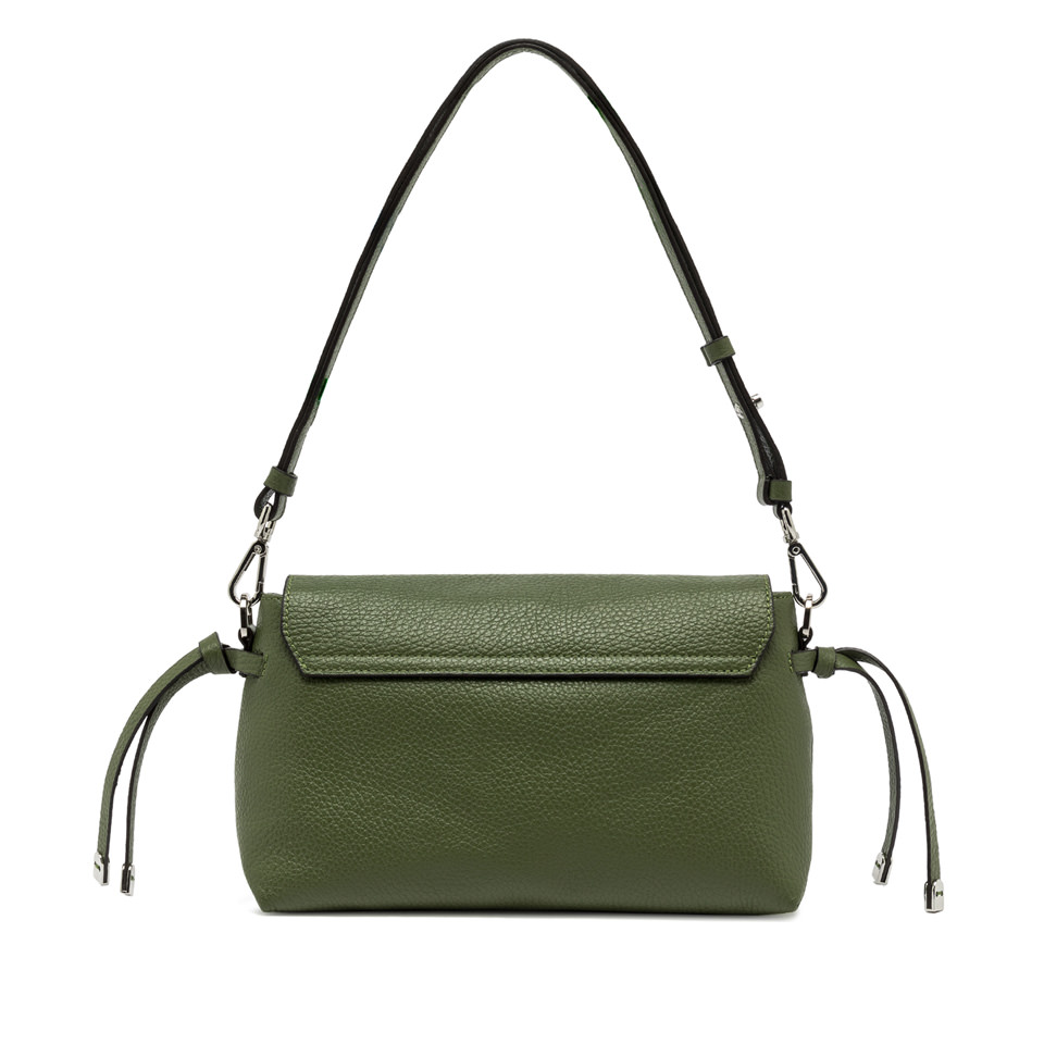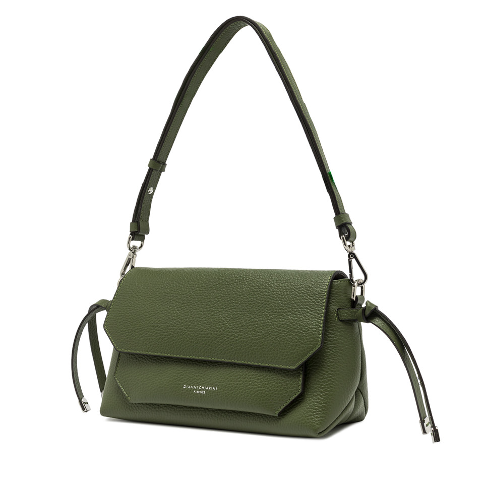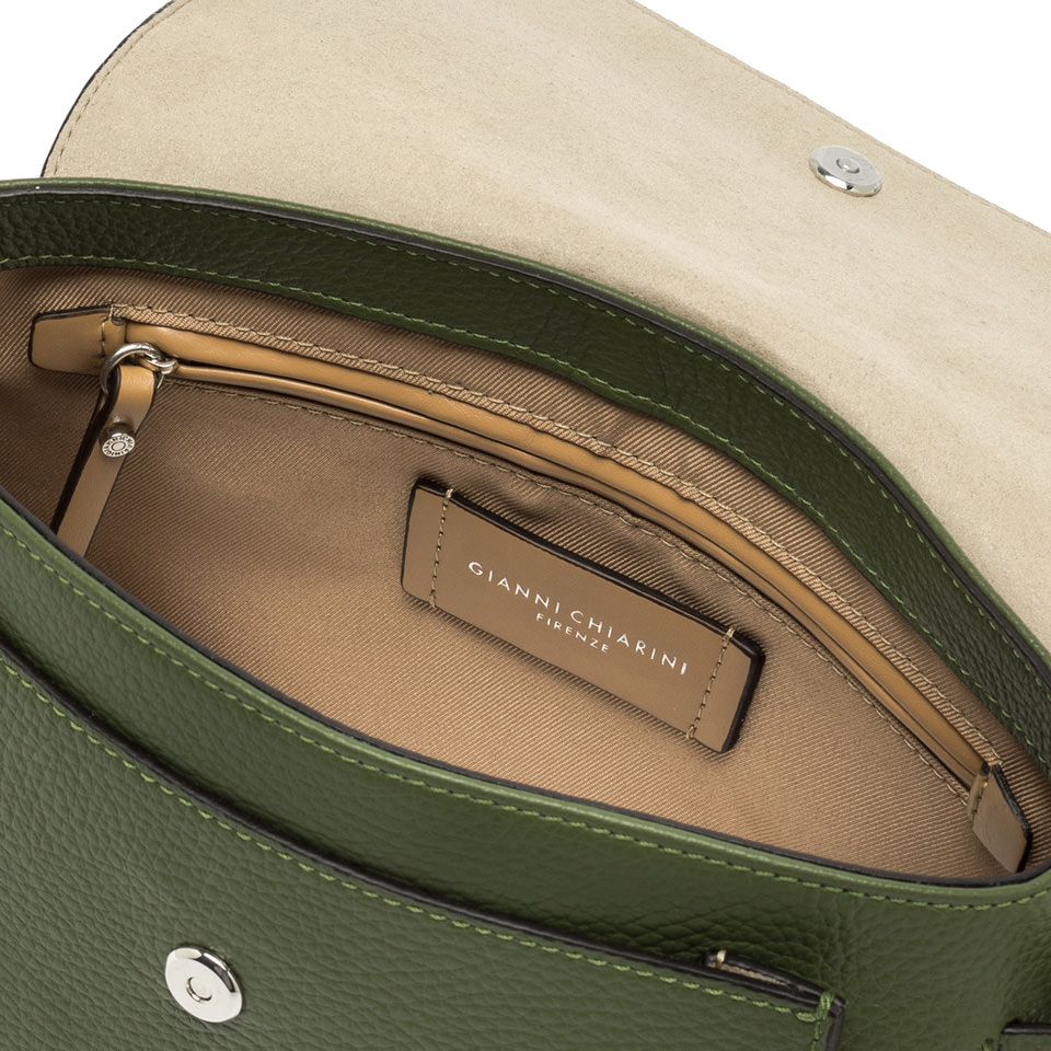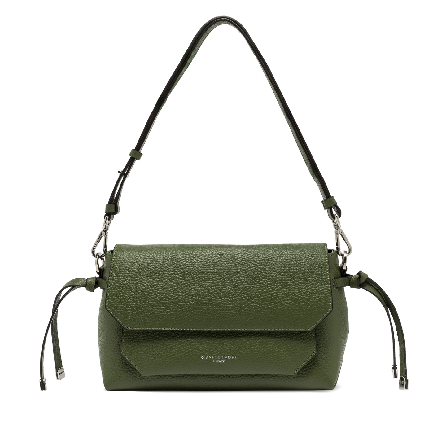 Brina by Gianni Chiarini Firenze ist eine Tasche aus genarbtem Leder mit minimalistischen und kantigen Linien. Details in Form von Knoten und Metallelementen sorgen für einen besonderen Akzent. Sie besitzt einen Lederhenkel zum bequemen Tragen über der Schulter und einen verstellbaren, abnehmbaren Trageriemen, der sich ideal für eine Crossbody-Variante eignet. Der obere Verschluss mit Reißverschluss bietet Sicherheit und Komfort. Maße: 25x17,5x8 cm.