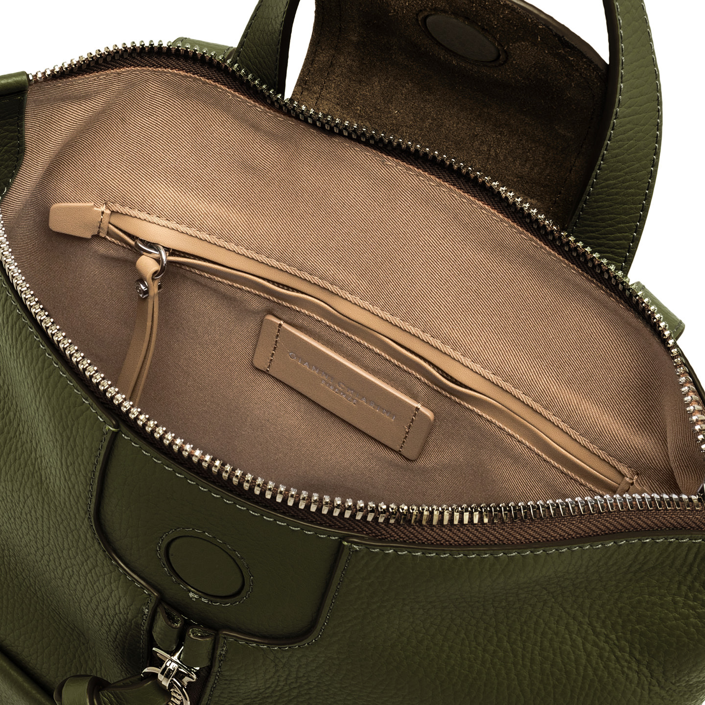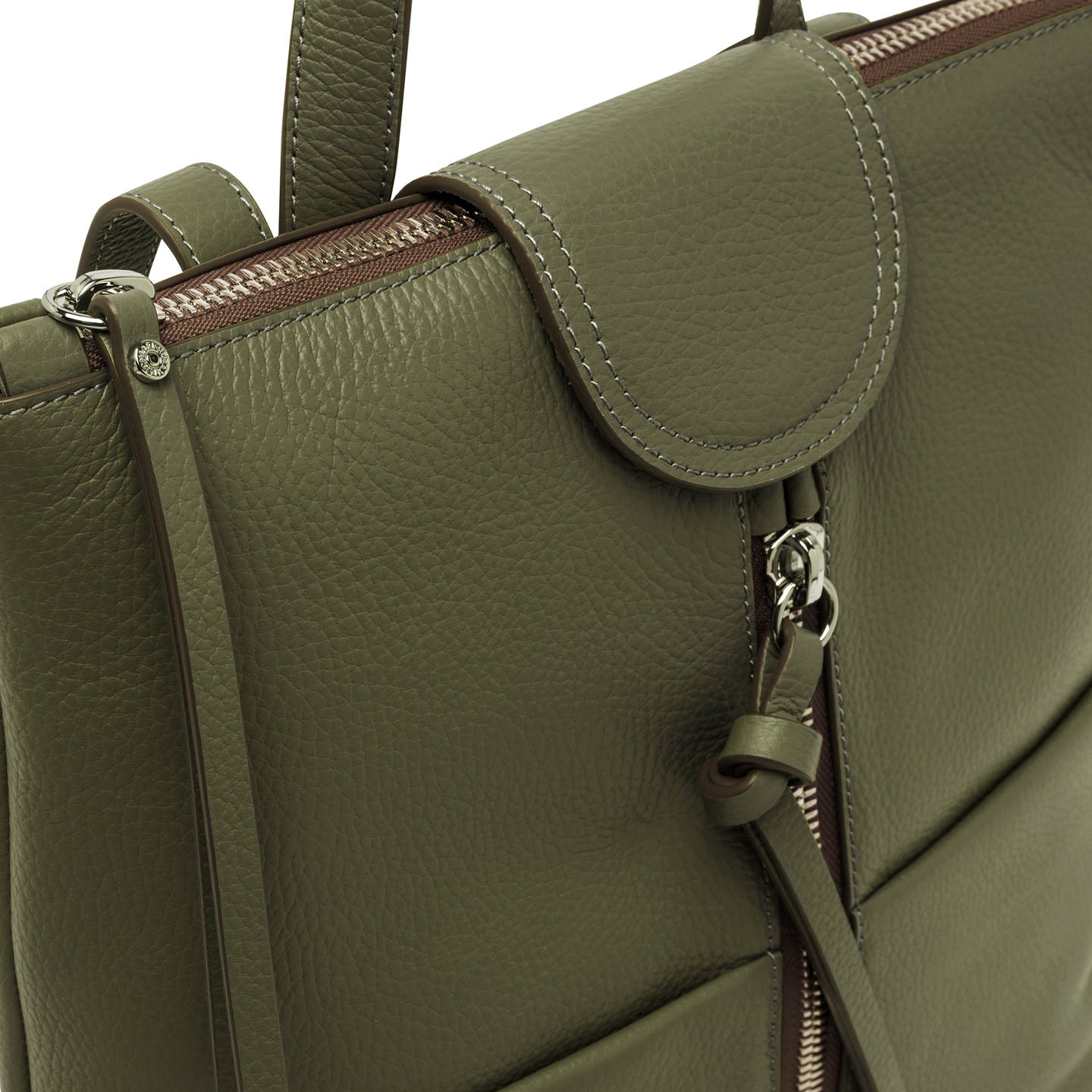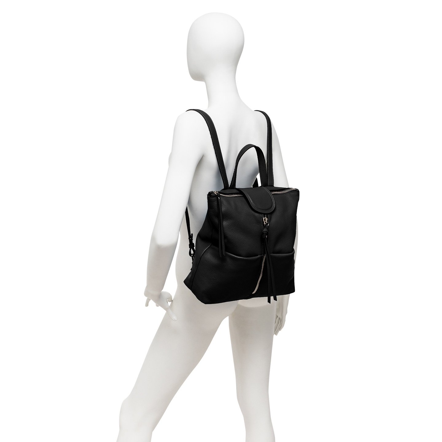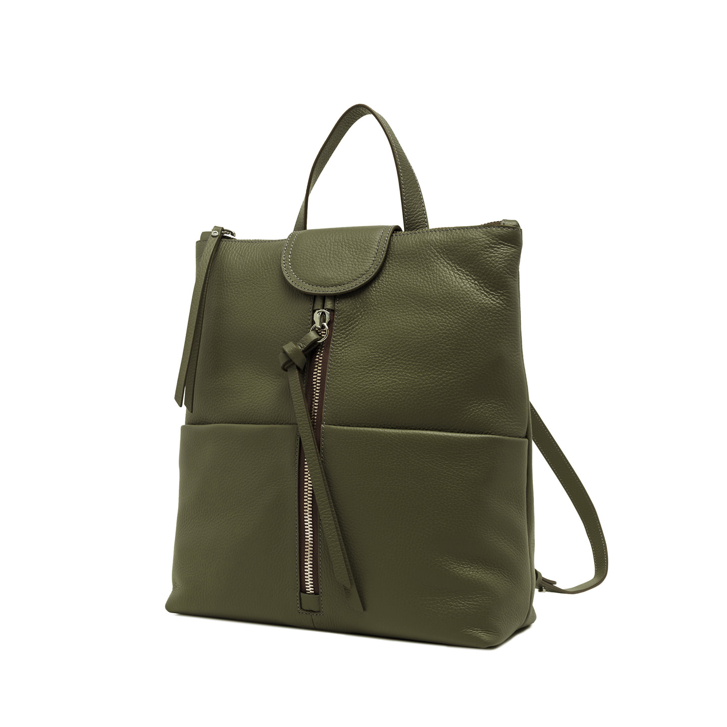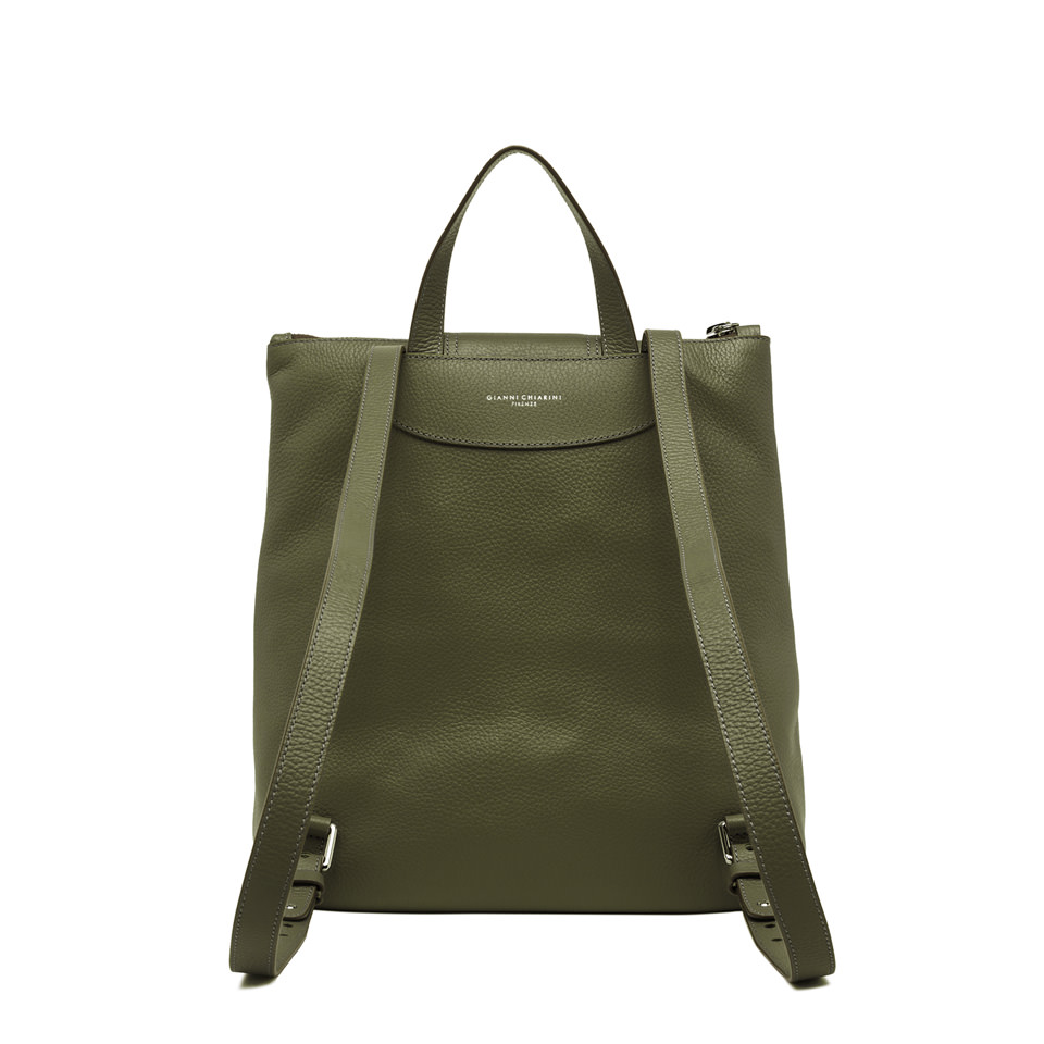 Giada Backpack by Gianni Chiarini Firenze is made of hammered leather. With its maxi pockets at front and top zip closure, this is a practical and ideal accessory for daily use. Equipped with handle and adjustable shoulder straps, zip pocket and multi-purpose flat pockets at interior. Size: 31x33x12 cm.