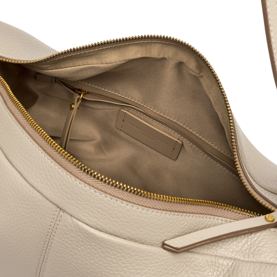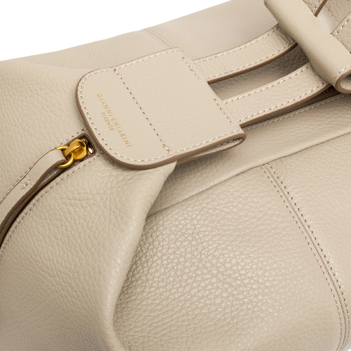 Guia is the new line by Gianni Chiarini Firenze, practical and essential, characterized by soft lines. Ideal for adding a sporty touch to everyday casual looks. Crafted in hammered leather and embellished with metallic elements that add a touch of brightness, it features a spacious compartment, two zip openings, and two adjustable shoulder straps. Size: 24x27x15 cm.