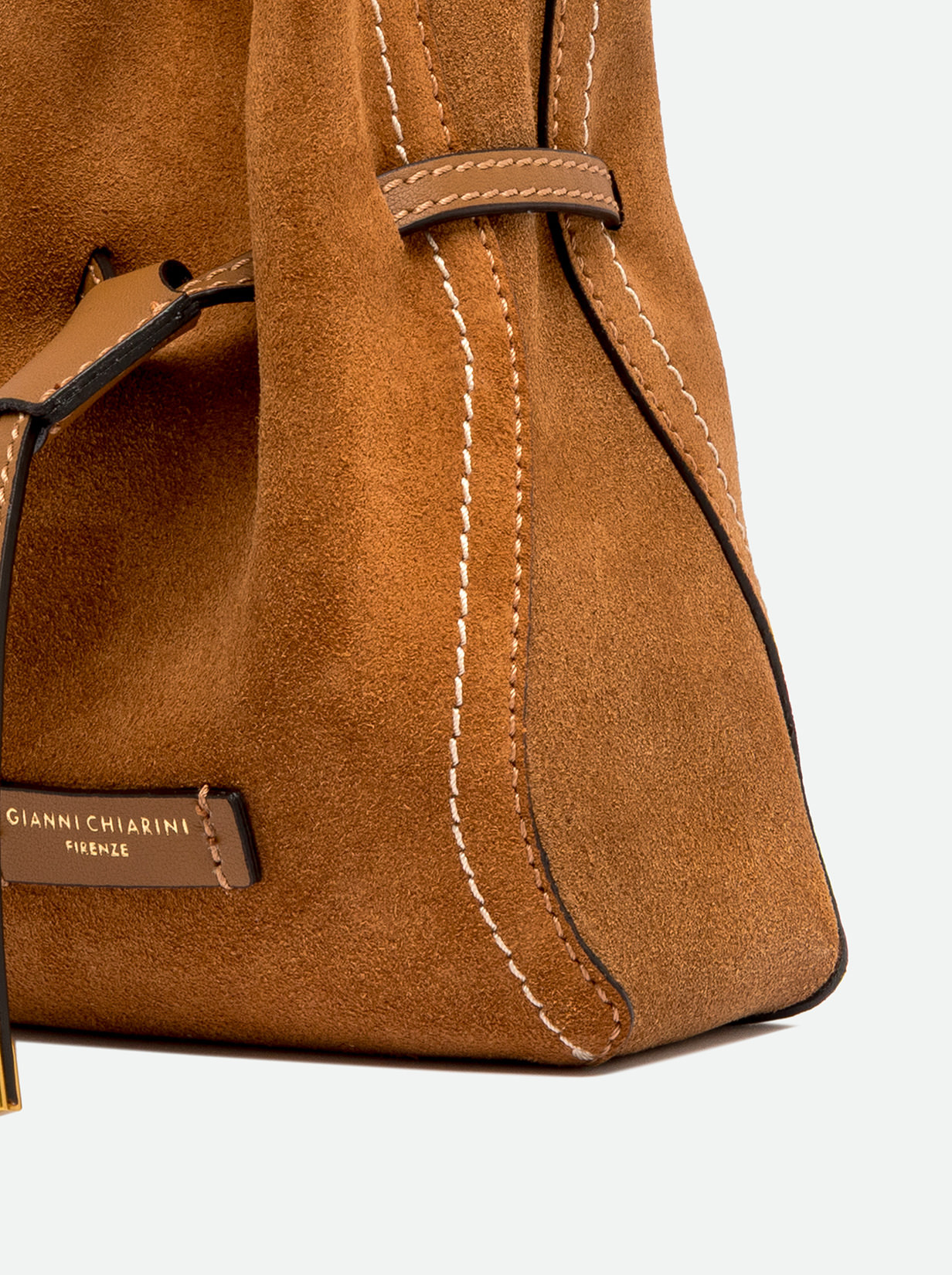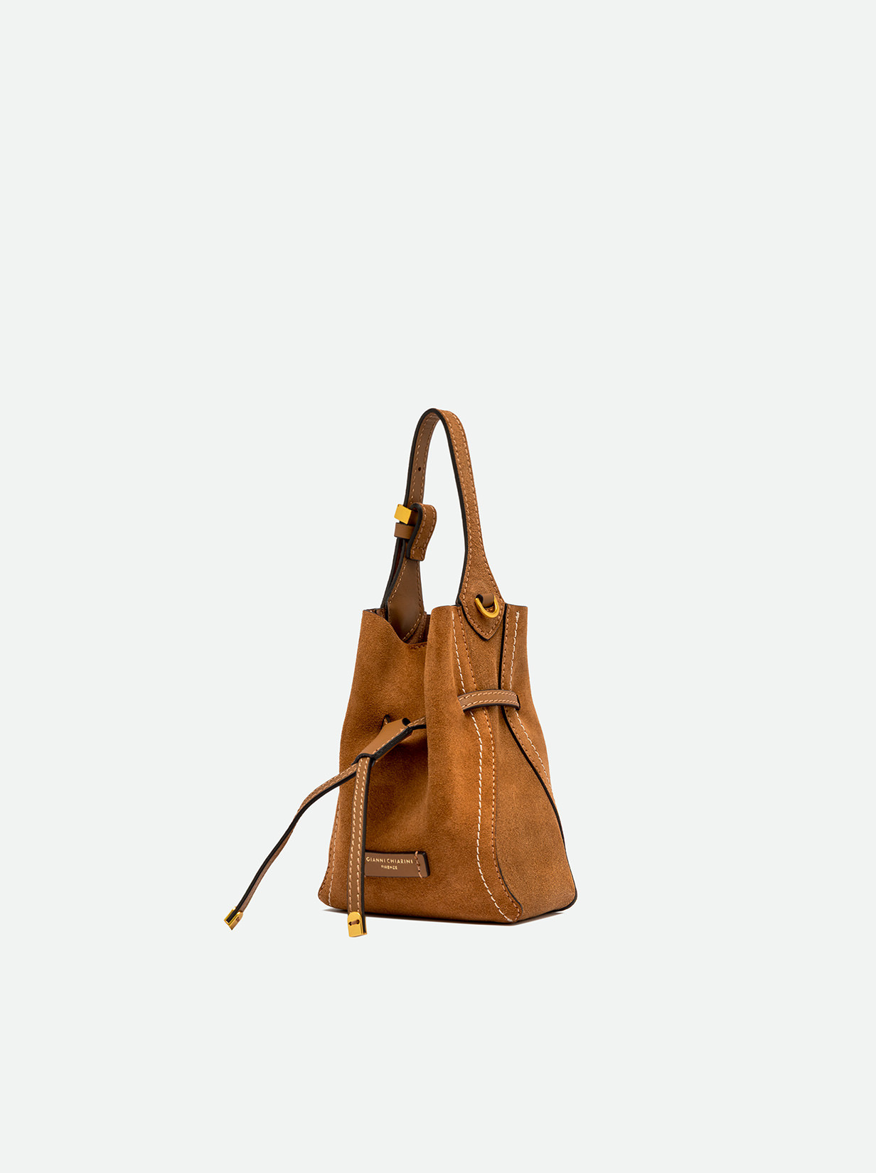 Sienna is the new line by Gianni Chiarini Firenze, defined by its soft yet feminine shape, perfect for a casual-chic look. Crafted from suede, it features contrast topstitching that highlights its silhouette. Equipped with a single compartment and magnetic clasp closure, it's enhanced with iconic metallic details like the double-loop logoed charm and metallic tips. Wear it by hand or on the shoulder with the included adjustable strap. Size: 15x20x8 cm.