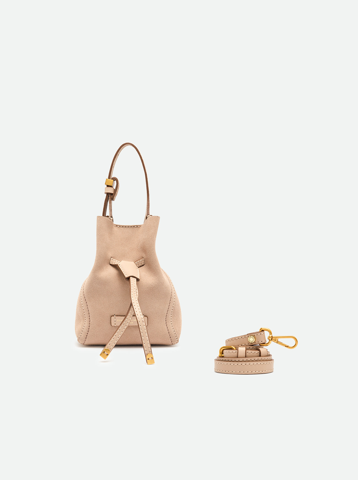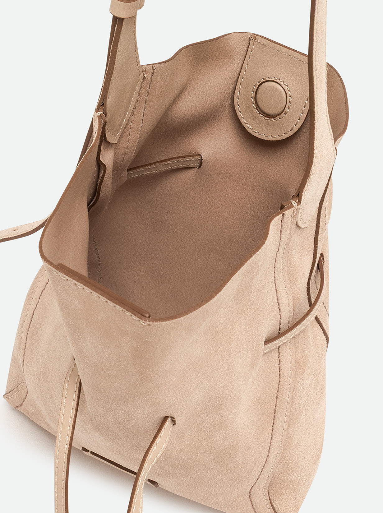 Sienna is the new line by Gianni Chiarini Firenze, defined by its soft yet feminine shape, perfect for a casual-chic look. Crafted from suede, it features contrast topstitching that highlights its silhouette. Equipped with a single compartment and magnetic clasp closure, it's enhanced with iconic metallic details like the double-loop logoed charm and metallic tips. Wear it by hand or on the shoulder with the included adjustable strap. Size: 15x20x8 cm.