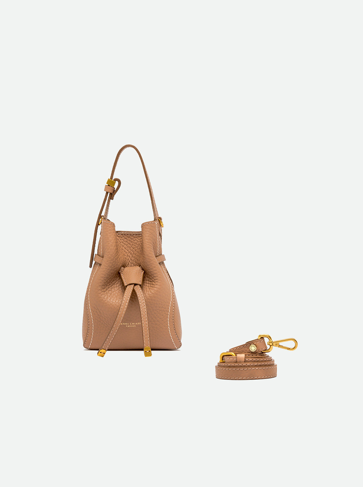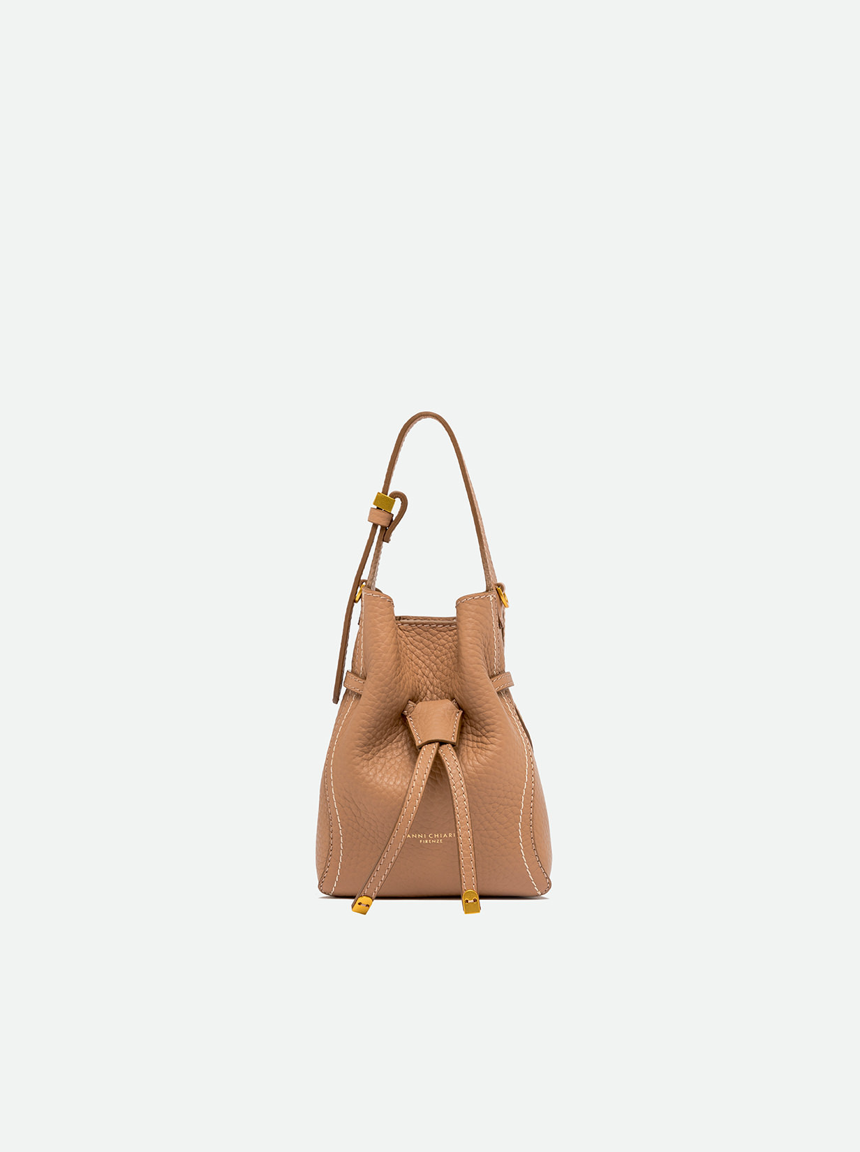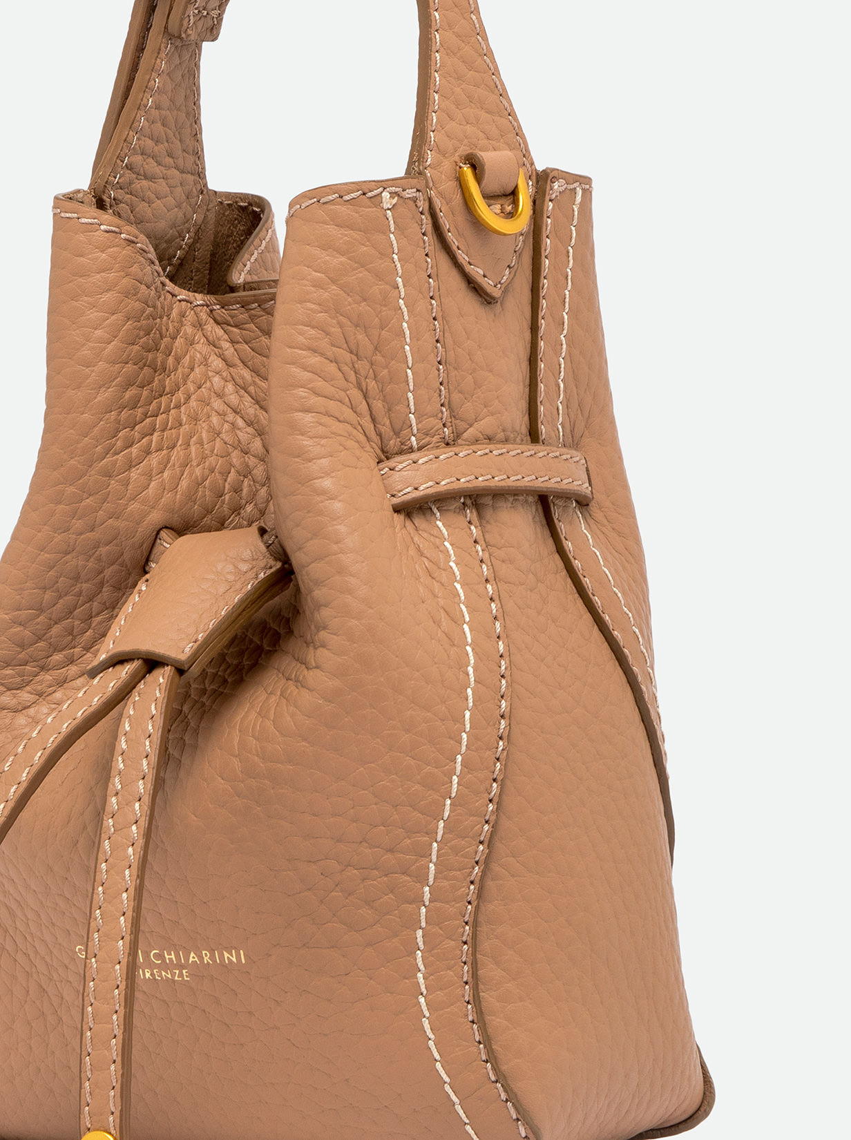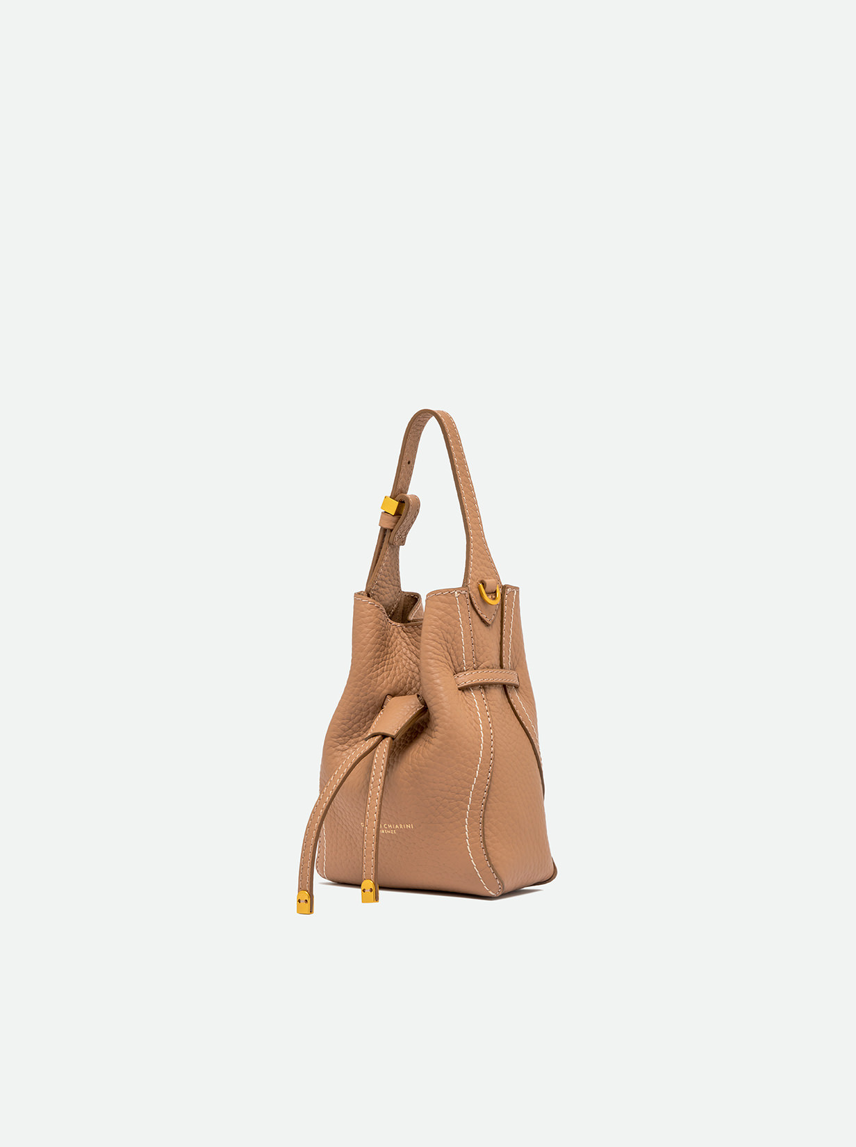 Sienna is the new line by Gianni Chiarini Firenze, defined by its soft yet feminine shape, perfect for a casual-chic look. Crafted from double leather, it features contrast topstitching that highlights its silhouette. Equipped with a single compartment and magnetic clasp closure, it's enhanced with iconic metallic details like the double-loop logoed charm and metallic tips. Wear it by hand or on the shoulder with the included adjustable strap. Size: 15x20x8 cm.