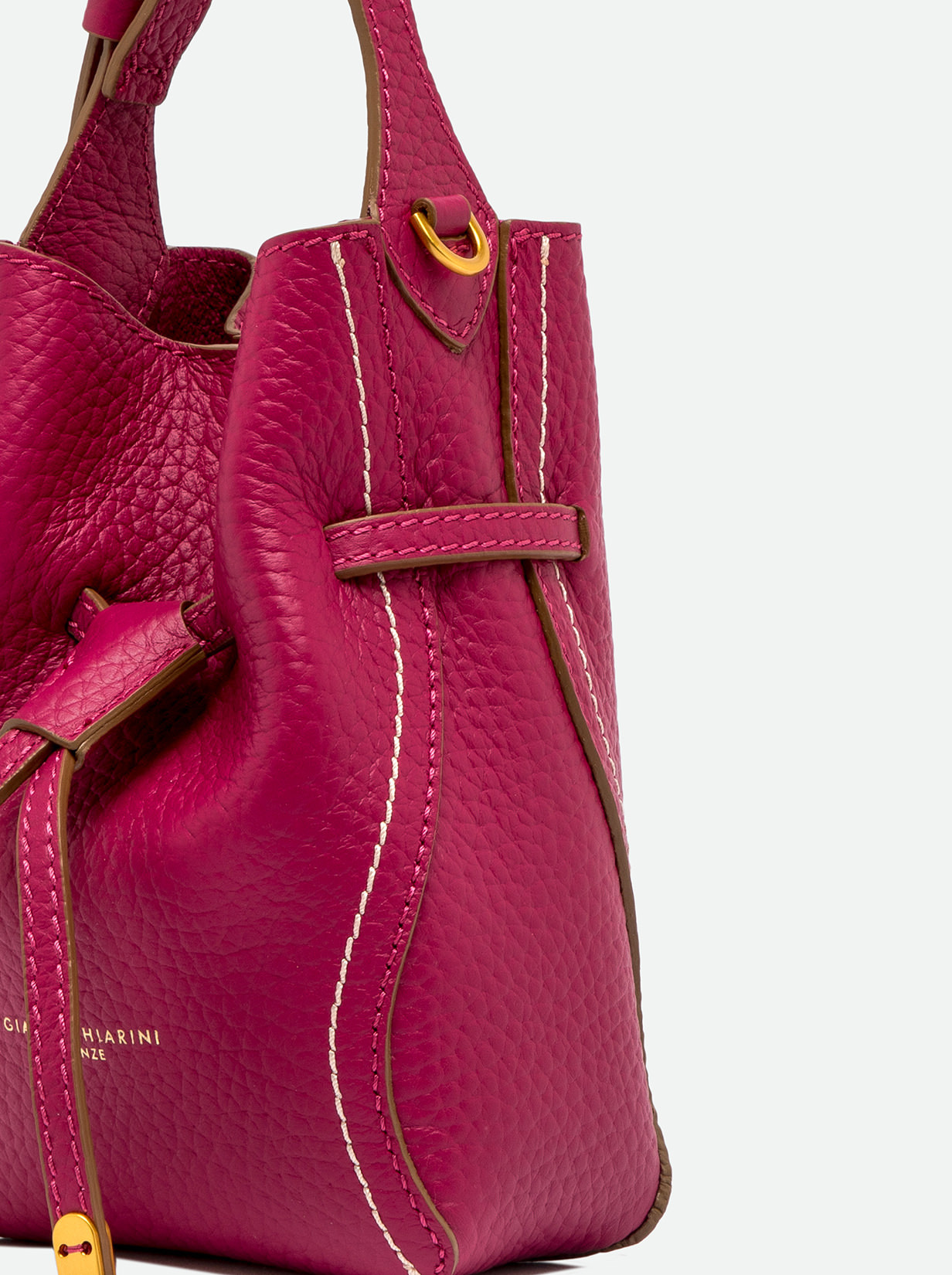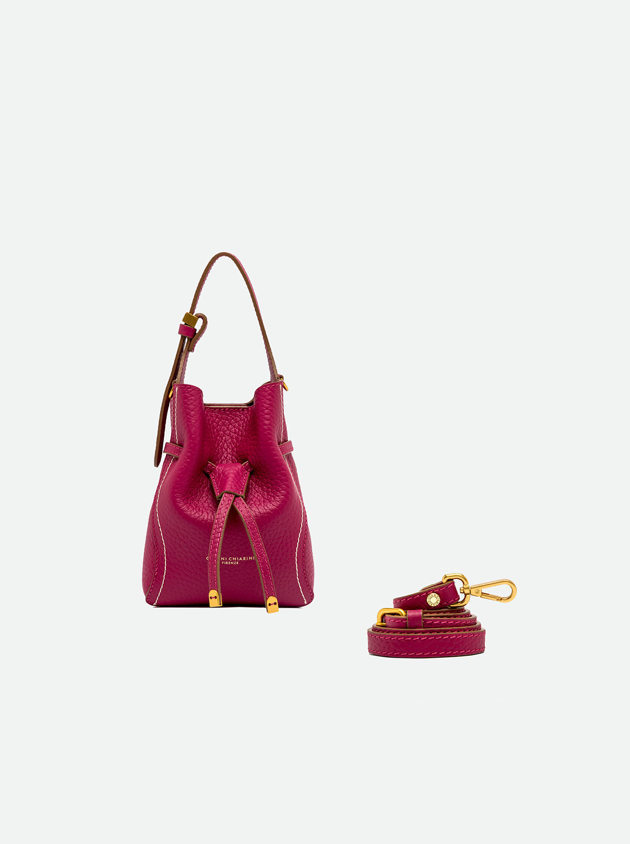 Sienna is the new line by Gianni Chiarini Firenze, defined by its soft yet feminine shape, perfect for a casual-chic look. Crafted from double leather, it features contrast topstitching that highlights its silhouette. Equipped with a single compartment and magnetic clasp closure, it's enhanced with iconic metallic details like the double-loop logoed charm and metallic tips. Wear it by hand or on the shoulder with the included adjustable strap. Size: 15x20x8 cm.