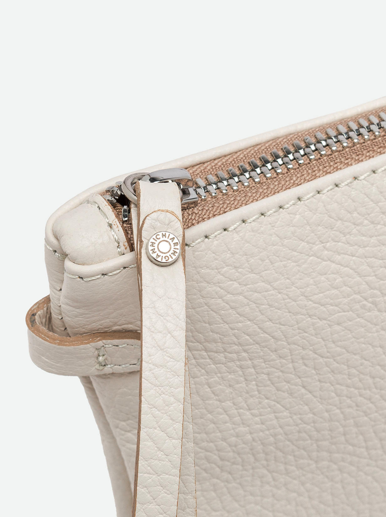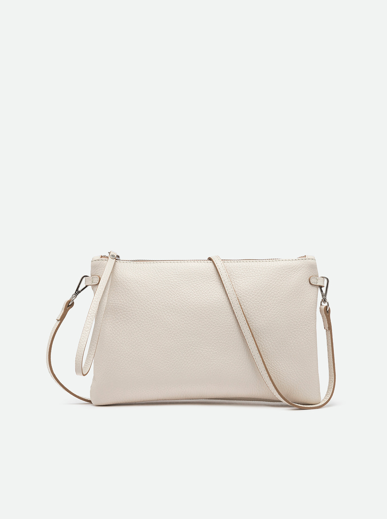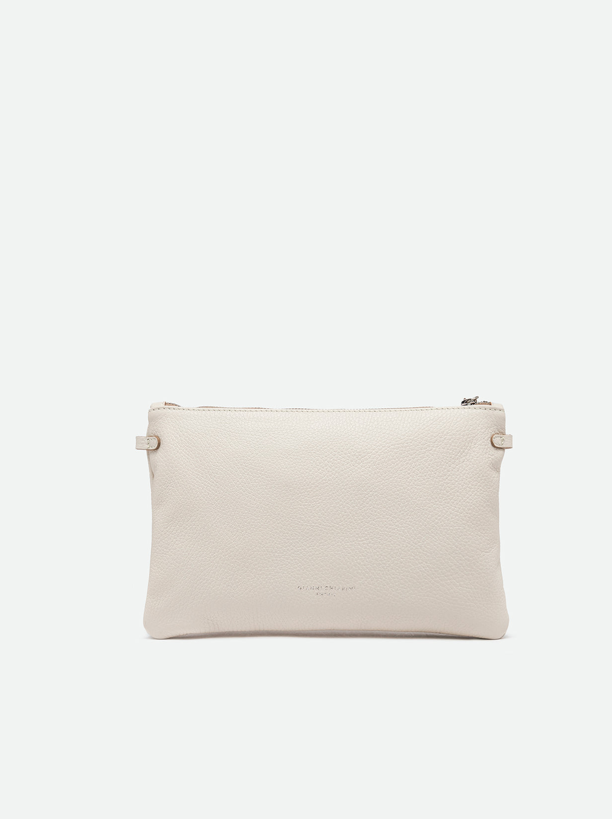 Wearable as a handbag or at the wrist, Hermy Gianni Chiarini Firenze clutch comes in premium quality hammered leather. Young and playful, enriched with a contrast zip and a thin detachable cross-body strap. Perfect with casual outfits but also perfect to beautify a total black look on an elegant night out. Size: 28x18x2 cm.