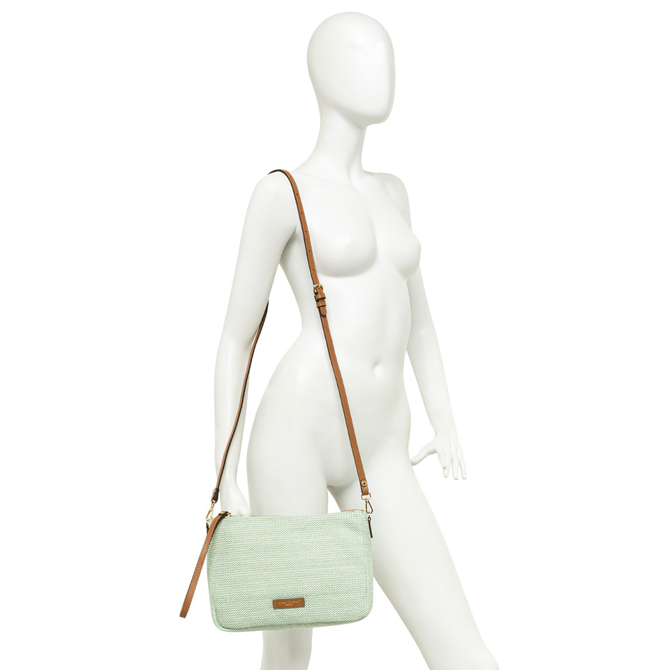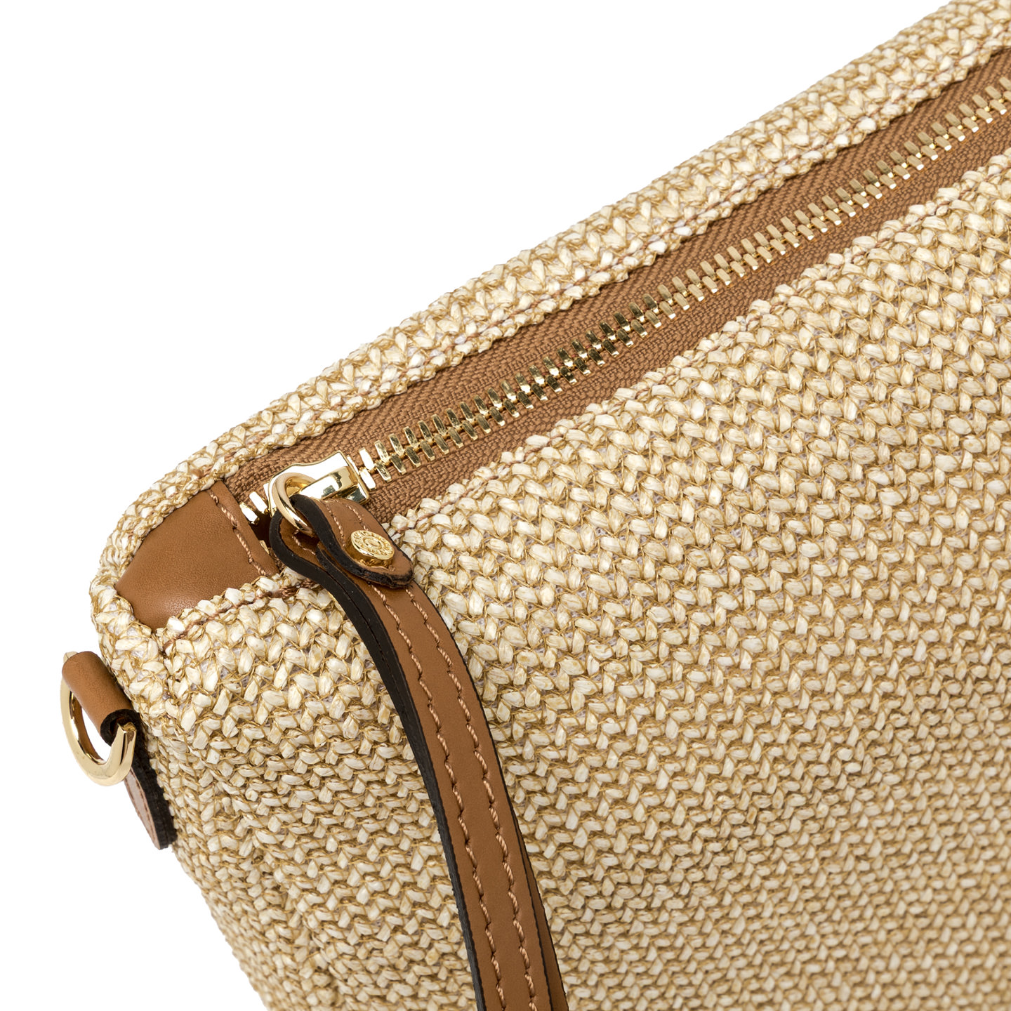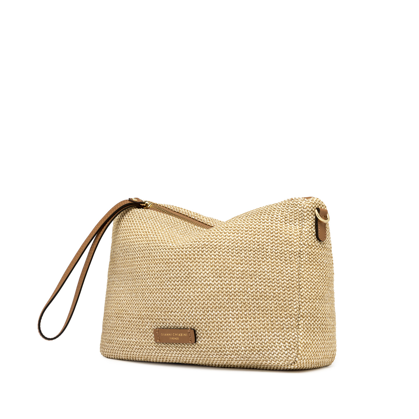 Nora Pouch by Gianni Chiarini Firenze is made of straw. It includes a detachable leather wrist strap and an adjustable, removable shoulder strap for versatile wear. The top zip closure ensures ease and security. Size: 28x21x9 cm.