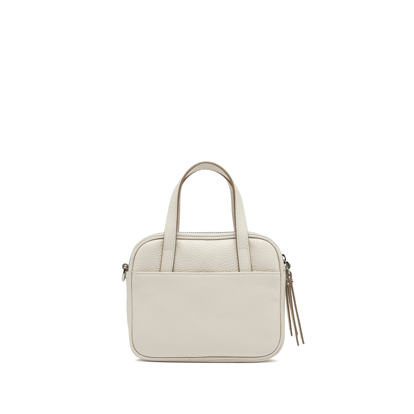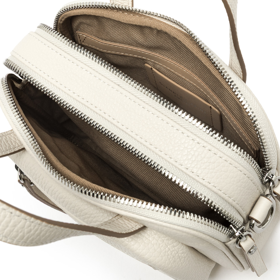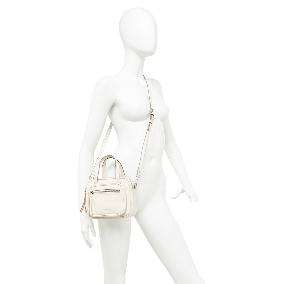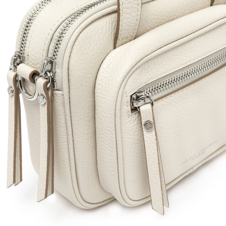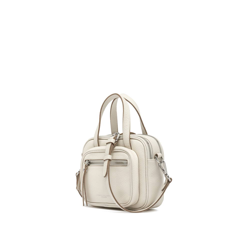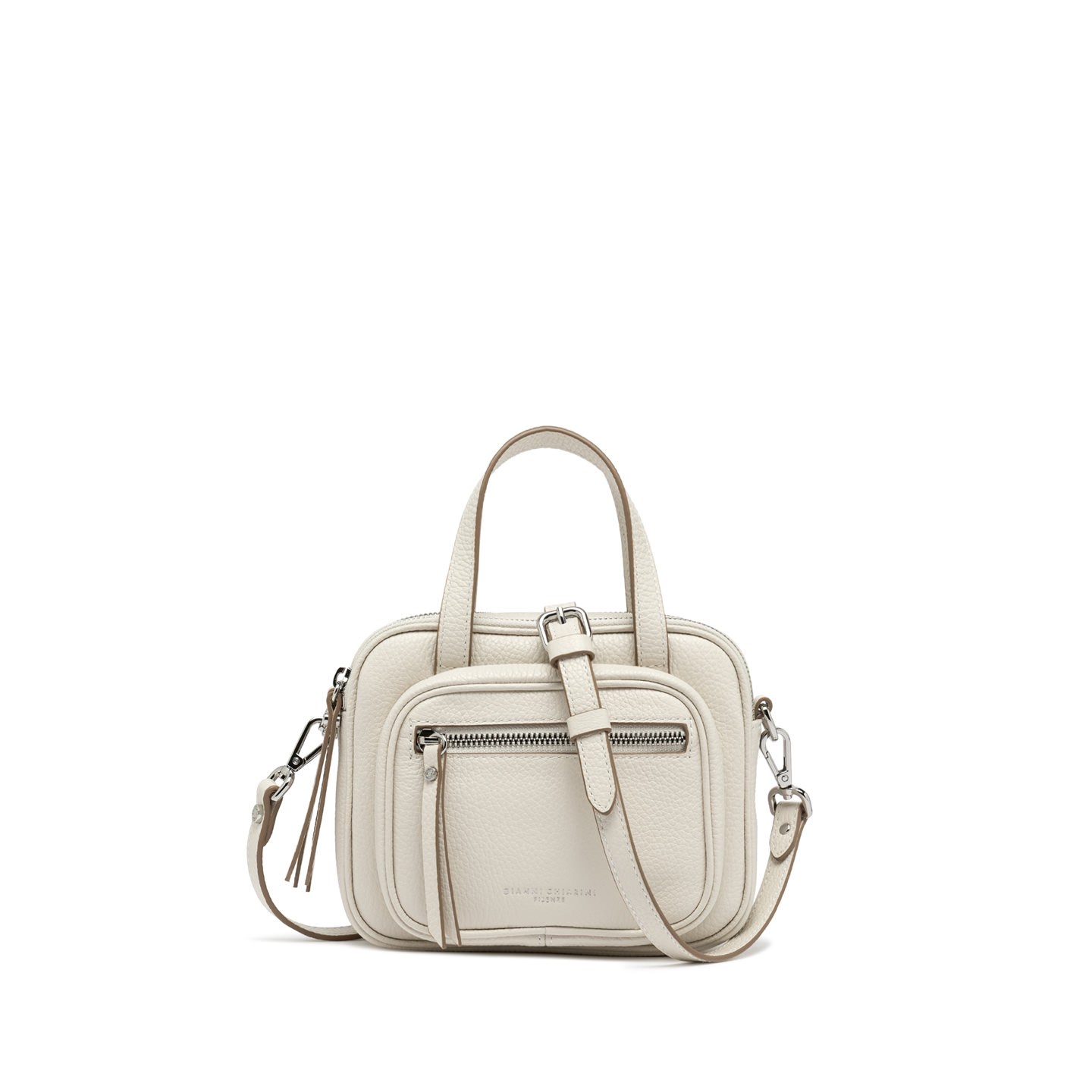 Carré by Gianni Chiarini Firenze is a compact, functional cross-body bag crafted from hammered leather. Defined by its structured, boxy shape, it features two zippered main compartments and a flat front pocket. It comes with two top handles and an adjustable, detachable leather strap for versatile wear. Size: 19x16x9 cm.