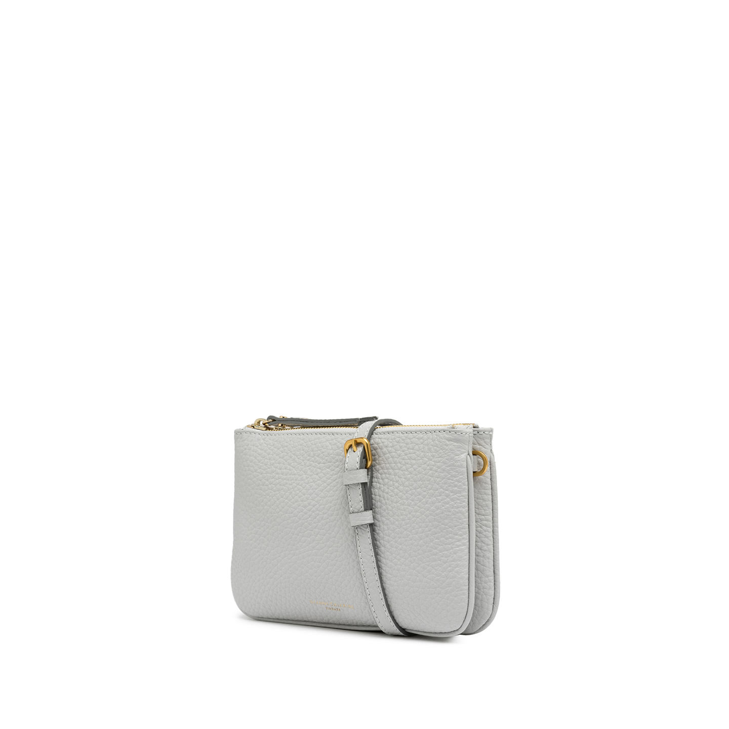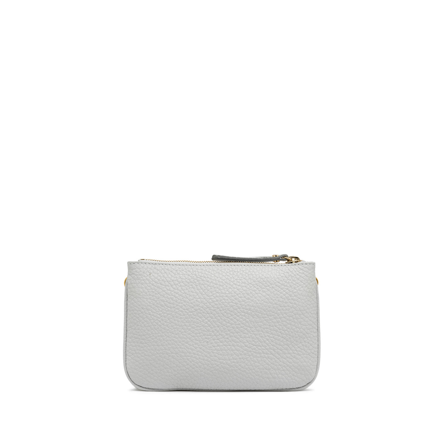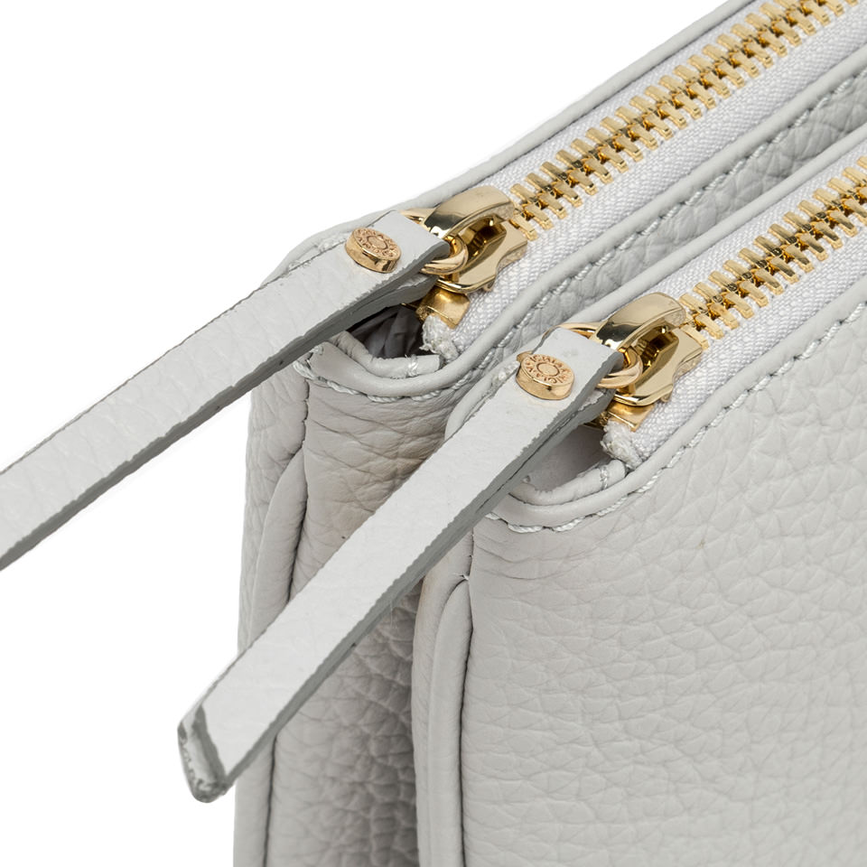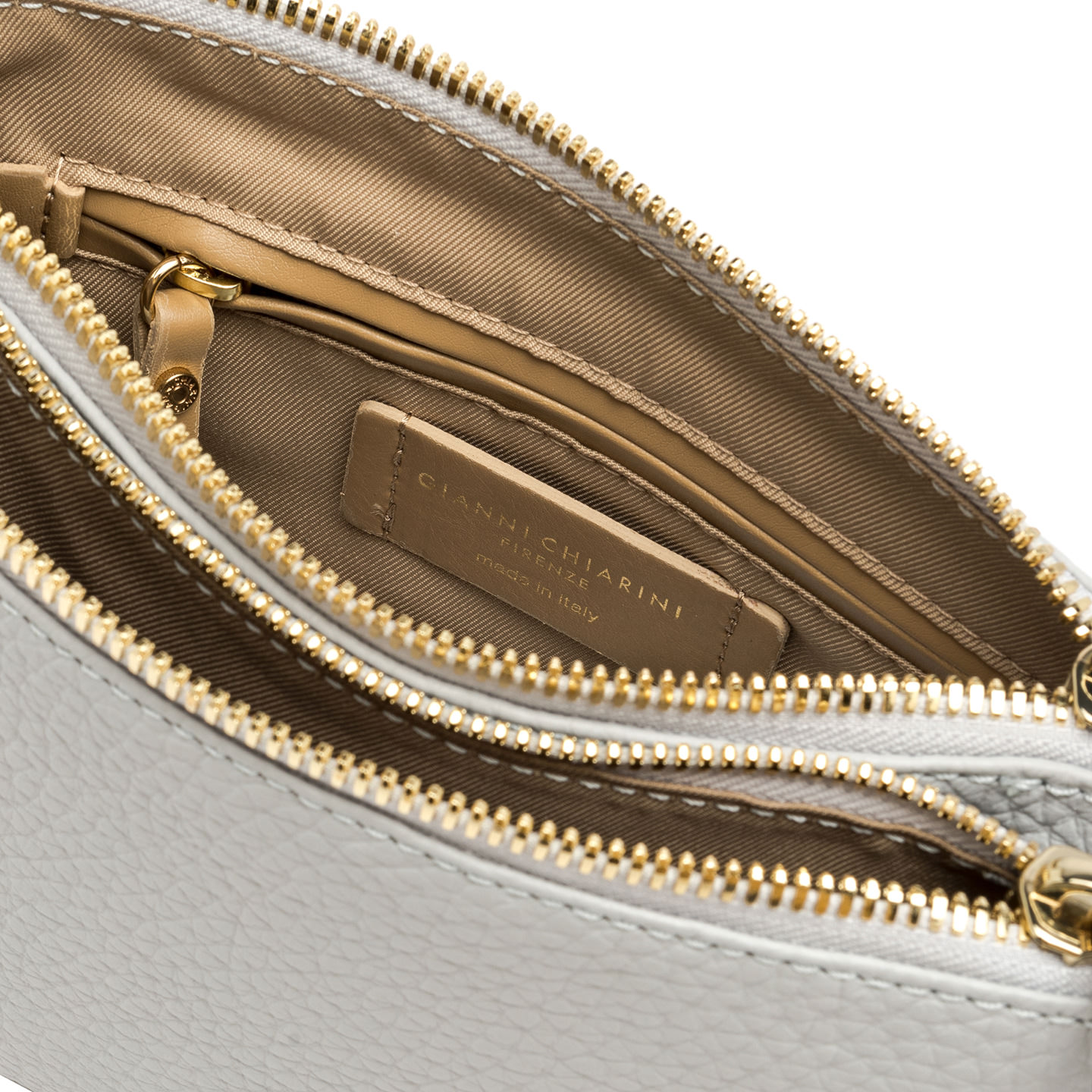 The clean, trendy design of Frida shoulder bag makes it a casual and practical accessory. Made of maxi grain leather, it is enriched with two zips that form two large compartments. Removable and adjustable thin shoulder strap in color matching leather. Size: 24x16x5 cm.
