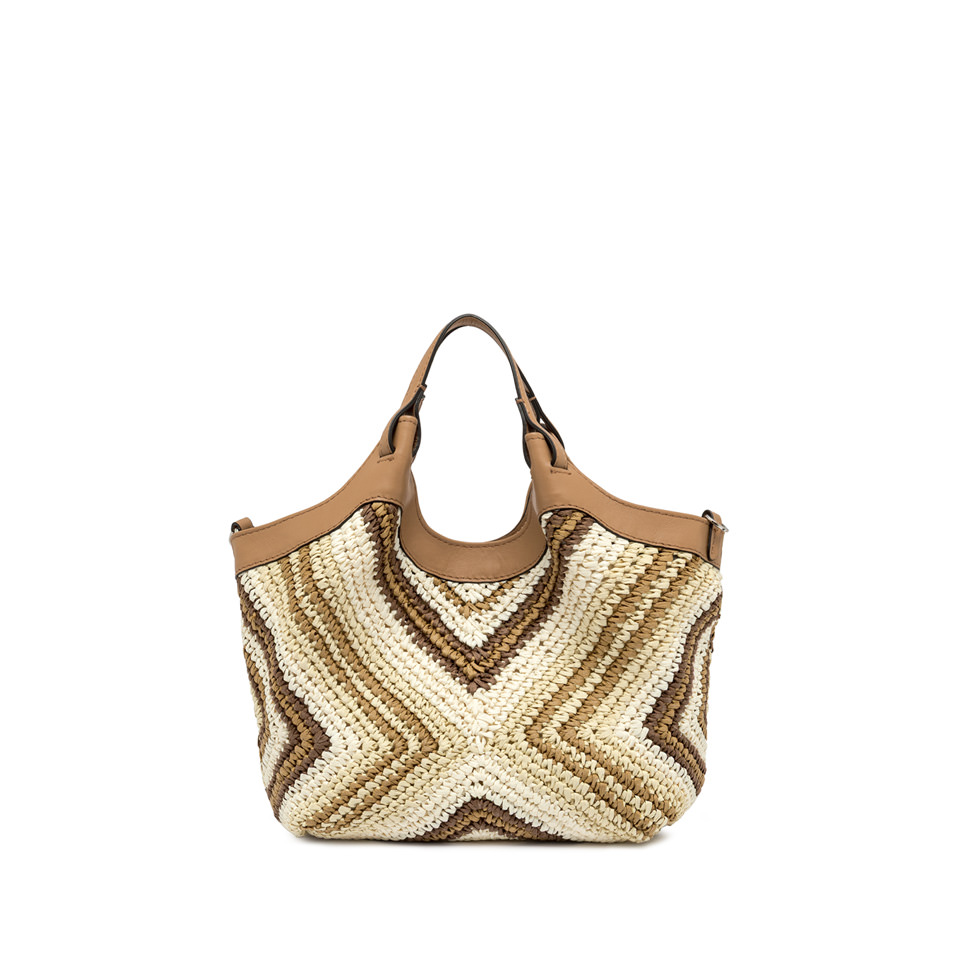 The iconic Dua bag, crafted from woven straw, stands out for its unique texture. It features an unlined single compartment, top profiles in leather and color matching double handles. Practical and essential, it is perfect to stylishly enhance any look. It can be carried as a handbag at the shoulder. Equipped with a practical clutch with zip closure. Size: 24x27x12 cm.