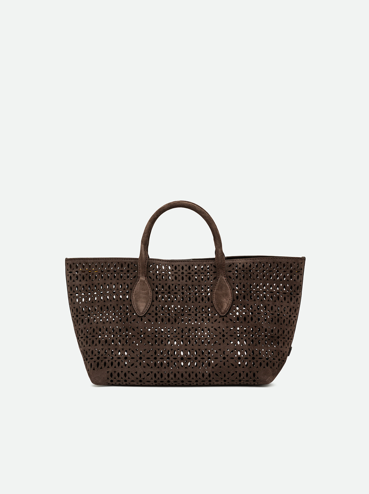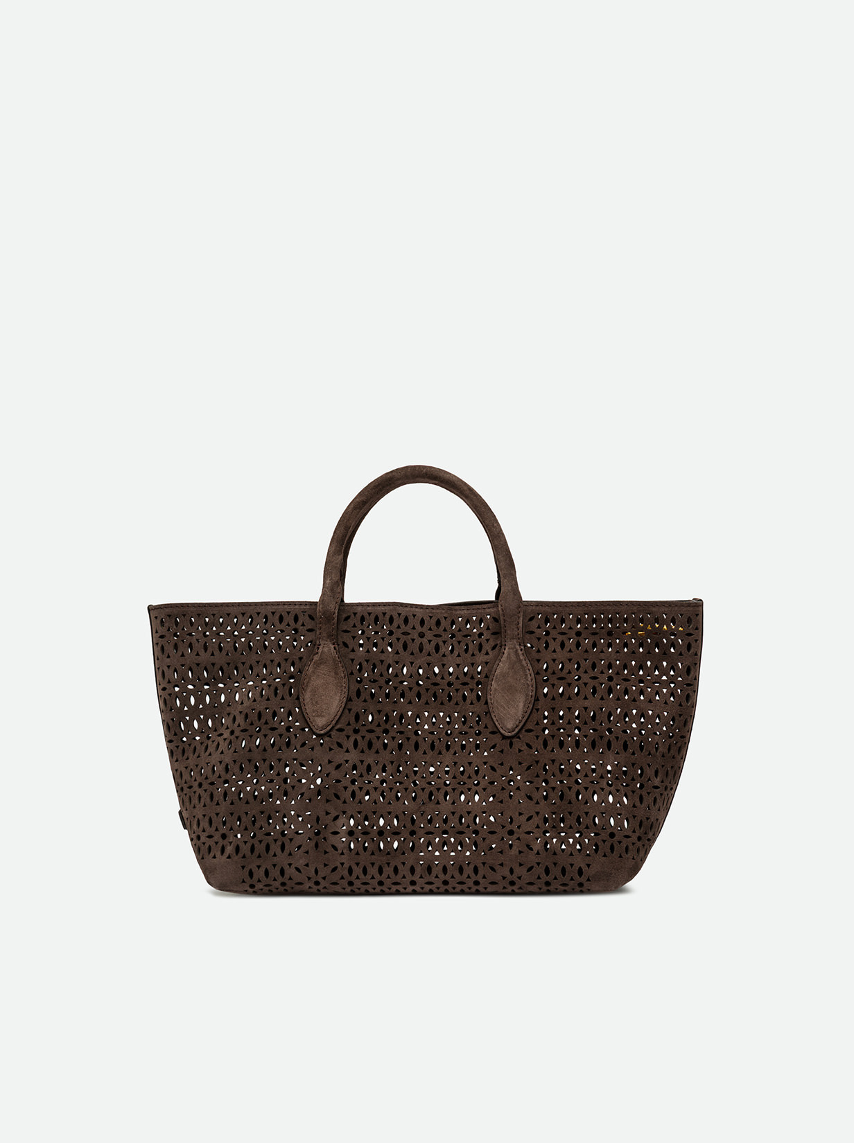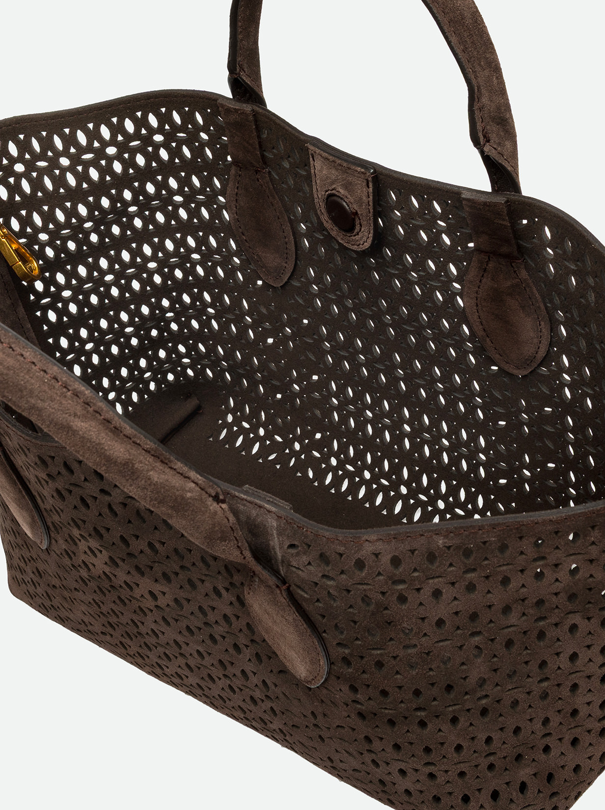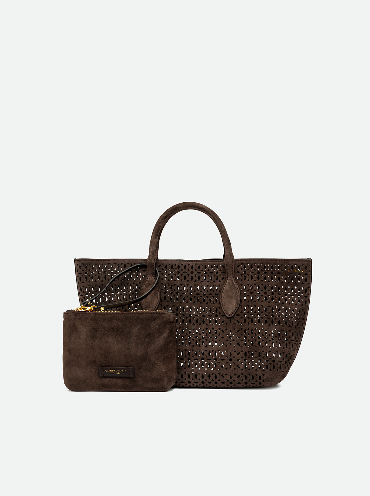 The Mashup handbag by Gianni Chiarini Firenze is made of laser-cut suede, creating a sophisticated perforated design that makes it unique and timeless. Equipped with two leather handles and a magnetic button closure, it’s ideal for completing a casual everyday look. Includes an adjustable and removable shoulder strap for a practical and versatile crossbody option. Size: 30x22x14 cm.