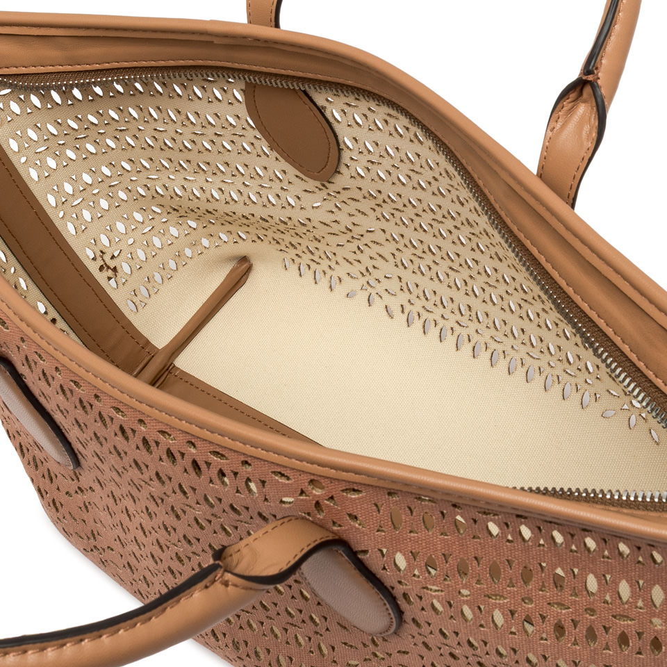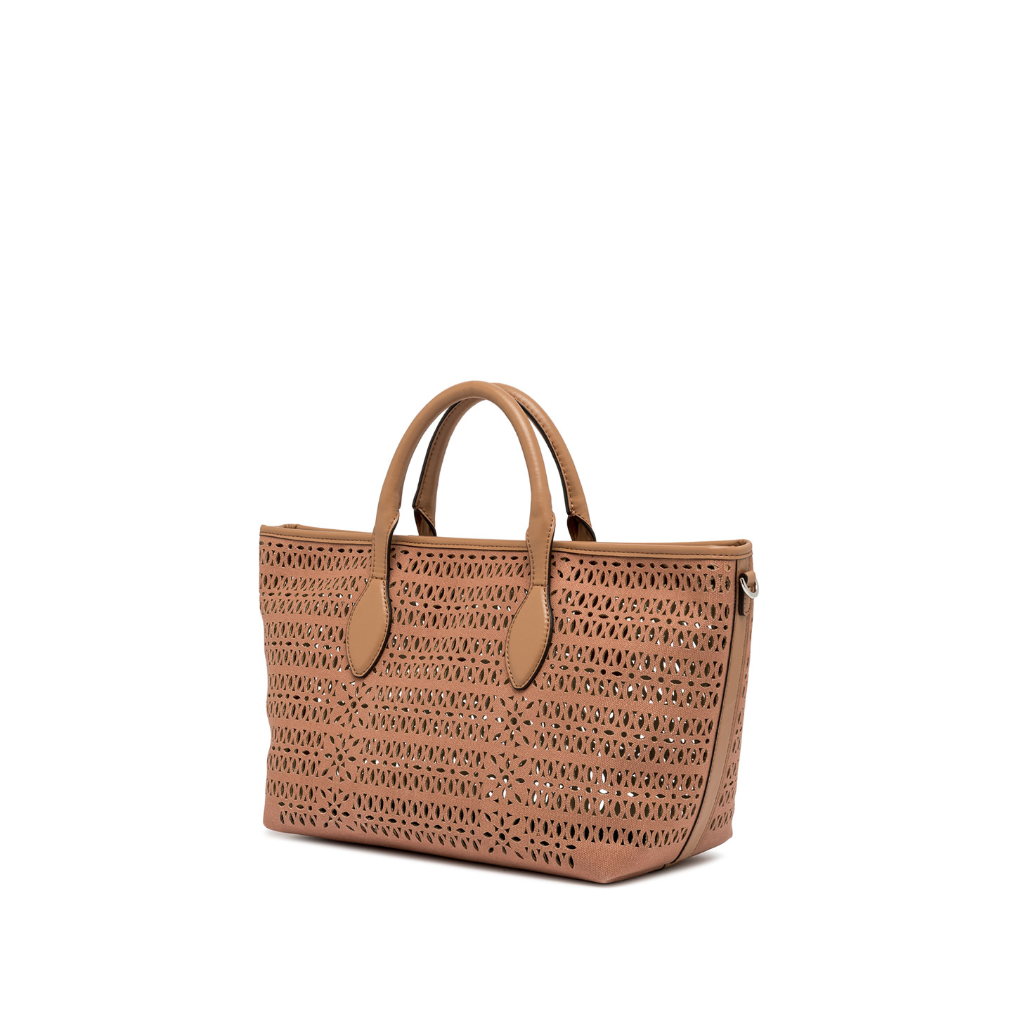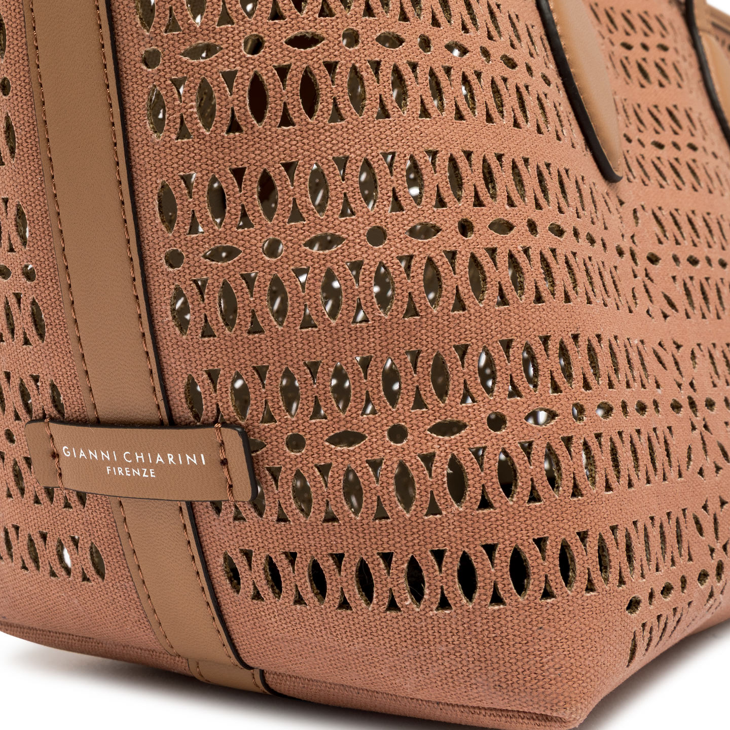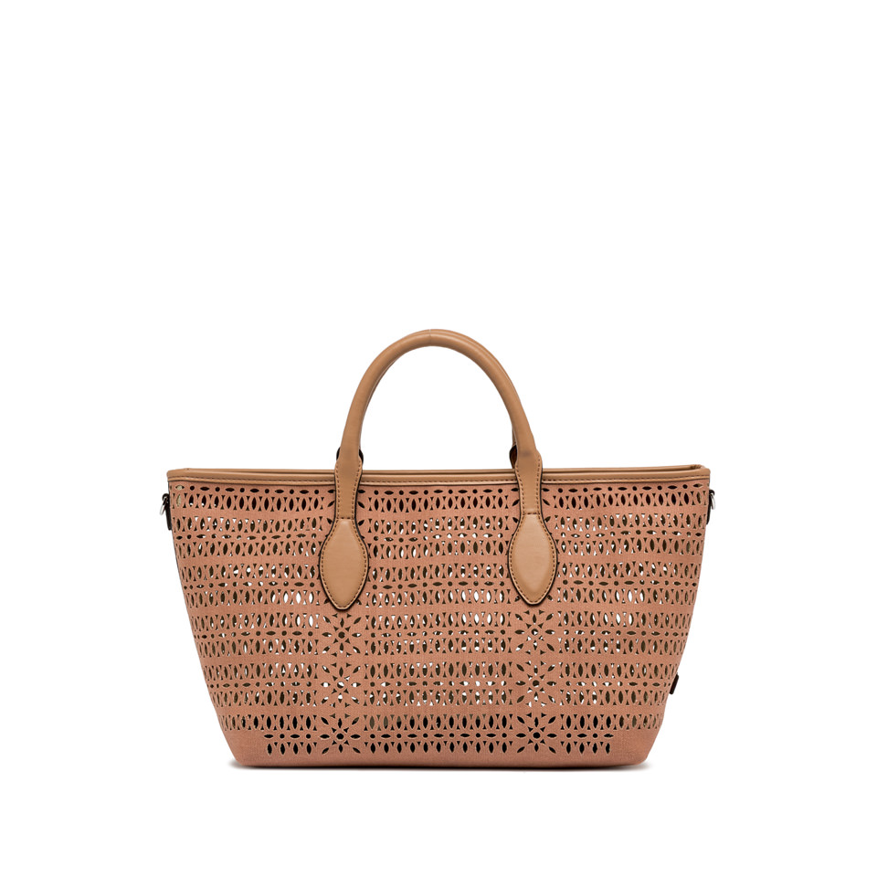 The Mashup handbag by Gianni Chiarini Firenze is made of laser-cut canvas, creating a sophisticated perforated design that makes it unique and timeless. Equipped with two leather handles and a magnetic button closure, it’s ideal for completing a casual everyday look. Includes an adjustable and removable shoulder strap for a practical and versatile crossbody option. Size: 30x22x14 cm.