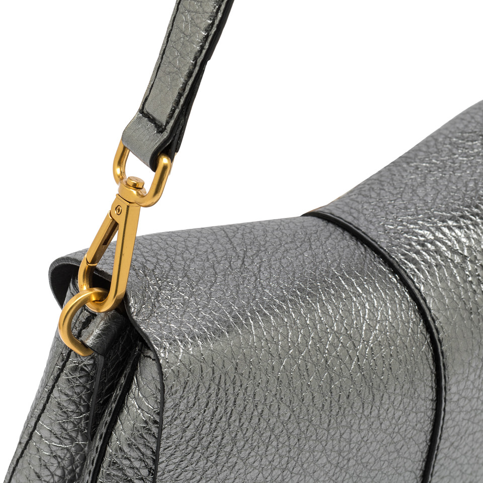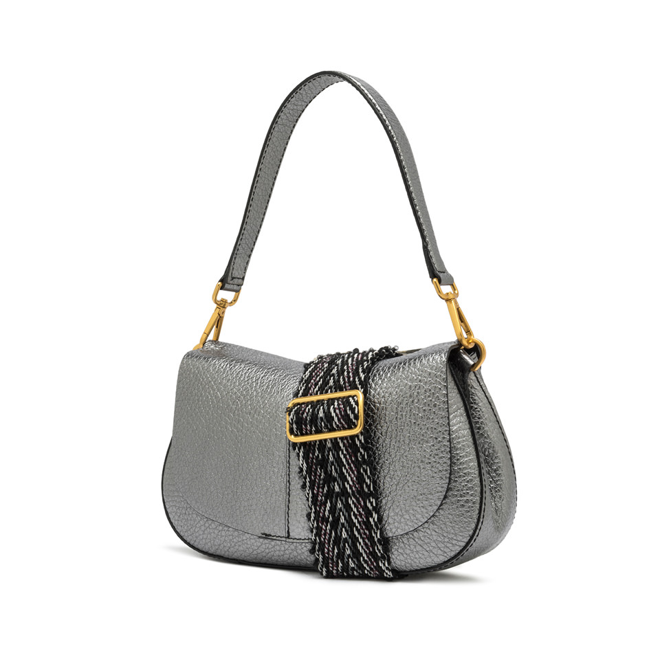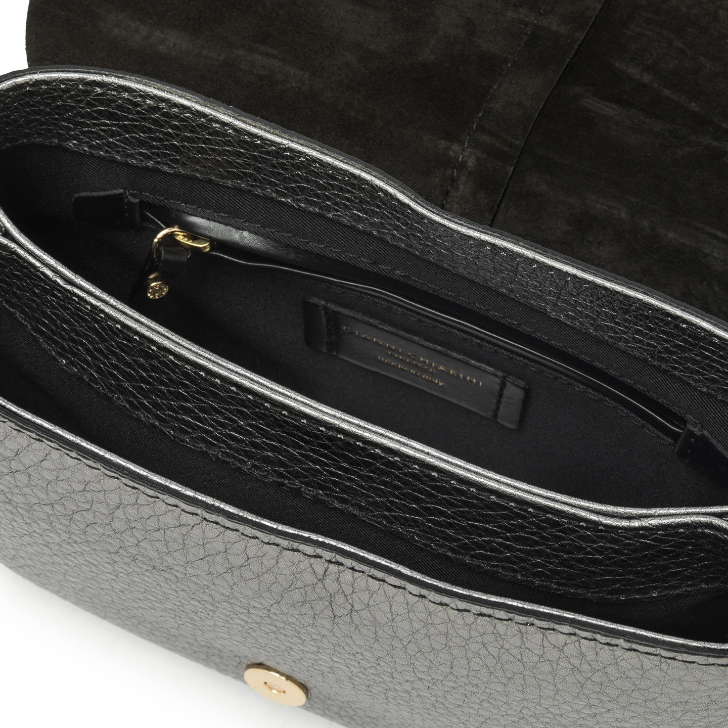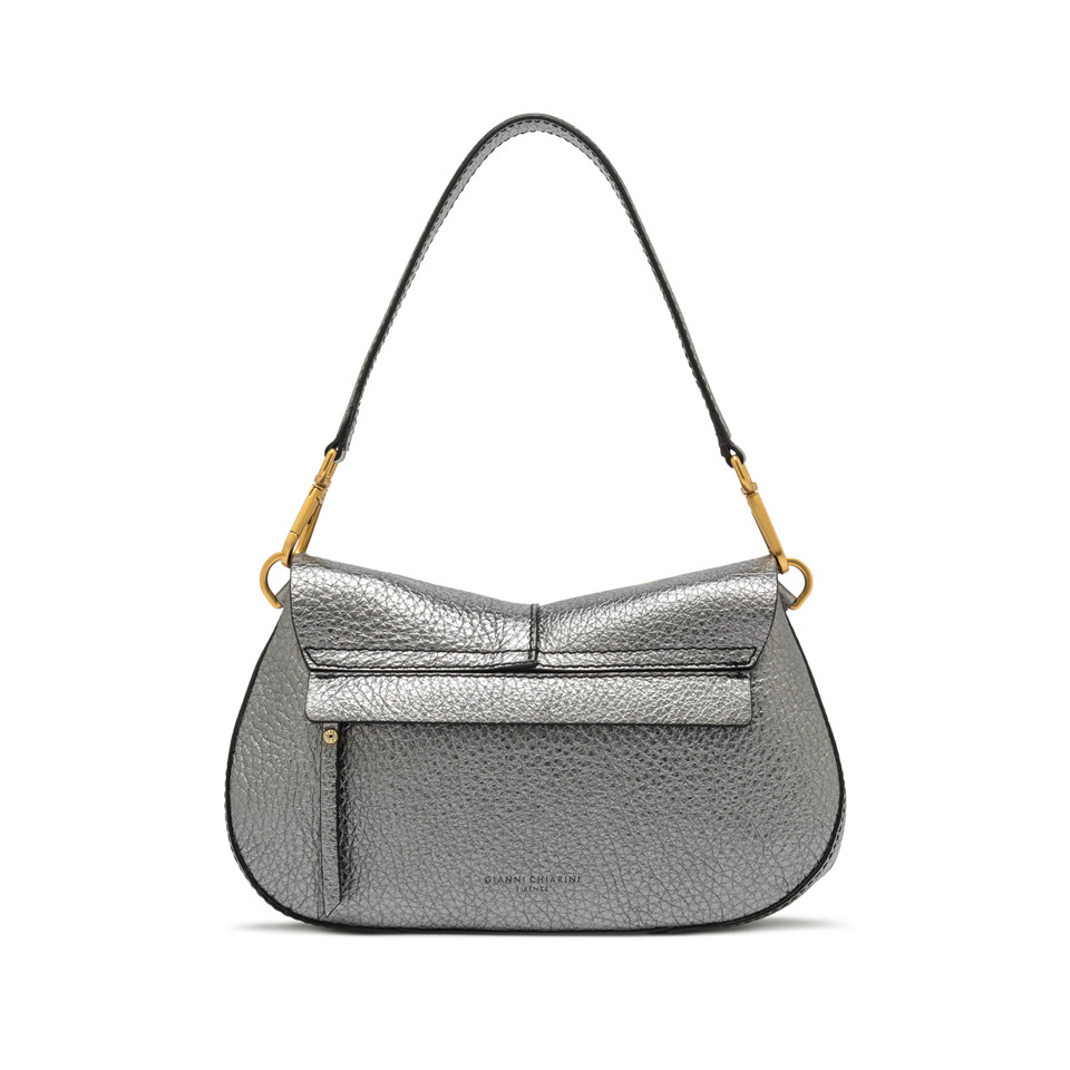 The iconic Helena Round Gianni Chiarini Firenze bag in maxi grain leather boasts a structured design with a contemporary, glam appeal. Thanks to the shoulder straps it is equipped with, it can be worn in two different ways. Practical and organized, it features a double interior compartment and a concealed pocket, also on the back of the bag. Size: 28x16x7.5 cm.