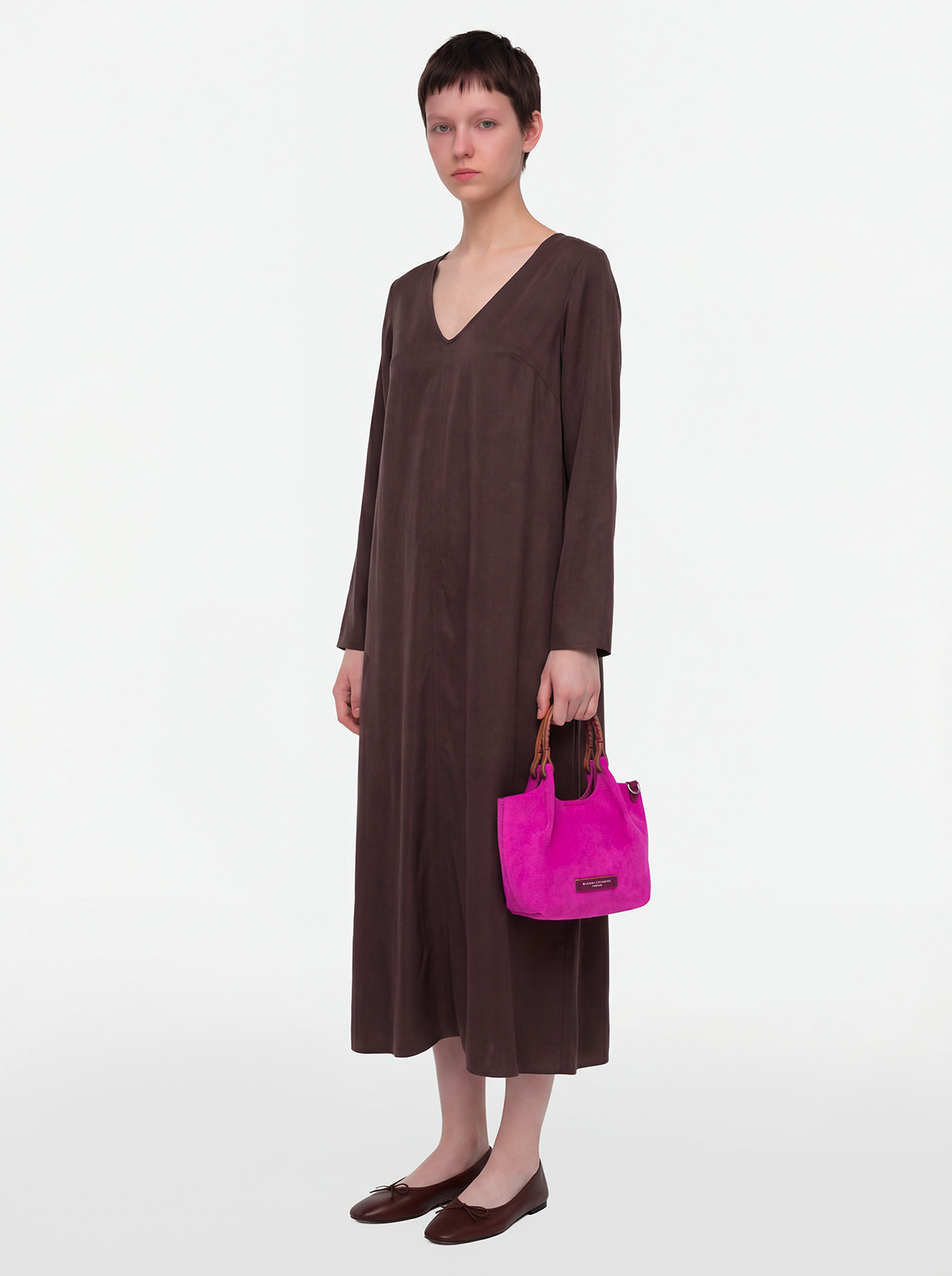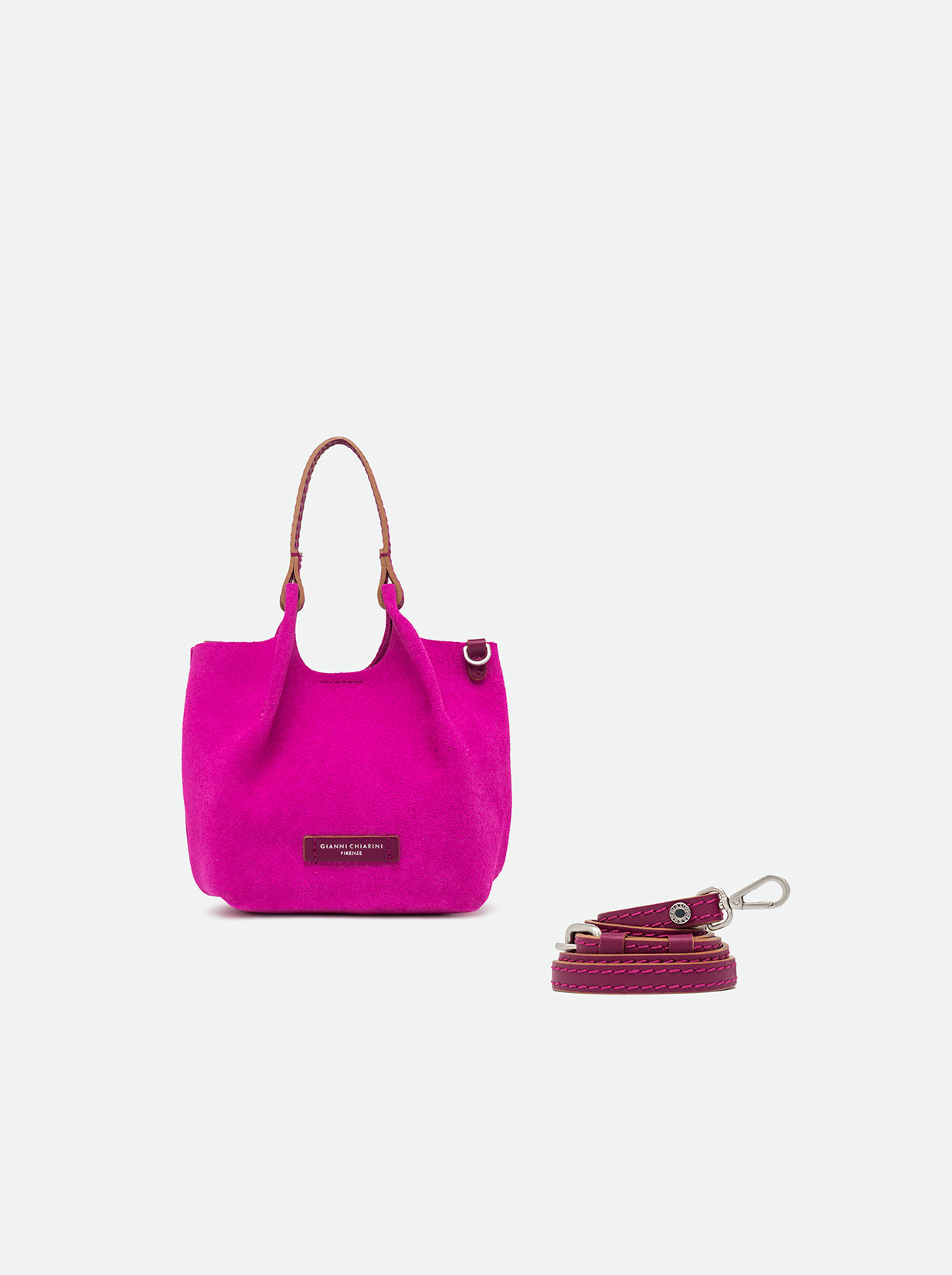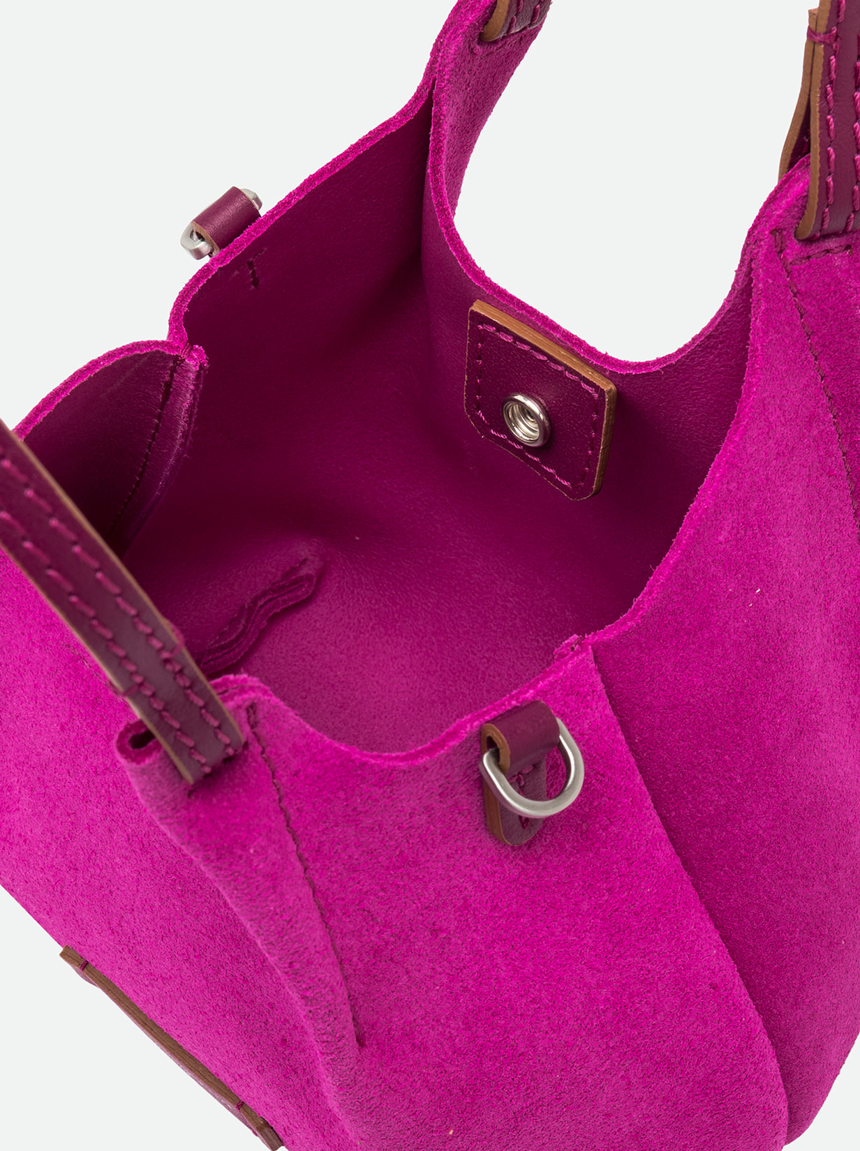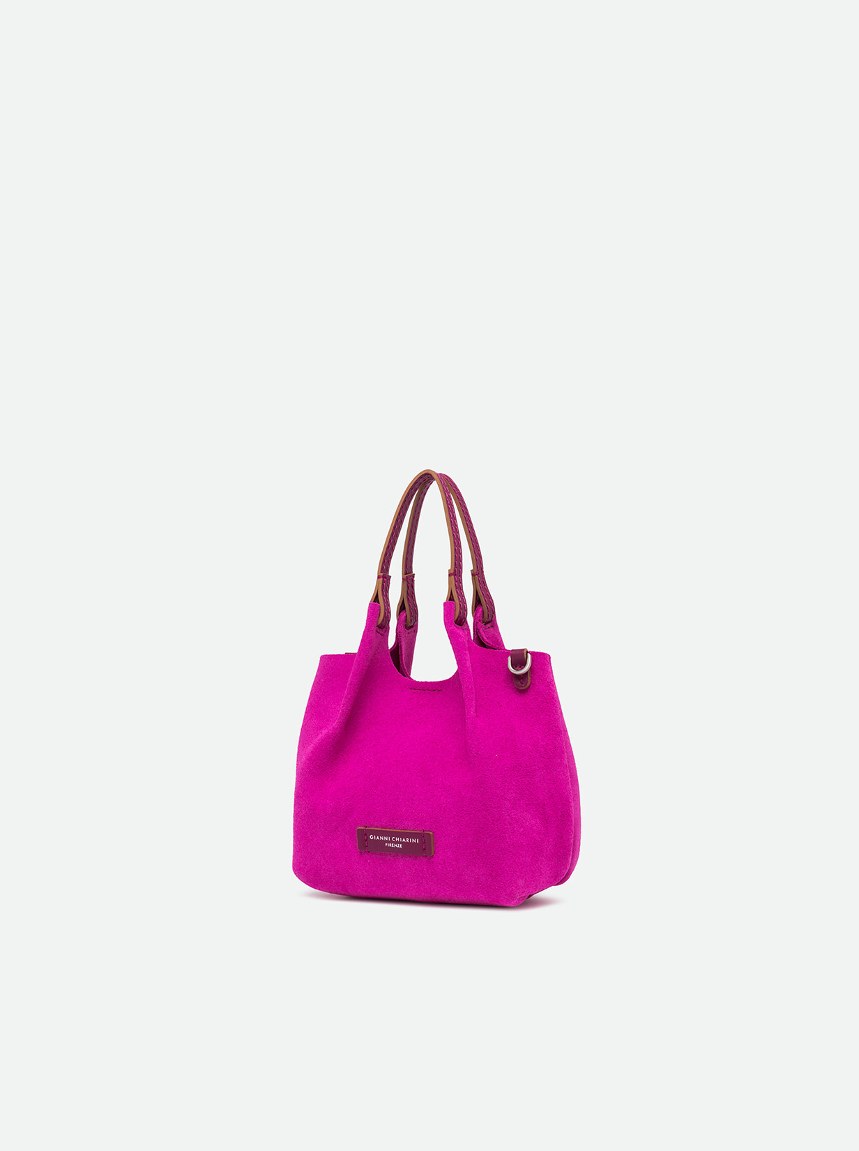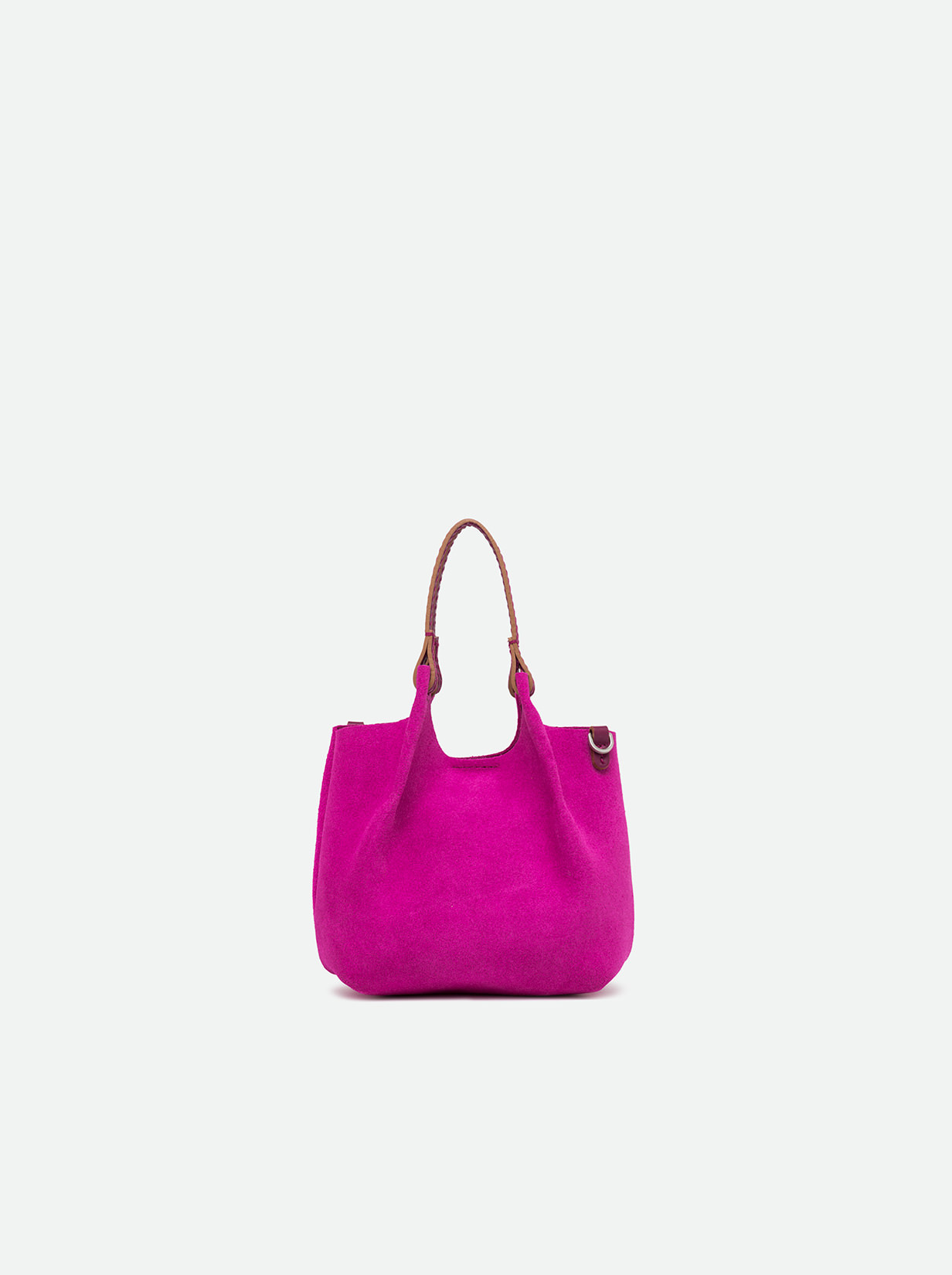 The iconic Dua bag, crafted from suede, stands out for its unique texture. It features an unlined single compartment, top profiles in leather and color matching double handles. Practical and essential, it is perfect to stylishly enhance any look. It can be carried as a handbag at the shoulder. Size: 19x20x8 cm.