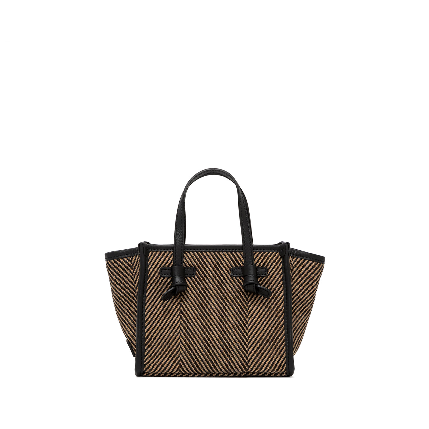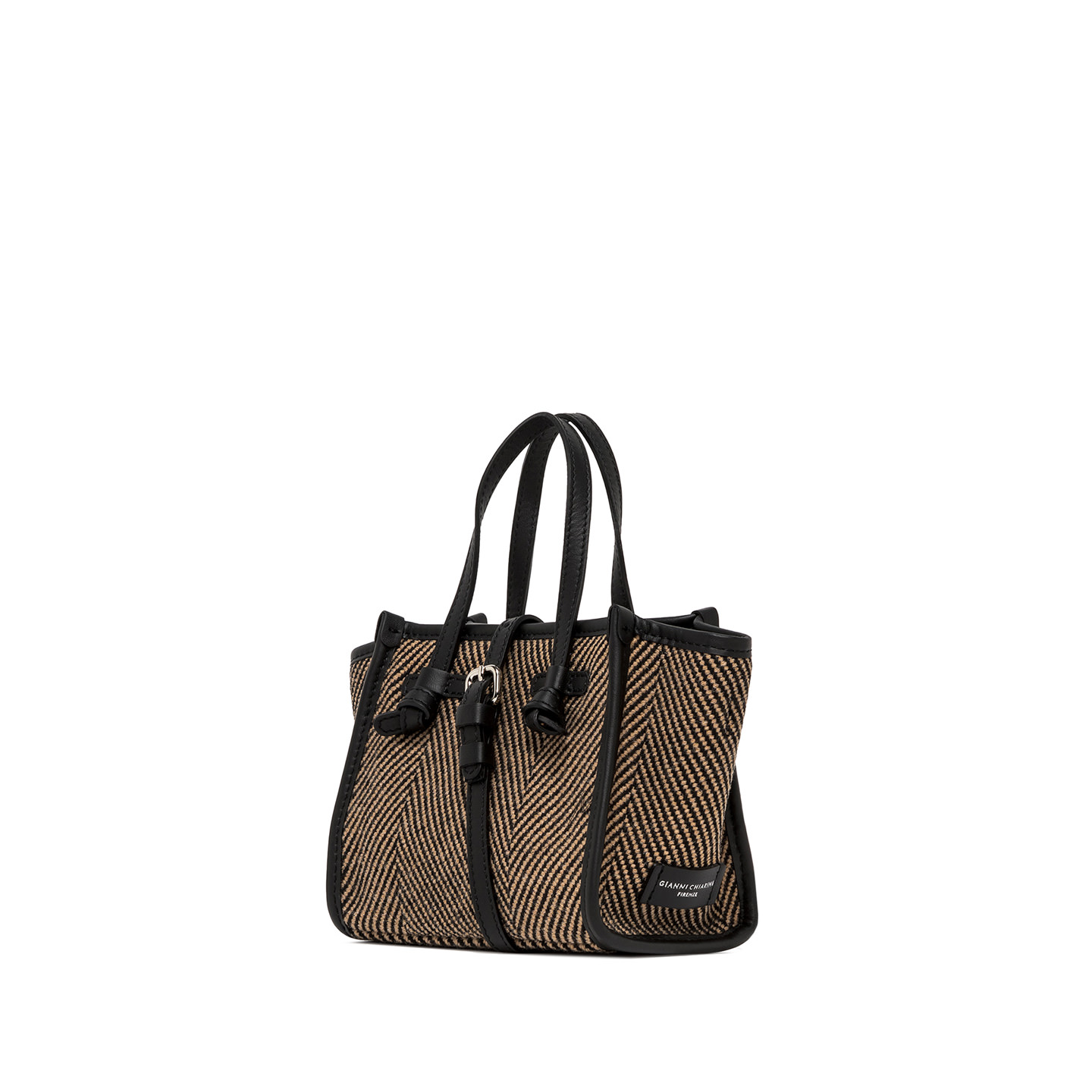 Miss Marcella by Gianni Chiarini is a classic and stylish accessory. Made of herringbone print fabric and enriched by leather profiles. Zipper closure. Wearable as a handbag or cross-body thanks to the thin shoulder strap in leather. Size: 19x15x10 cm.