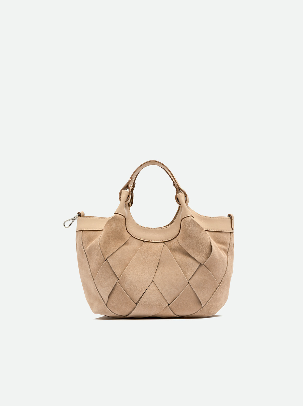 The brand icon DUA stands out for its simple yet contemporary design. Made of chamois with a geometric weave pattern for a signature country-chic style, this bag stands out as a must-have accessory for the season. Leather trim enhances its natural tones, while the textured weave adds both character and refinement. Includes a single compartment and matching double handles with snap-button closure. Carry it by hand or cross-body thanks to the included strap. Size: 24x27x12 cm.