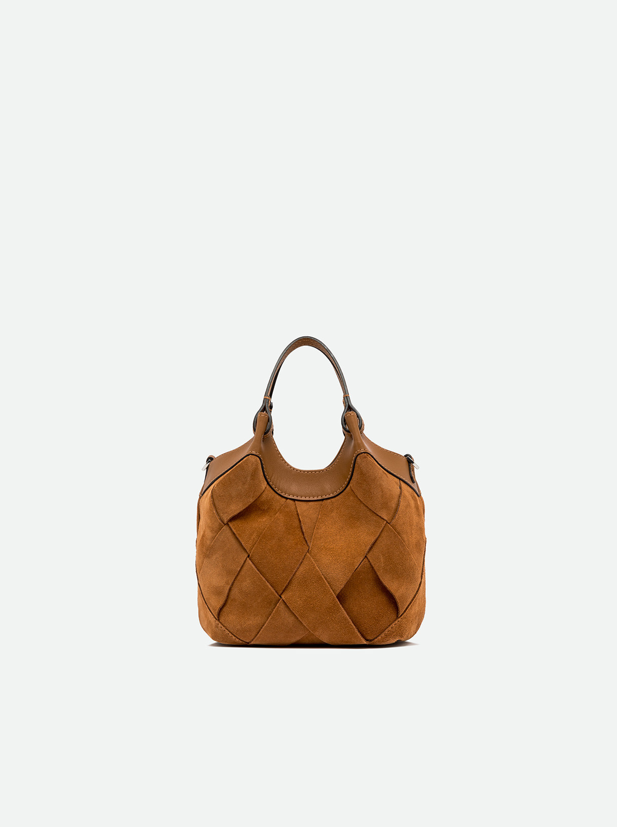 The brand icon DUA stands out for its simple yet contemporary design. Made of chamois with a geometric weave pattern for a signature country-chic style, this bag stands out as a must-have accessory for the season. Leather trim enhances its natural tones, while the textured weave adds both character and refinement. Includes a single compartment and matching double handles with snap-button closure. Carry it by hand or cross-body thanks to the included strap. Size: 19x20x8 cm.