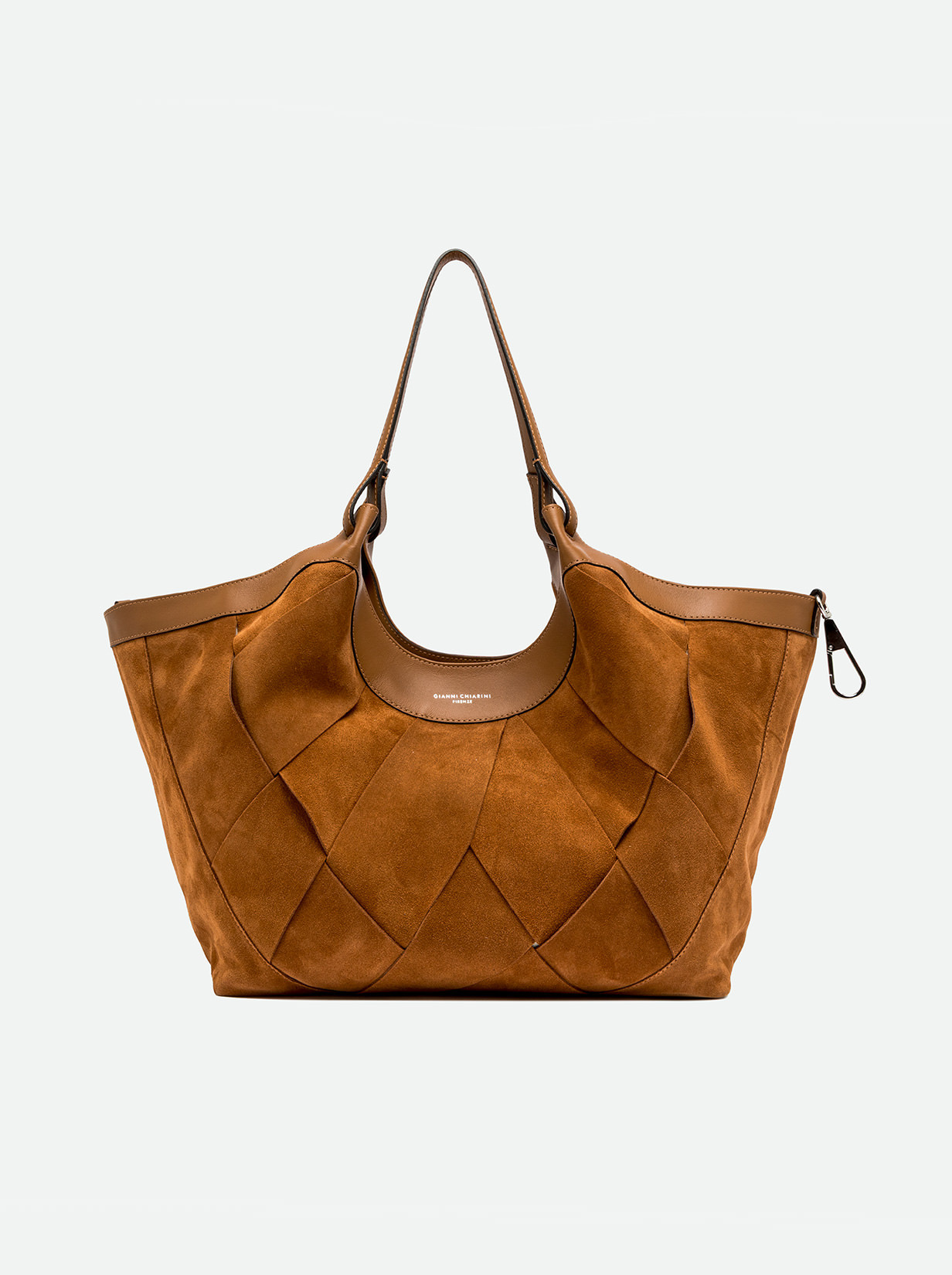 The brand icon DUA stands out for its simple yet contemporary design. Made of chamois with a geometric weave pattern for a signature country-chic style, this bag stands out as a must-have accessory for the season. Leather trim enhances its natural tones, while the textured weave adds both character and refinement. Includes a single compartment and matching double handles with snap-button closure. Size: 34x38x16 cm.