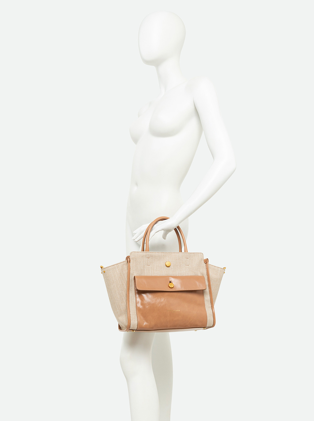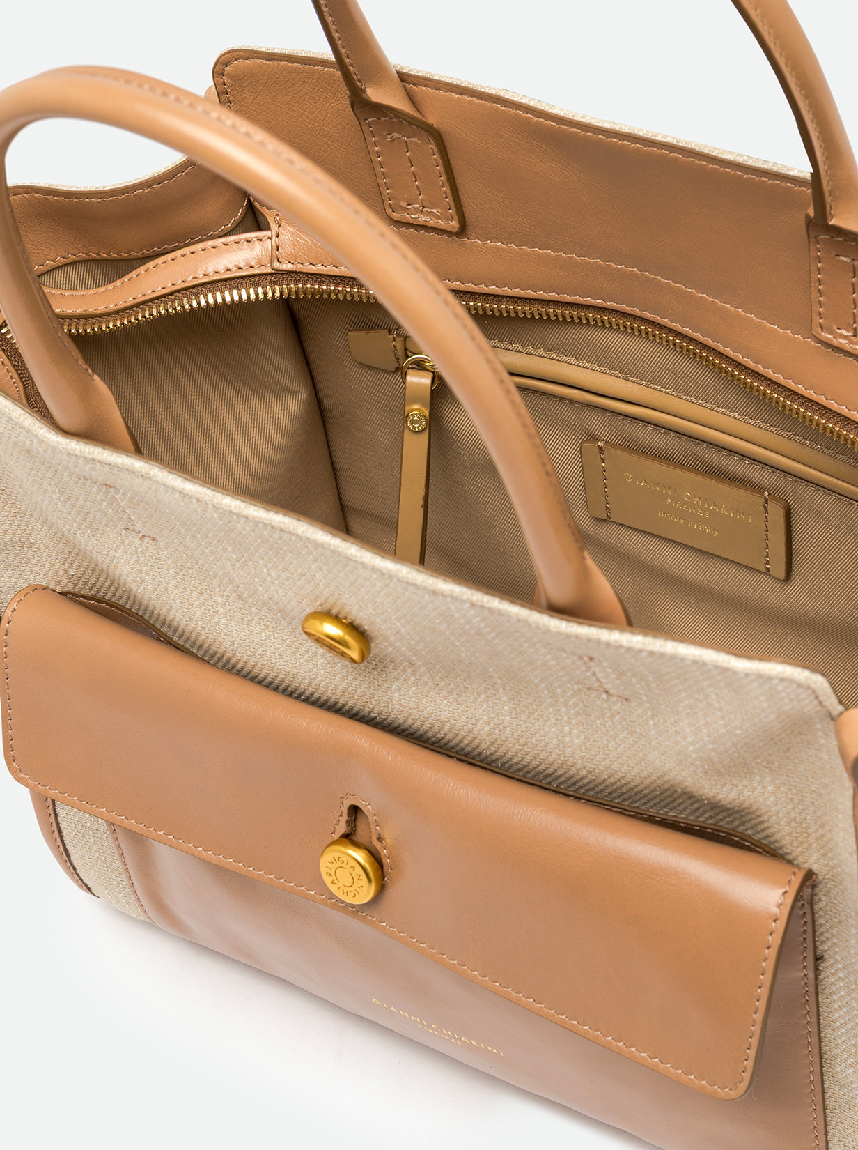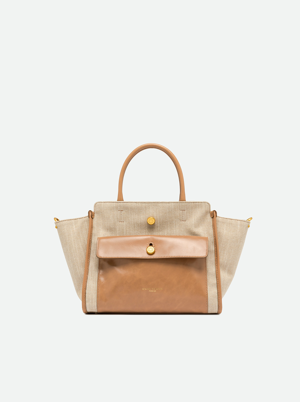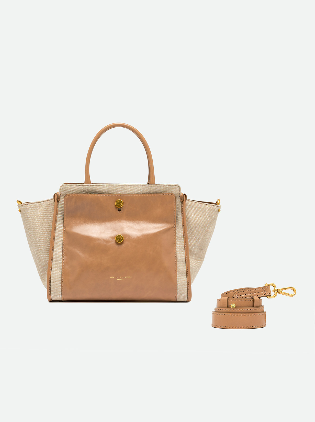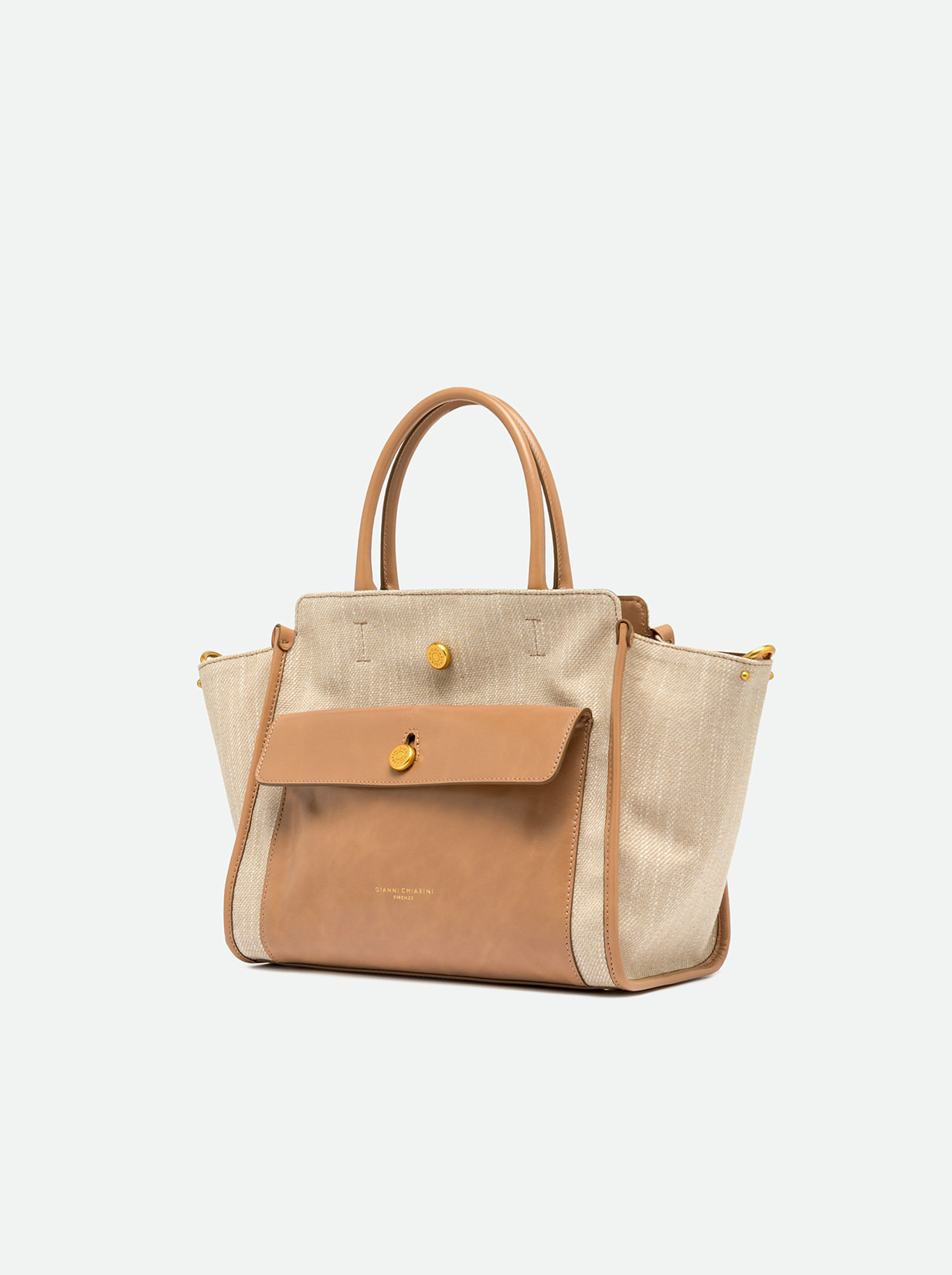 Cher by Gianni Chiarini Firenze is modern and versatile, perfect for bold, on-the-go women thanks to its roomy design and functionality. Made from durable, lightweight denim-effect fabric, enriched with metallic details for added personality. It features two leather handles for hand carry and an adjustable, removable strap for cross-body wear. Size: 29x24x13 cm.