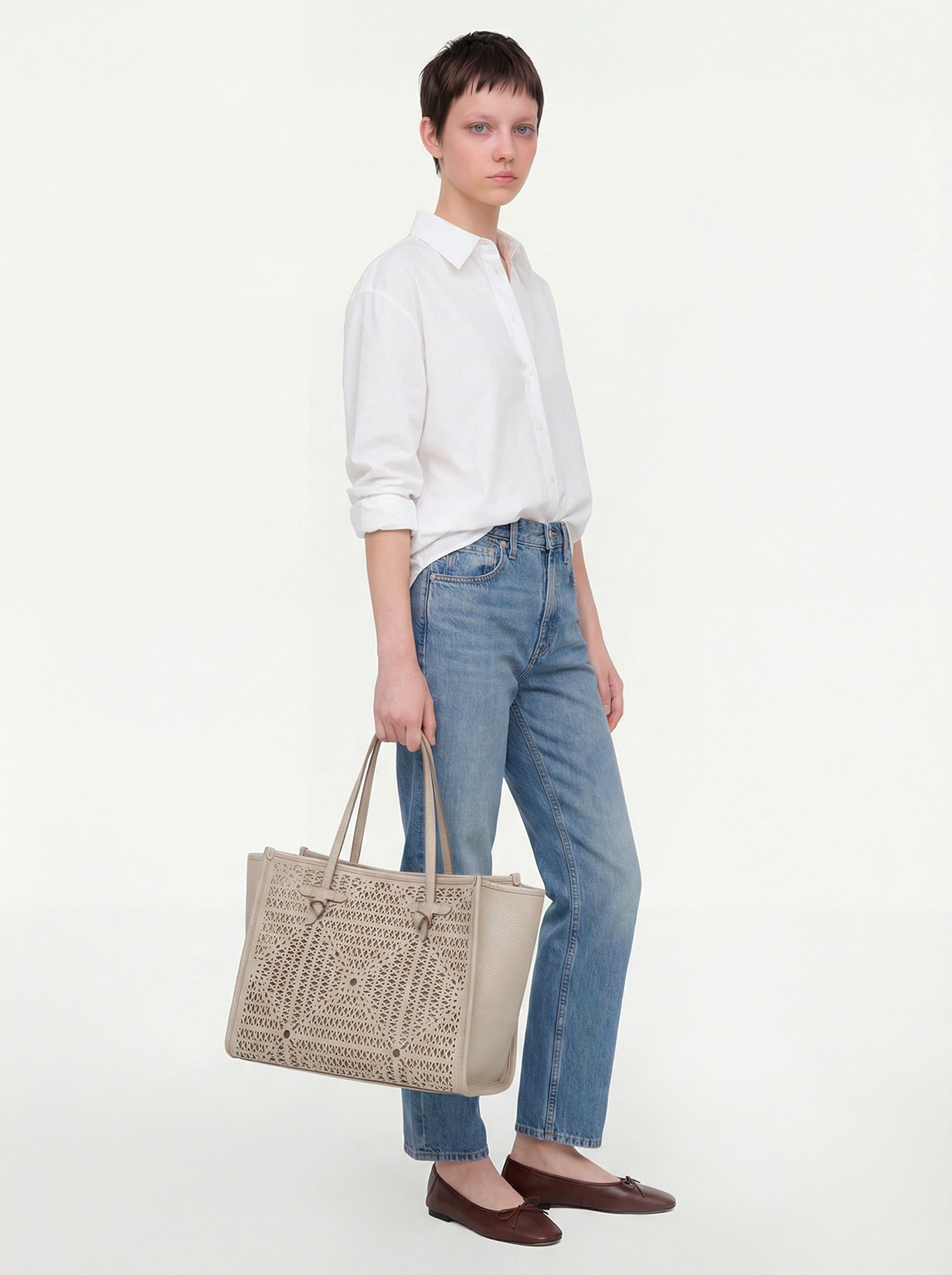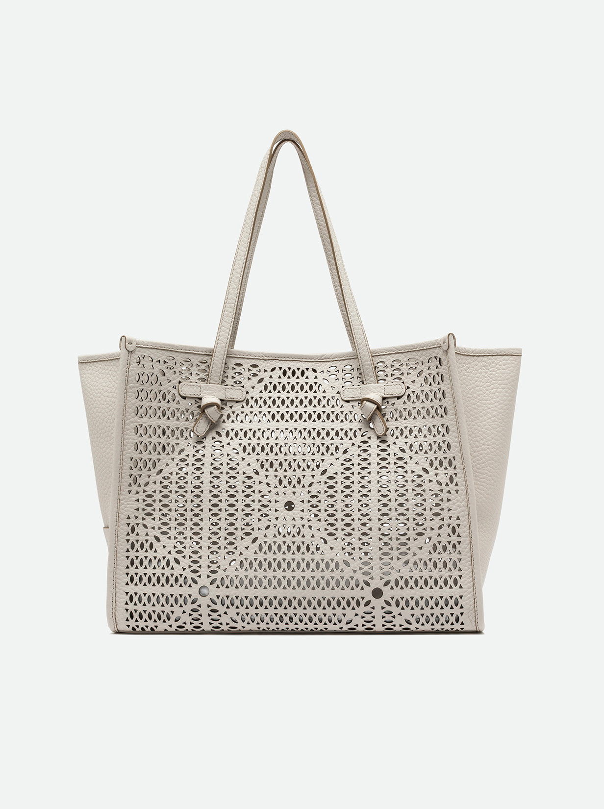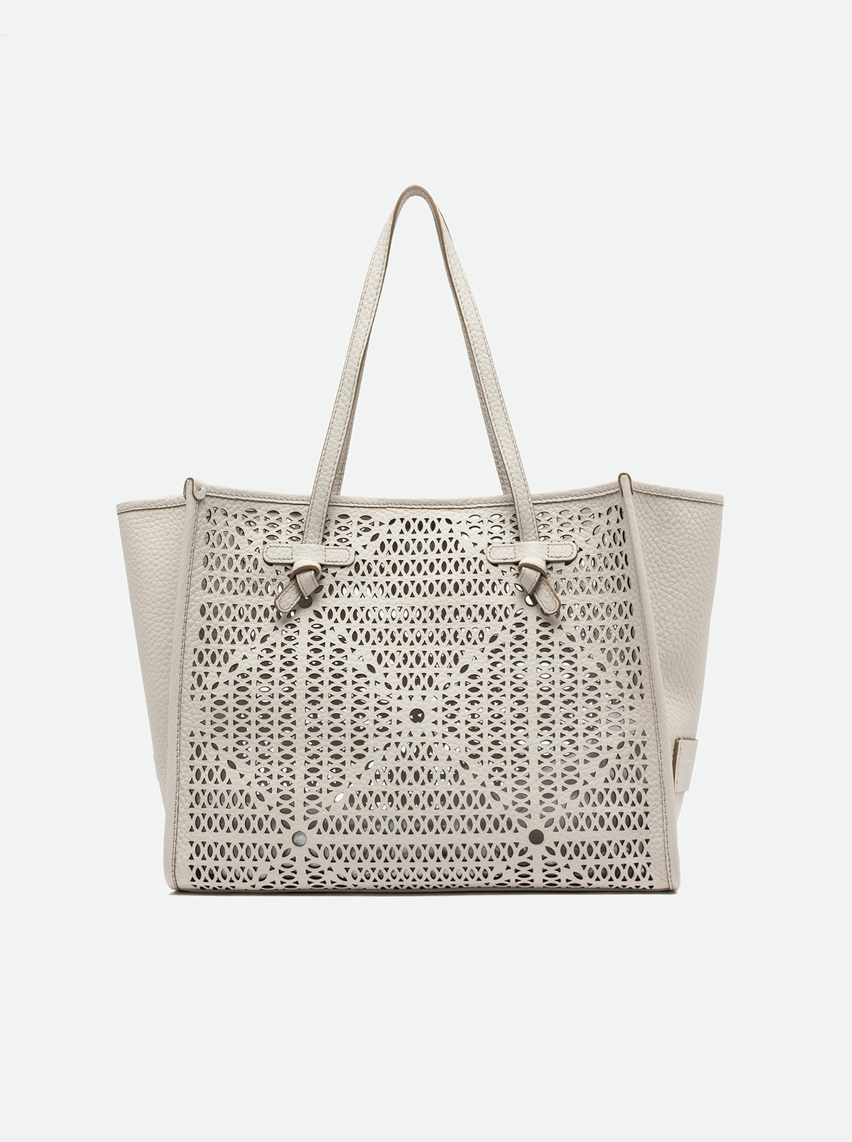 Made of bubble double leather, the Marcella shopping bag by Gianni Chiarini Firenze is embellished with a perforated design that gives it a unique and recognizable look. Perfect for summer days in the city or on vacation, it features leather handles and a convenient magnetic clasp closure, ideal for everyday use. The internal leather pouch adds practicality and versatility. Size: 38x31x16 cm.