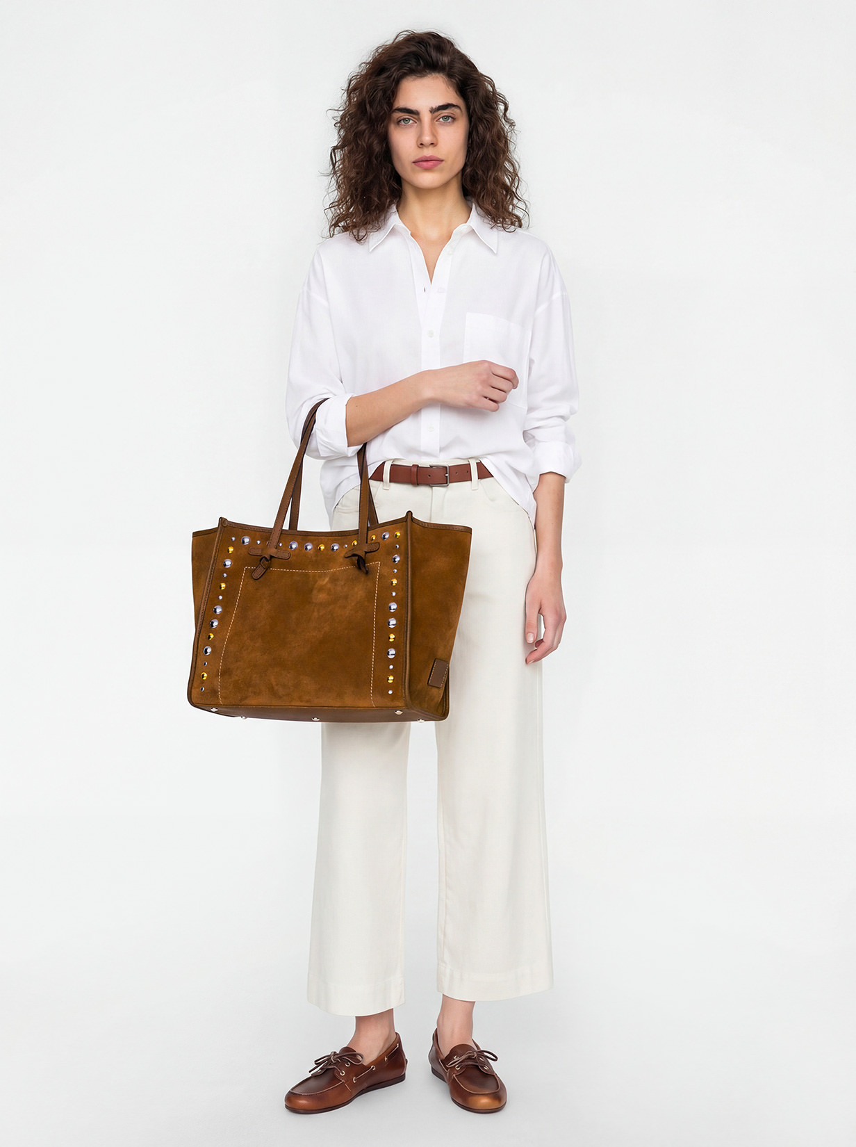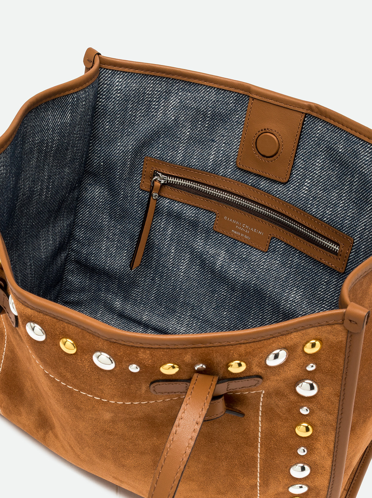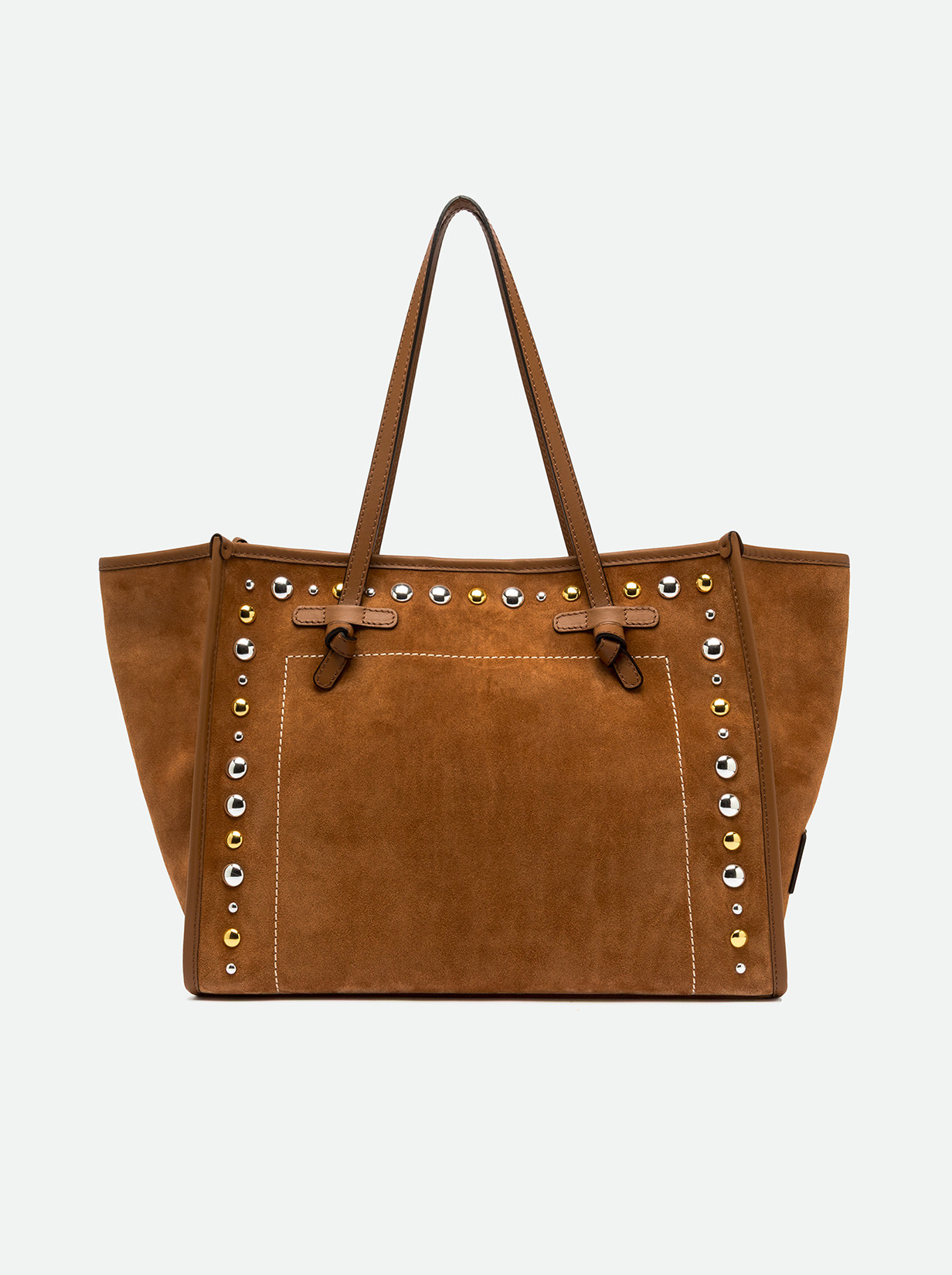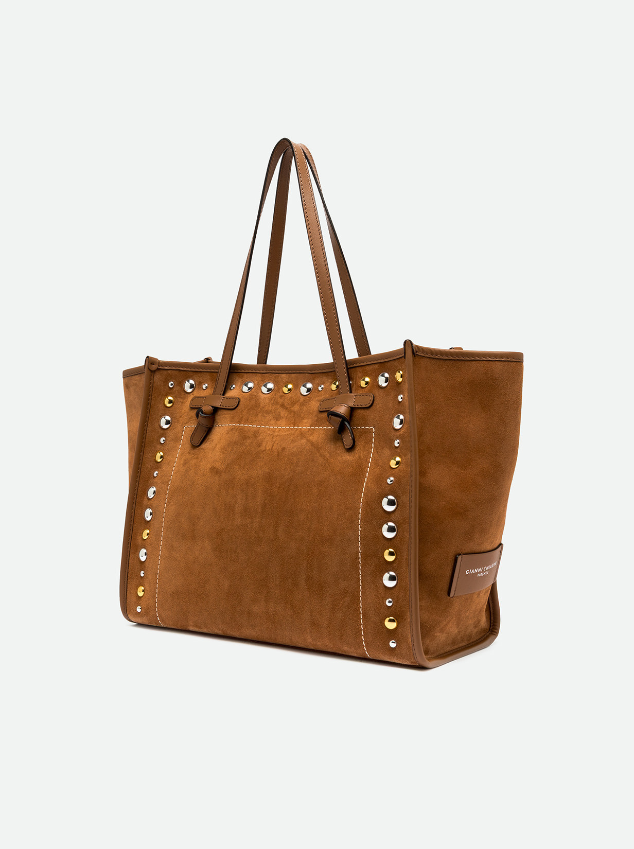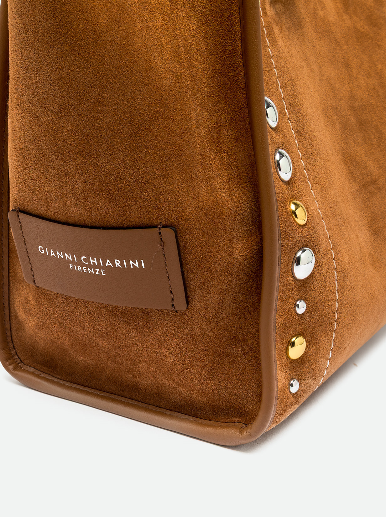 The Marcella shopping bag by Gianni Chiarini Firenze is a perfect balance of elegance and character. Made of suede leather, it features contrast stitching and metal studs that give the accessory a Western touch. Minimal design, glam leather profiles. Featuring leather handles and a convenient magnetic clasp closure, it's ideal for everyday use. The internal zip pocket makes it extremely practical and versatile. Size: 38x31x16 cm.