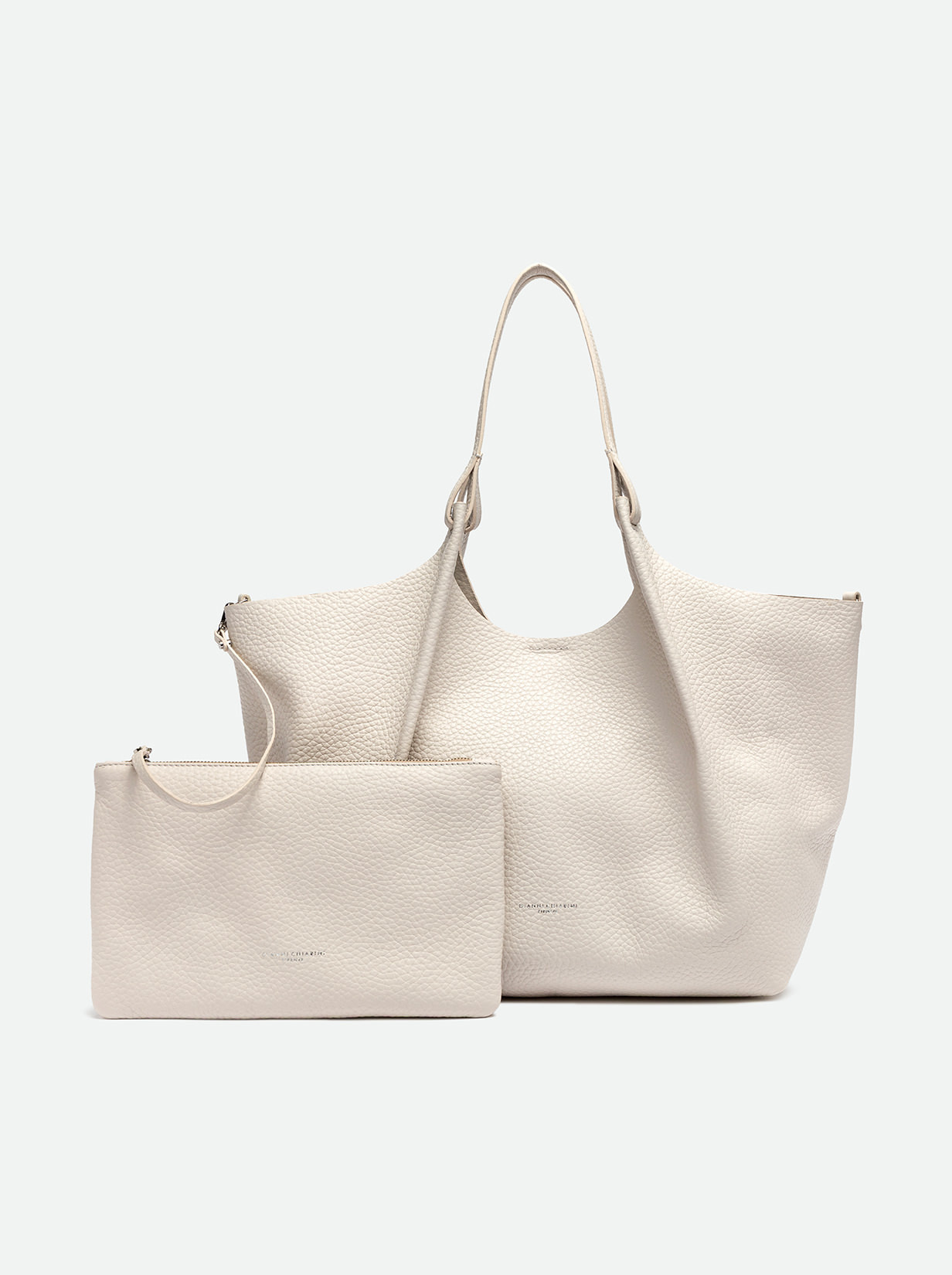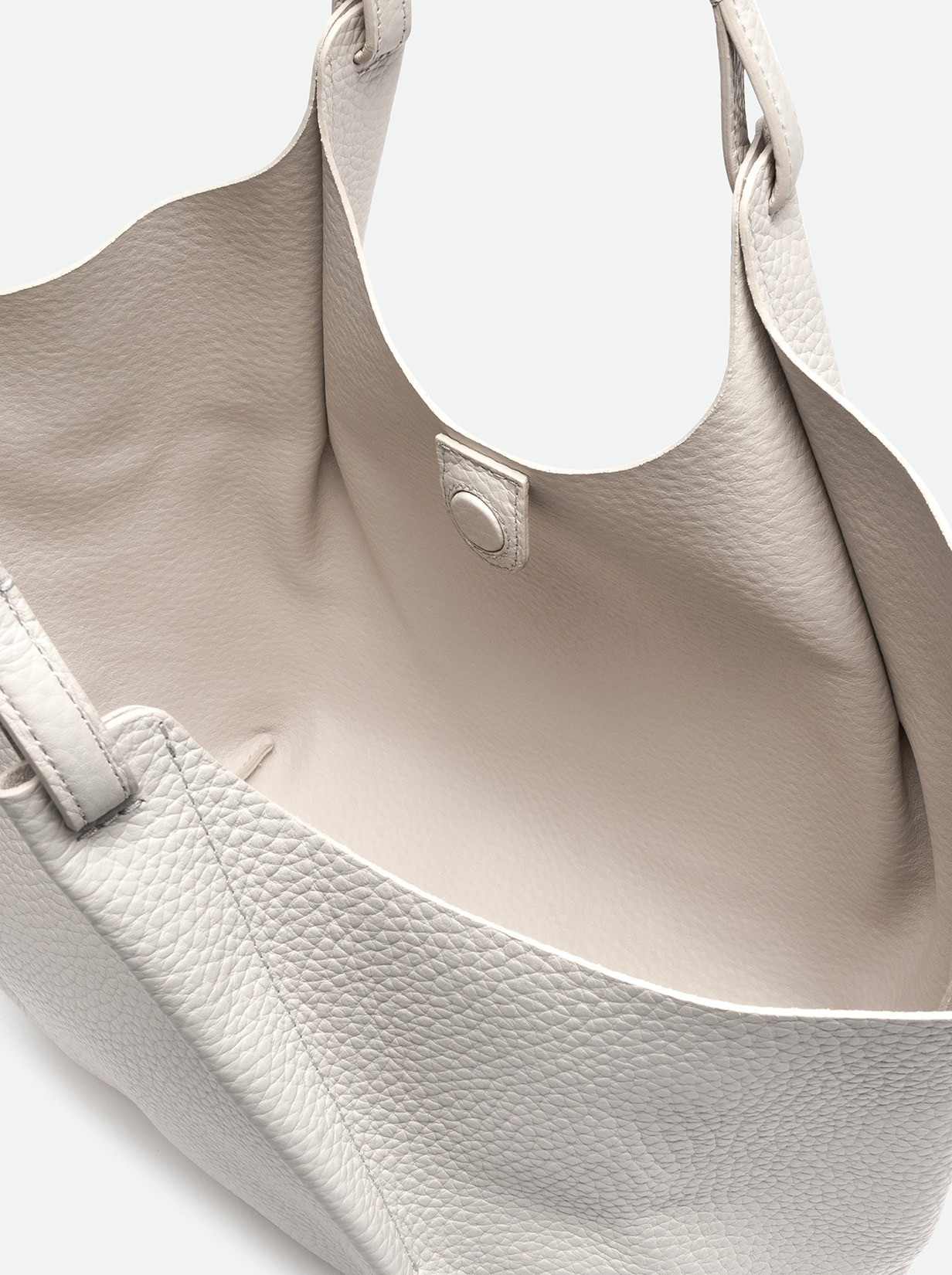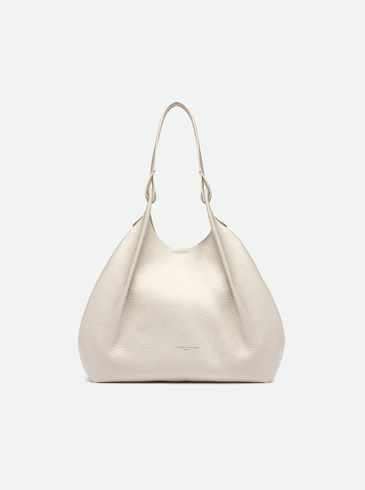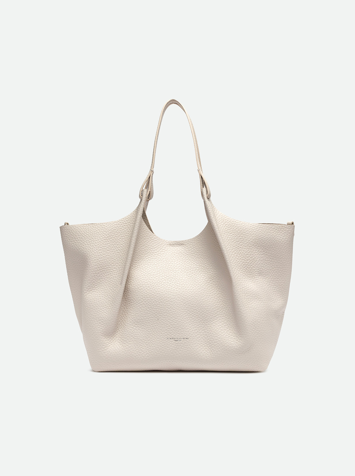 The iconic Dua bag, crafted from double bubble leather, stands out for its unique texture. It features an unlined single compartment, top profiles in hammered leather and color matching double handles. Practical and essential, it is perfect to stylishly enhance any look. It can be carried as a handbag at the shoulder. Size: 34x38x16 cm.