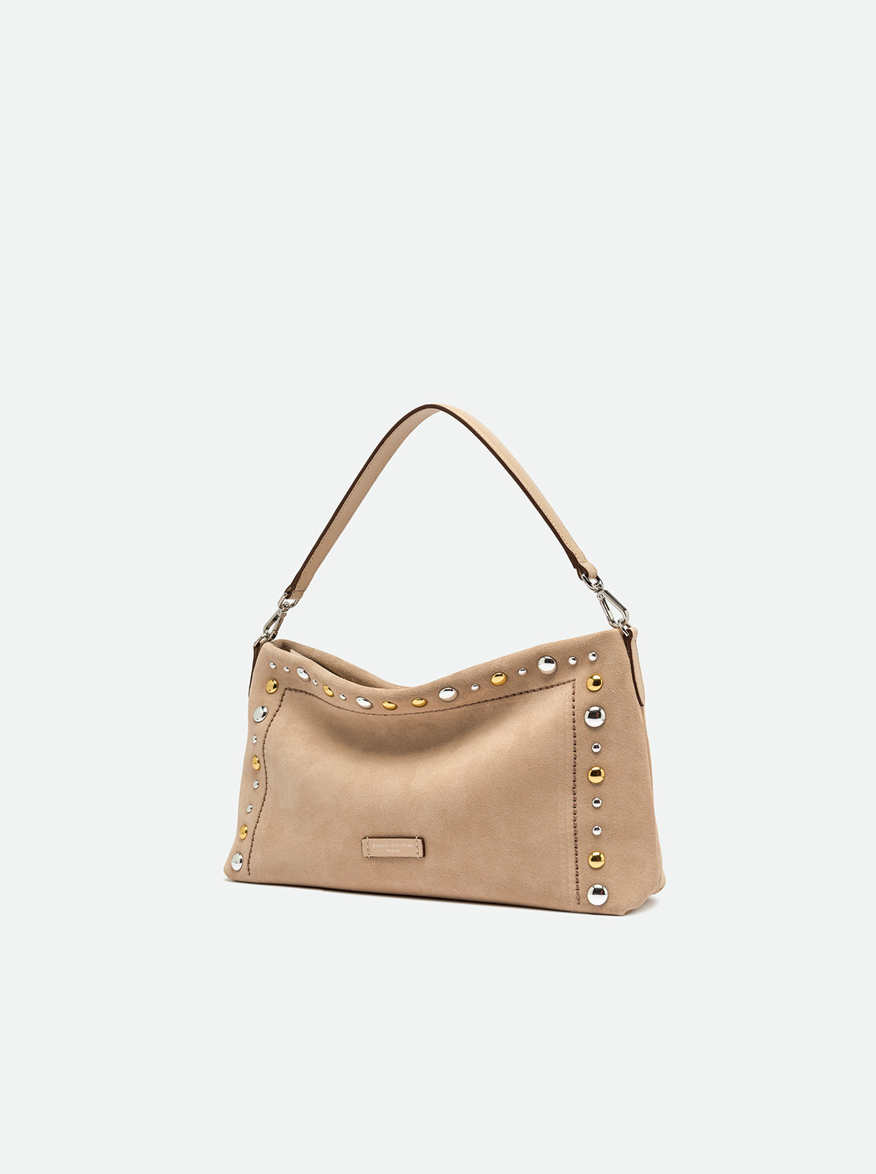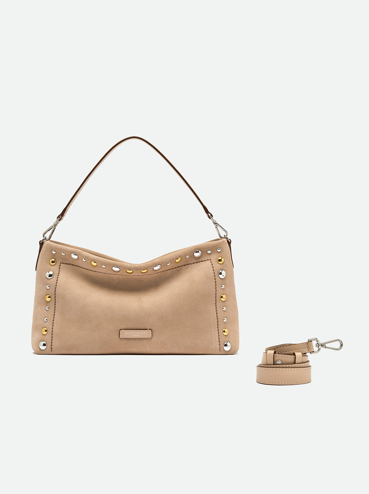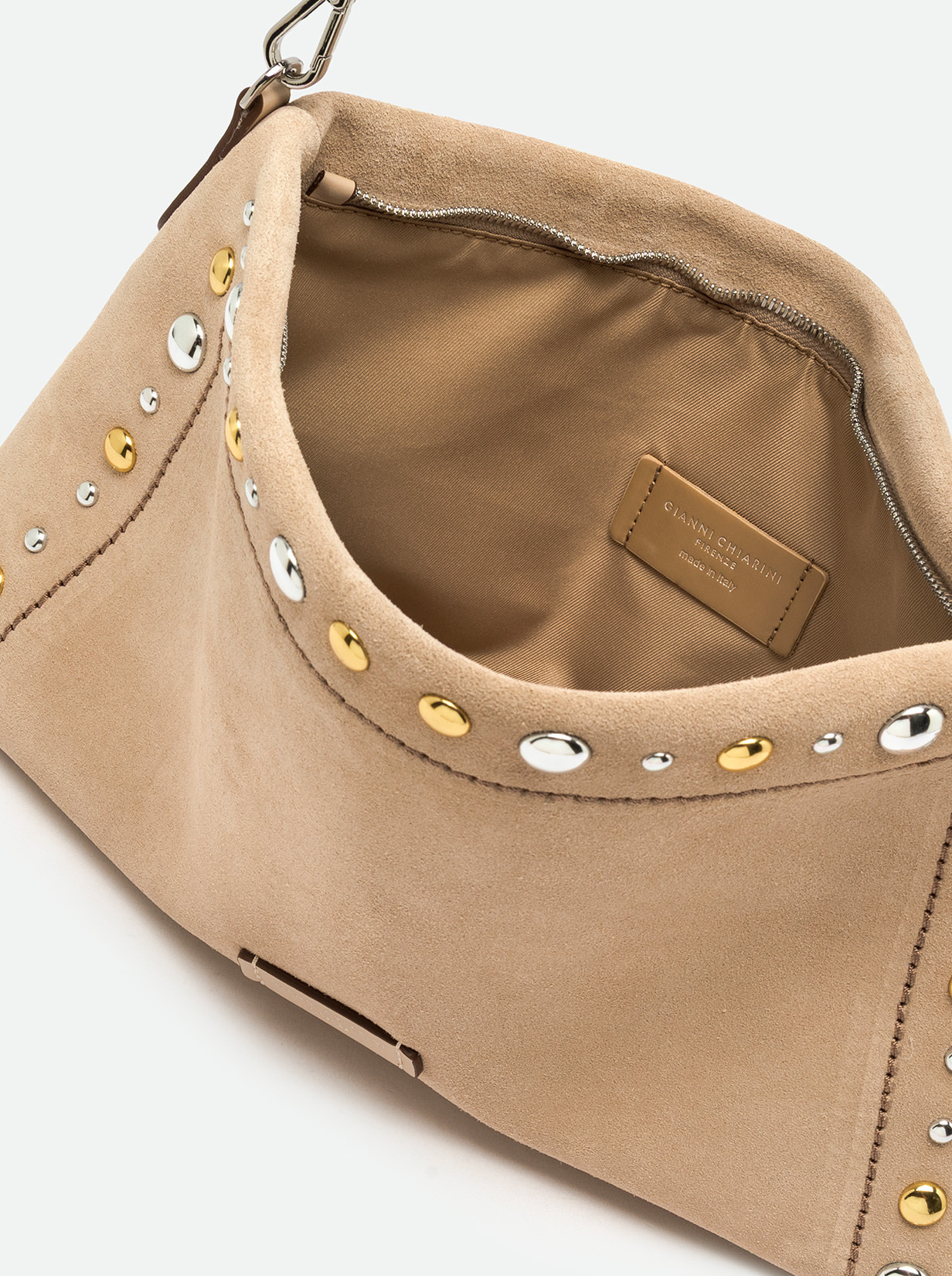 Elisa by Gianni Chiarini Firenze is the perfect everyday bag, featuring a soft, elongated silhouette in suede. Western-inspired topstitching and metal studs give it a bold personality, while the zip closure and adjustable leather strap offer versatility, wear it on the shoulder or cross-body. Ideal for those seeking both style and practicality in a compact design. Size: 29x17x7 cm.