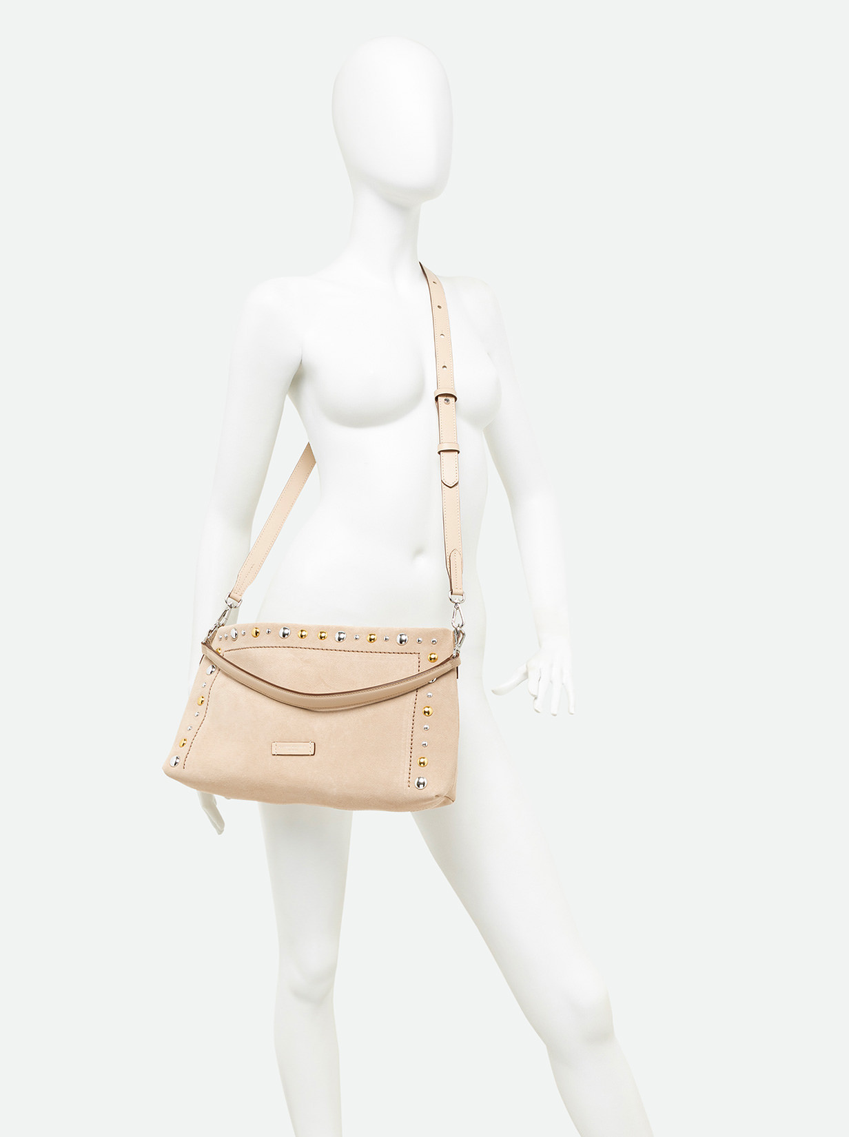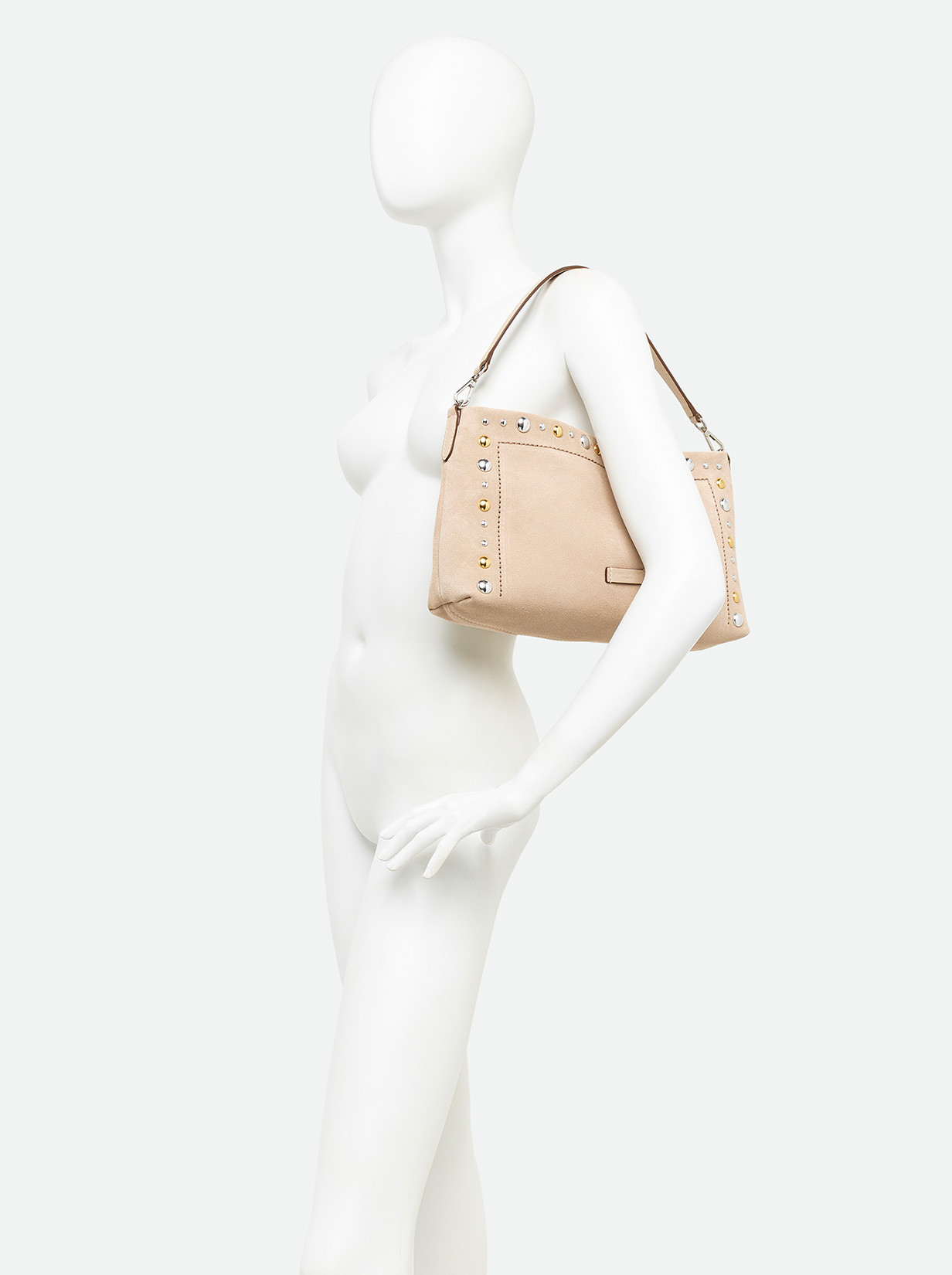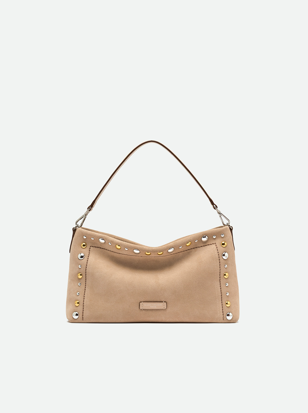 Elisa by Gianni Chiarini Firenze is the perfect everyday bag, featuring a soft, elongated silhouette in suede. Western-inspired topstitching and metal studs give it a bold personality, while the zip closure and adjustable leather strap offer versatility, wear it on the shoulder or cross-body. Ideal for those seeking both style and practicality in a compact design. Size: 29x17x7 cm.