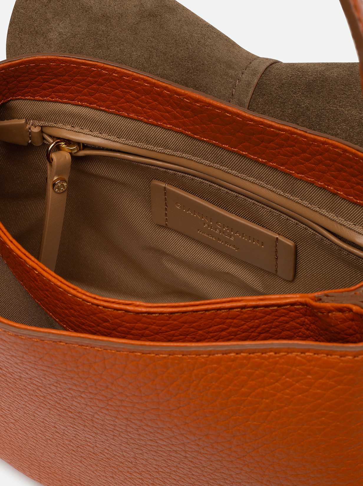 The iconic Helena Round Gianni Chiarini Firenze bag in maxi grain leather boasts a structured design with a contemporary, glam appeal. Thanks to the shoulder straps it is equipped with, it can be worn in two different ways. Practical and organized, it features a double interior compartment and a concealed pocket, also on the back of the bag. Size: 26x21x9 cm.