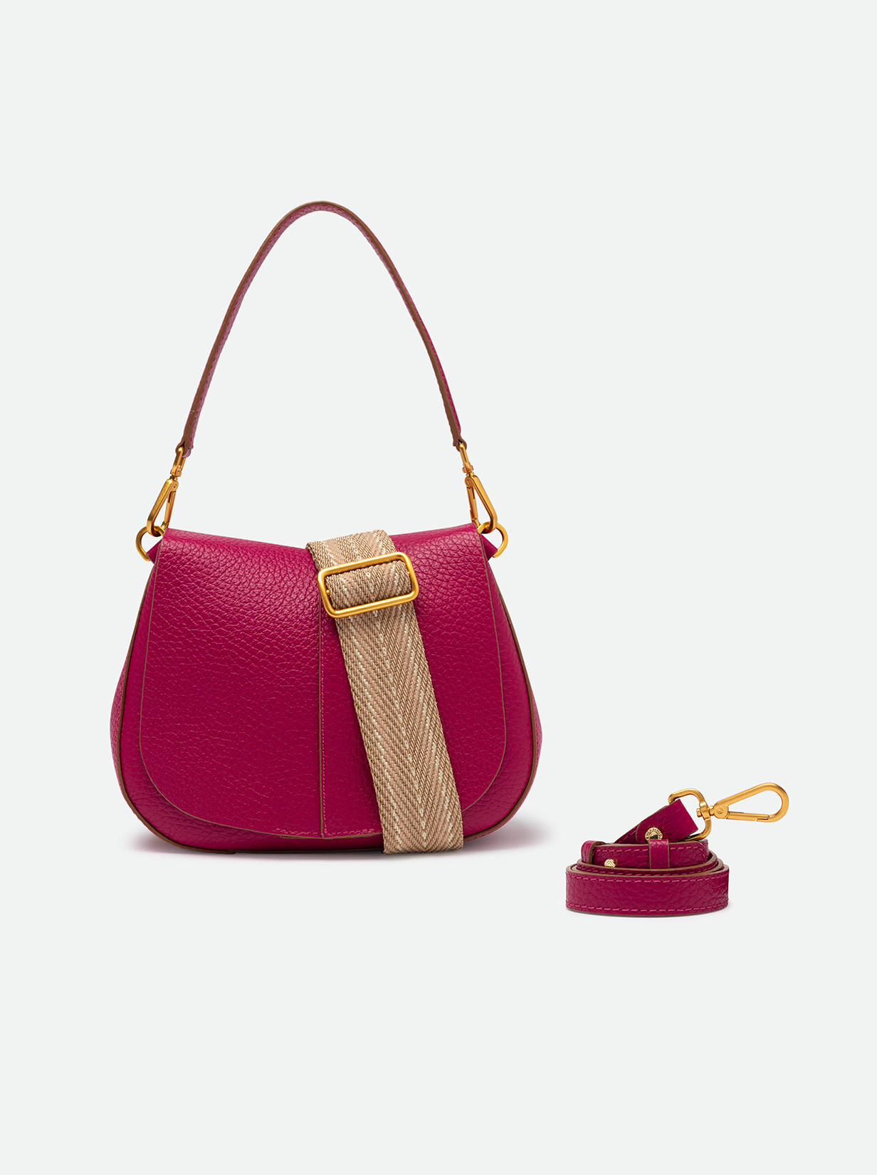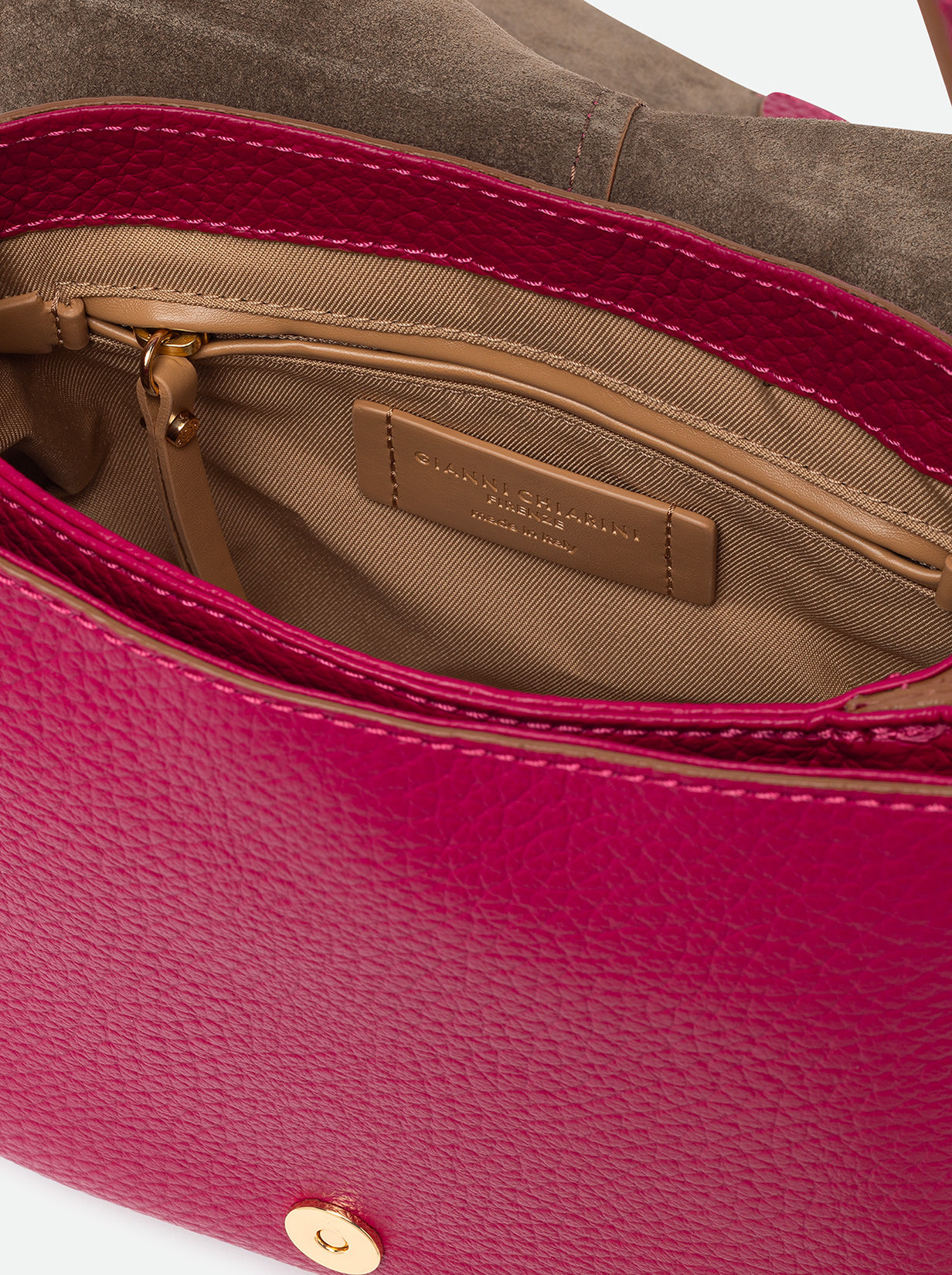 The iconic Helena Round Gianni Chiarini Firenze bag in maxi grain leather boasts a structured design with a contemporary, glam appeal. Thanks to the shoulder straps it is equipped with, it can be worn in two different ways. Practical and organized, it features a double interior compartment and a concealed pocket, also on the back of the bag. Size: 26x21x9 cm.