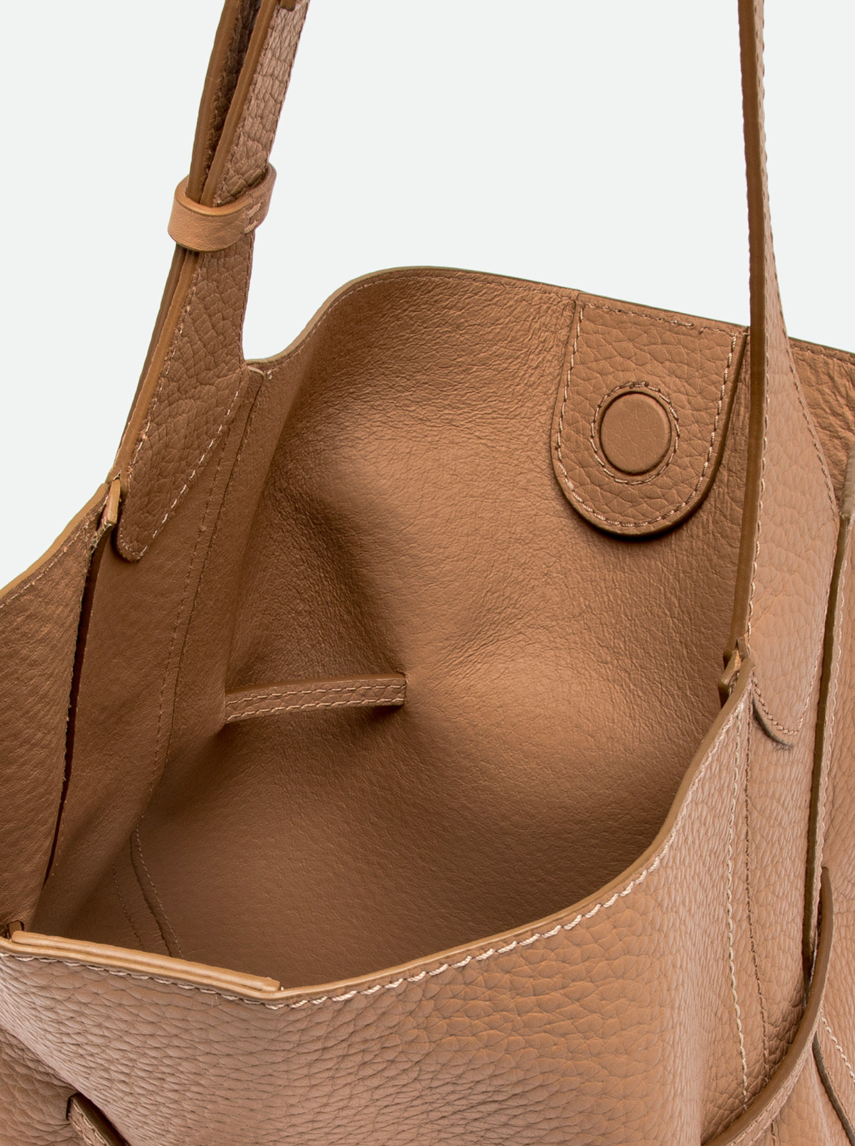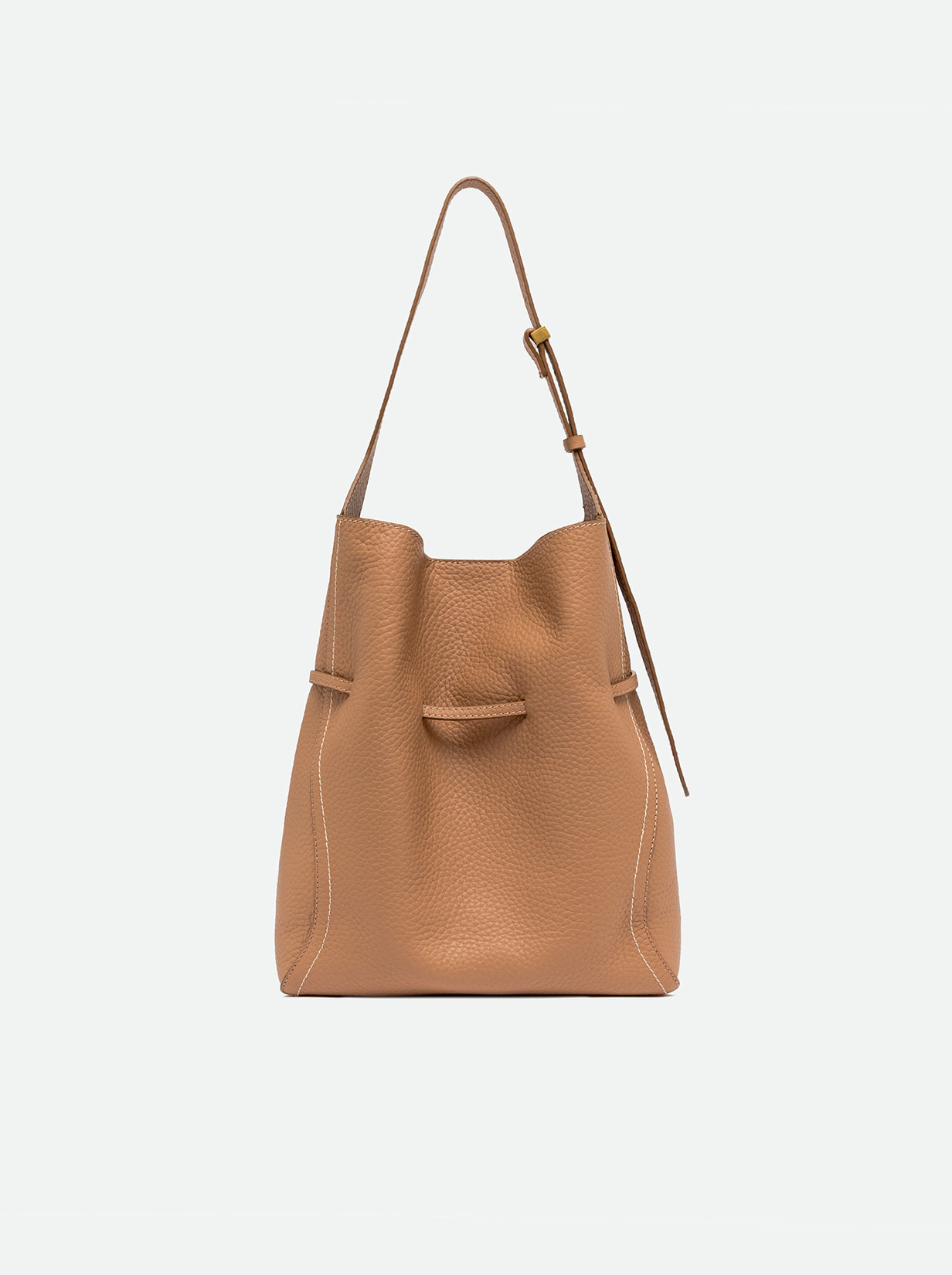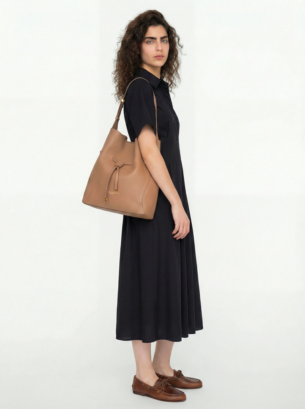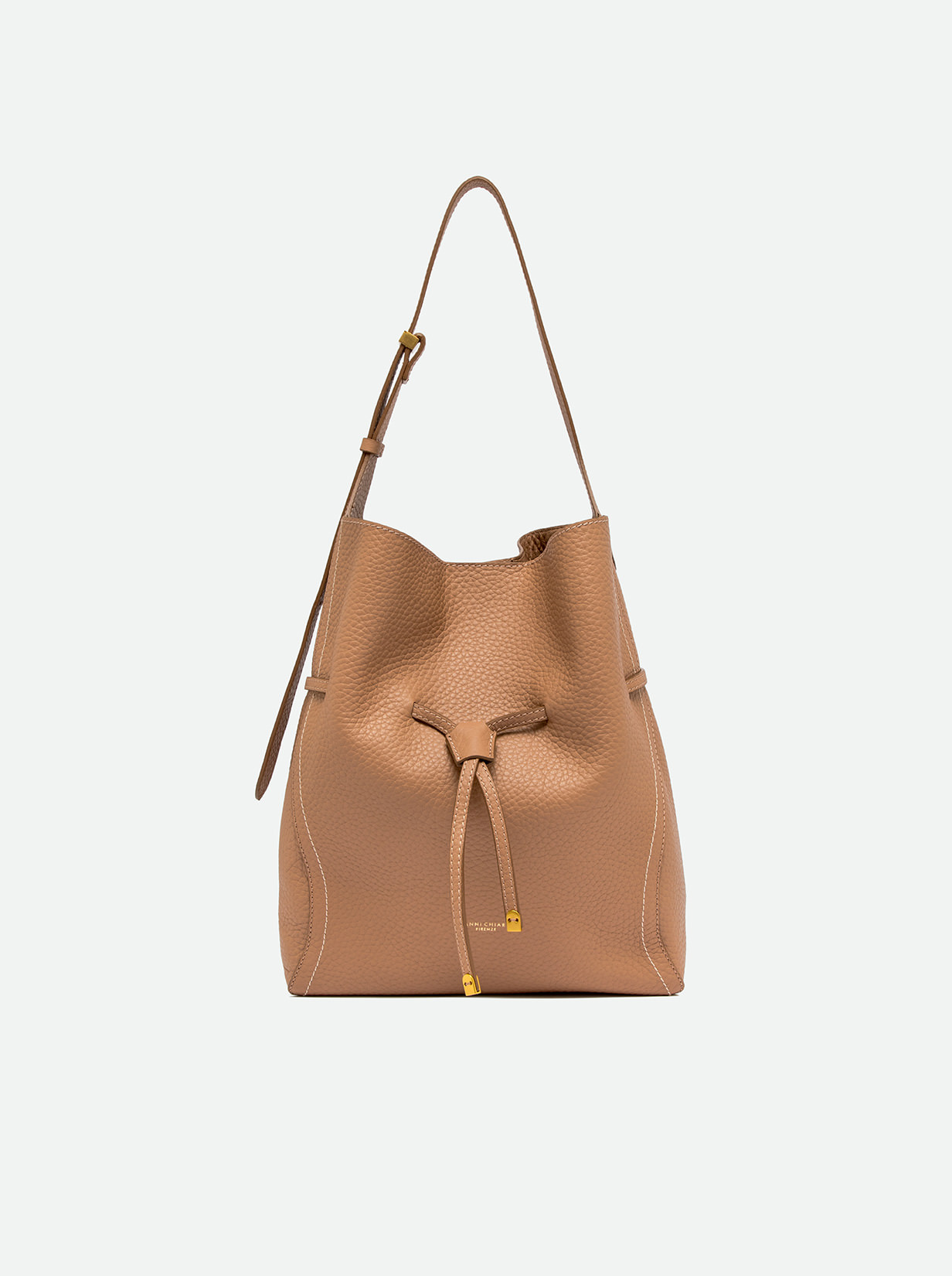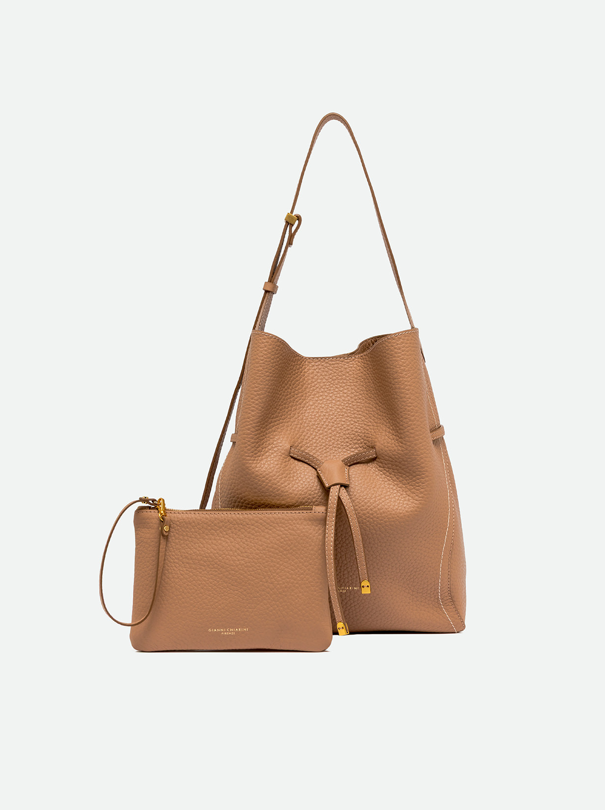 Sienna is the new bag by Gianni Chiarini Firenze, defined by a soft and feminine silhouette, perfect for completing both casual and more refined looks with style. Made of maxi grain double leather, it’s finished with contrasting stitching that highlights its lines. Features a single compartment with magnetic closure and is embellished with iconic metal details like the twin logoed loop and metal tips. Equipped with a practical clutch with zipper closure. Size: 30x34x11 cm.