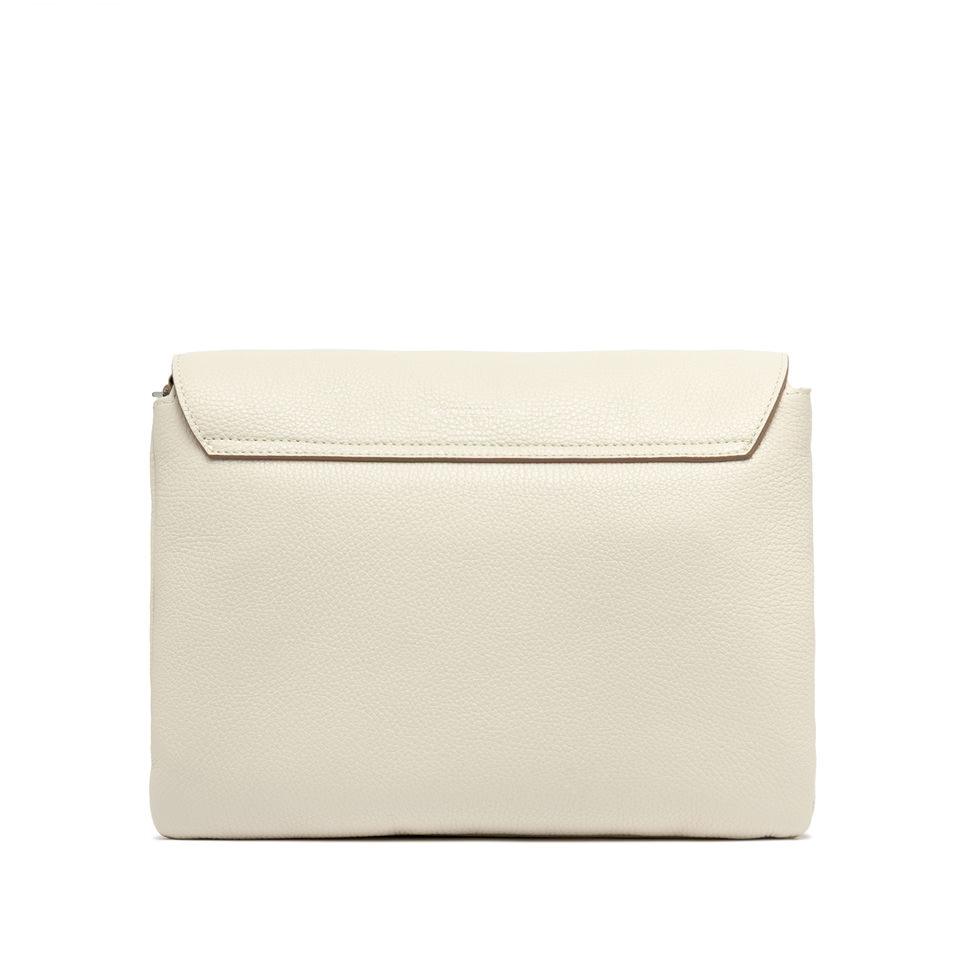 Wearable as a handbag or cross-body by attaching the thin shoulder strap in leather, Three bag by Gianni Chiarini Firenze comes in premium quality hammered leather. Youthful and playful, its innovative design features contrasting zippers, a top flap, and a magnetic button closure. Perfect for casual outfits, but also for elegant evenings. Size: 31x24x7 cm.