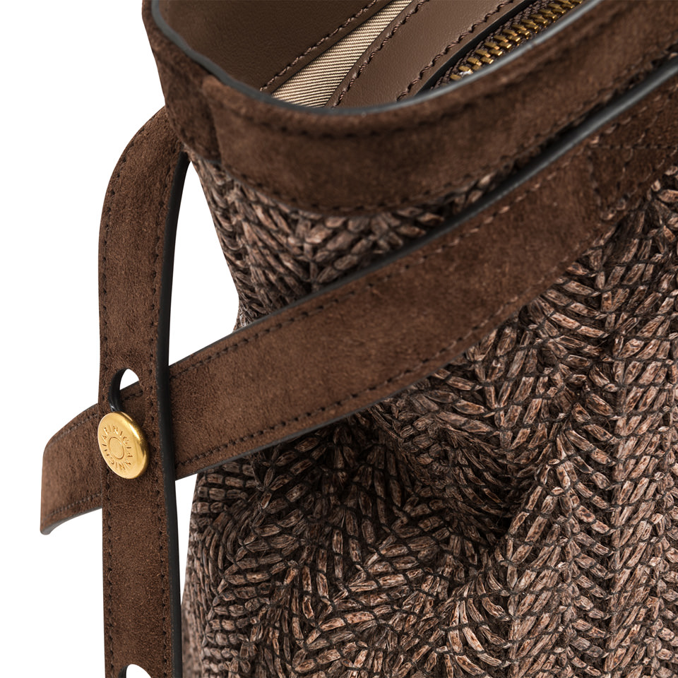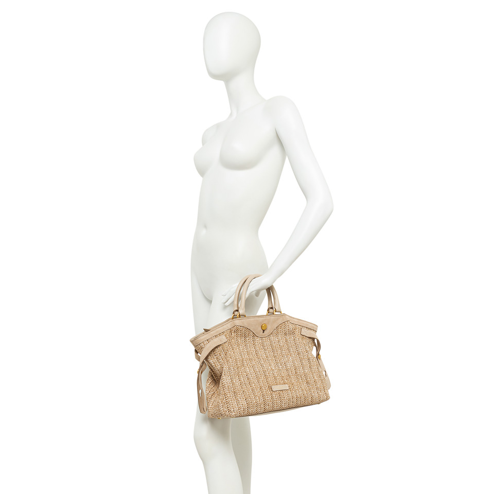Claudette is an practical, versatile bag crafted from woven straw with suede trim, it channels rustic-chic charm while remaining perfectly functional. The metal details add shine, while the two leather handles and the adjustable strap offer double portability: by hand and cross-body. Perfect for an elegant, functional summer look. Size: 33x24x14 cm.