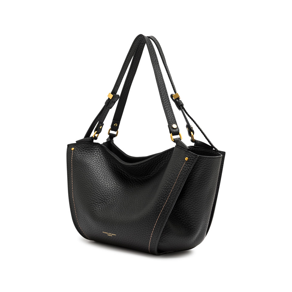 Bloom is a style icon signed by Gianni Chiarini Firenze. Spacious and functional, it stands out for its elegant tulip silhouette. Made of maxi grain double leather, it is enhanced by a contrasting stitch that highlights its lines. Metal details complete the design with a touch of shine, making it the perfect accessory for any occasion. Size: 43x25x14 cm.