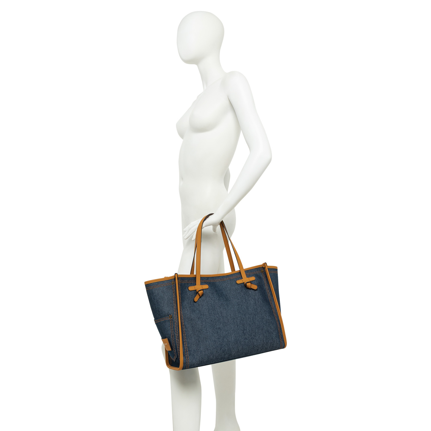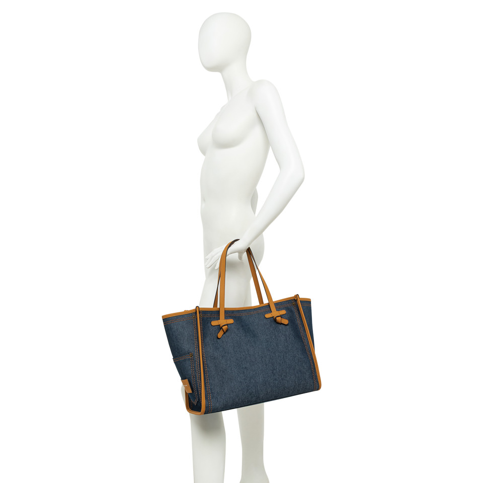 The Marcella shopping bag by Gianni Chiarini Firenze is made of denim-effect fabric, light and durable, perfect for everyday use. The leather trim and handles add a touch of elegance to the casual design. Featuring a practical magnetic clasp closure and a color matching denim pouch, it’s a versatile accessory that completes even the simplest looks. Size: 38x31x16 cm.