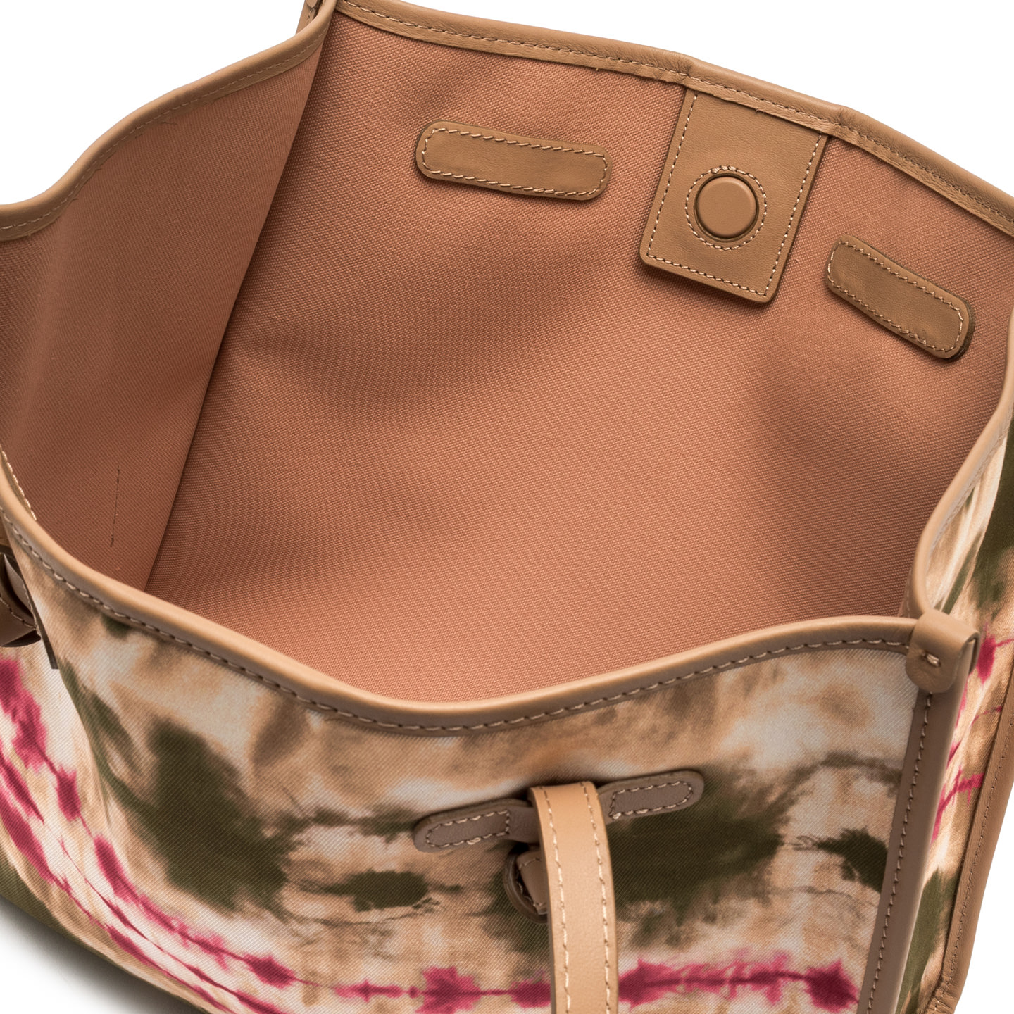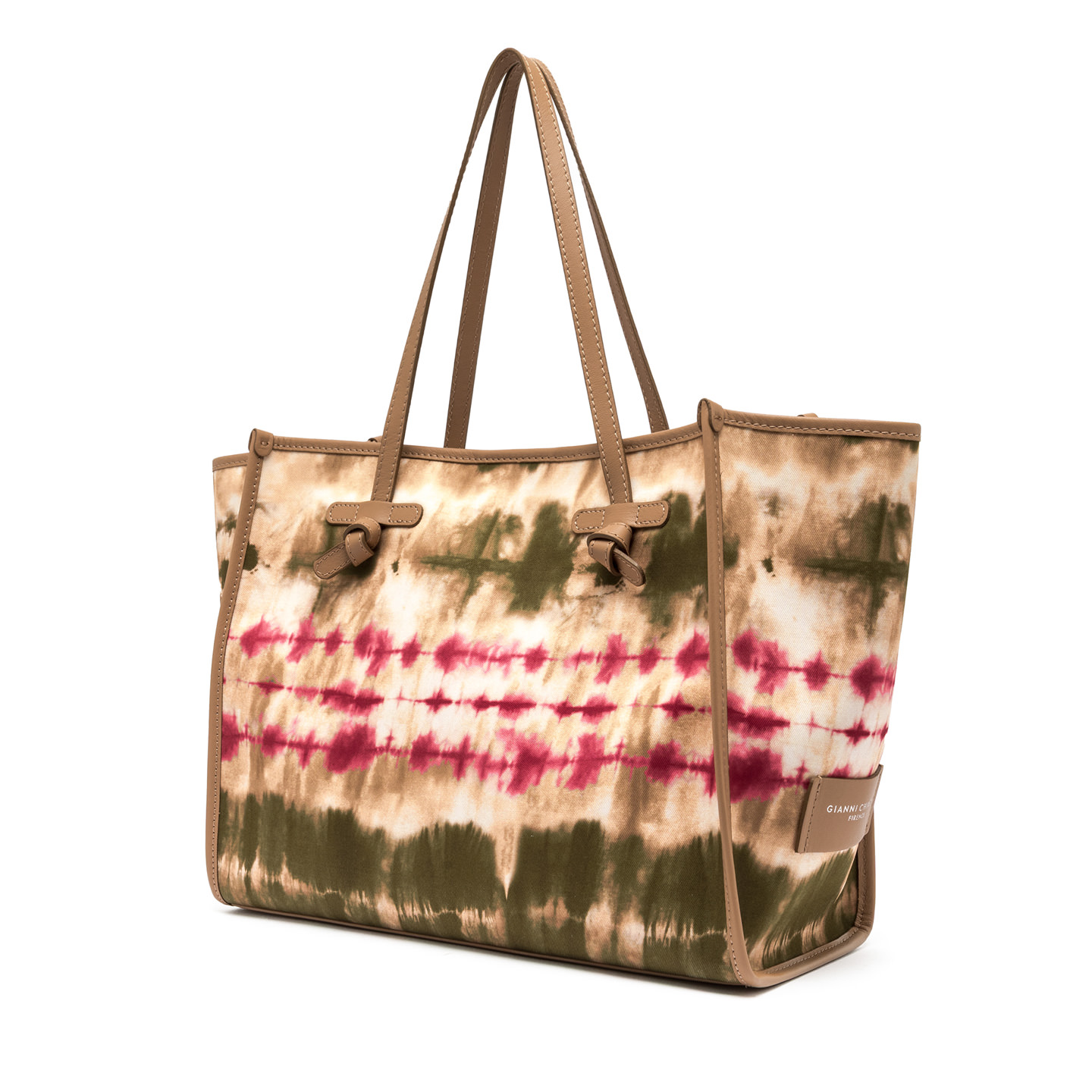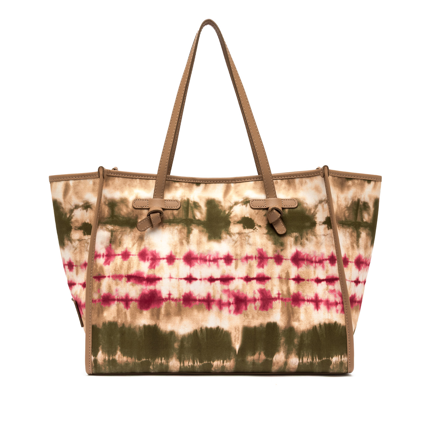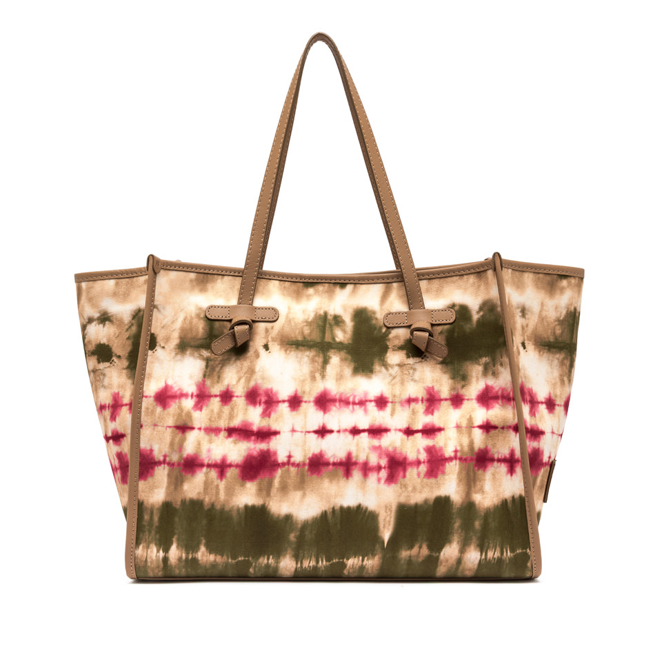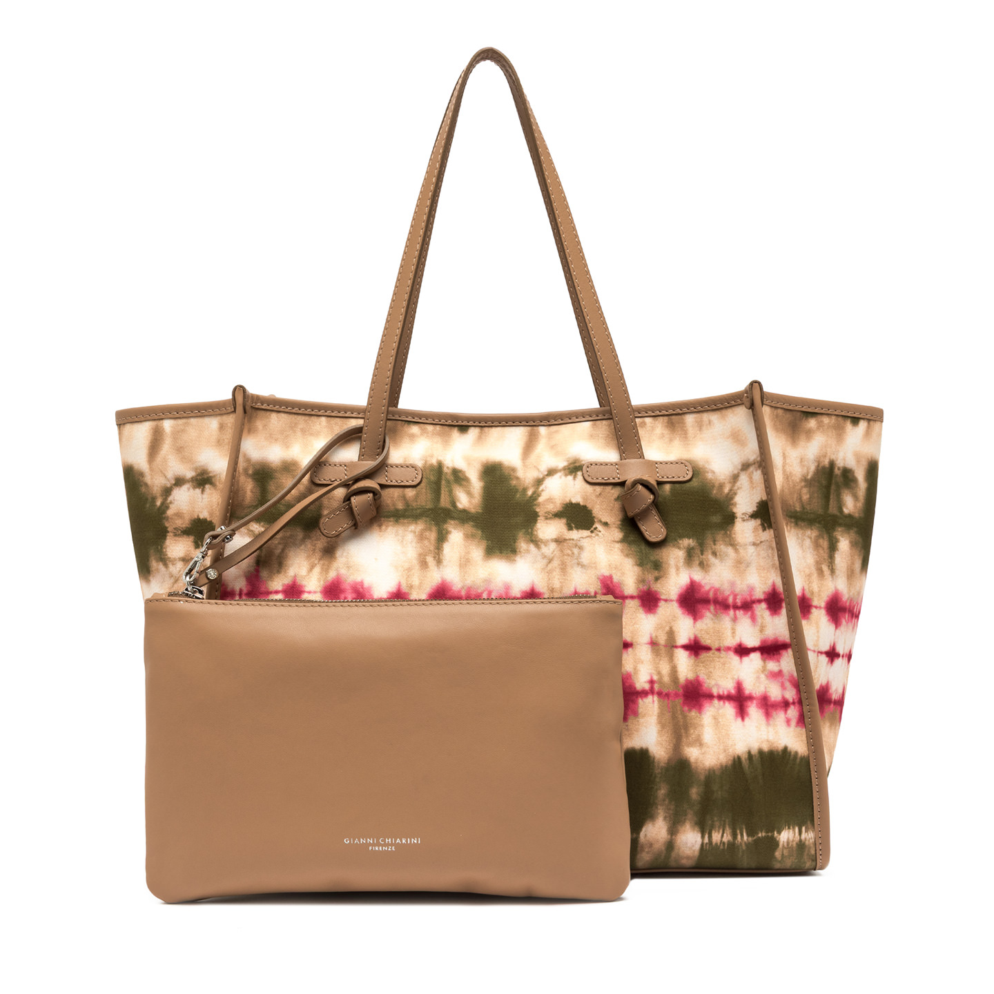 The Marcella shopping bag by Gianni Chiarini Firenze is made of semi-gloss fabric with a tie-dye print. The minimal design is enriched with elegant leather trim, while the tone-on-tone handles and magnetic clasp closure make it perfect for everyday life. The contrasting inner lining and matching leather pouch complete this iconic accessory, designed to bring energy to every look. Size: 38x31x16 cm.