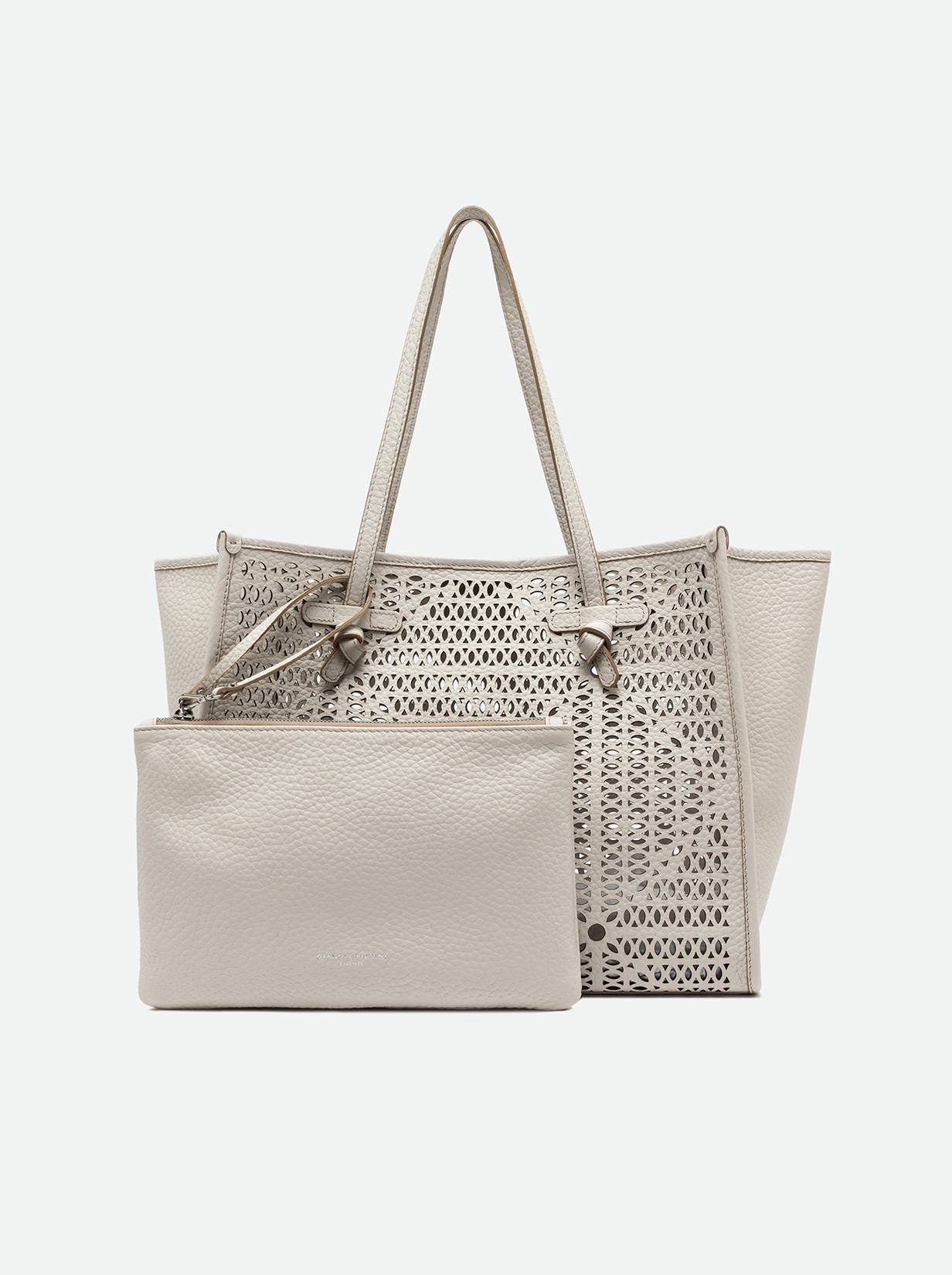 Hecha de piel bubble double, la bolsa de compras Marcella by Gianni Chiarini Firenze está adornada con un decorado perforado que le confiere un aspecto único y reconocible. Perfecta para los días de verano en la ciudad y de vacaciones, cuenta con asas de piel y un cierre magnético cómodo, ideal para el uso diario. La pochette interna de piel añade practicidad y versatilidad. Dimensiones: 38x31x16 cm.